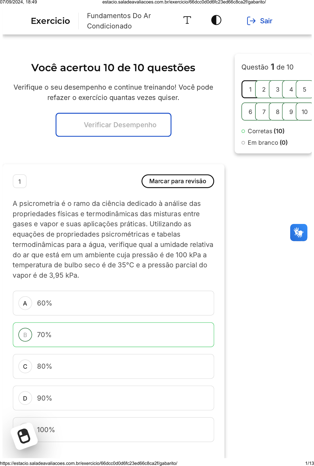 <p>Você acertou 10 de 10 questões</p><p>Verifique o seu desempenho e continue treinando! Você pode</p><p>refazer o exercício quantas vezes quiser.</p><p>Verificar Desempenho</p><p>A</p><p>B</p><p>C</p><p>D</p><p>E</p><p>1 Marcar para revisão</p><p>A psicrometria é o ramo da ciência dedicado à análise das</p><p>propriedades físicas e termodinâmicas das misturas entre</p><p>gases e vapor e suas aplicações práticas. Utilizando as</p><p>equações de propriedades psicrométricas e tabelas</p><p>termodinâmicas para a água, verifique qual a umidade relativa</p><p>do ar que está em um ambiente cuja pressão é de 100 kPa a</p><p>temperatura de bulbo seco é de 35°C e a pressão parcial do</p><p>vapor é de 3,95 kPa.</p><p>60%</p><p>70%</p><p>80%</p><p>90%</p><p>100%</p><p>Questão 1 de 10</p><p>Corretas �10�</p><p>Em branco �0�</p><p>1 2 3 4 5</p><p>6 7 8 9 10</p><p>Exercicio</p><p>Fundamentos Do Ar</p><p>Condicionado</p><p>Sair</p><p>07/09/2024, 18:49 estacio.saladeavaliacoes.com.br/exercicio/66dcc0d0d6fc23ed66c8ca2f/gabarito/</p><p>https://estacio.saladeavaliacoes.com.br/exercicio/66dcc0d0d6fc23ed66c8ca2f/gabarito/ 1/13</p><p>A</p><p>B</p><p>C</p><p>D</p><p>E</p><p>Resposta correta</p><p>Parabéns, você selecionou a alternativa correta.</p><p>Confira o gabarito comentado!</p><p>Gabarito Comentado</p><p>Entrando em uma tabela termodinâmica verifica-se que a</p><p>pressão de saturação a 35°C é igual a 5,628 kPa e</p><p>aplicando a equação para umidade relativa:</p><p>2 Marcar para revisão</p><p>Ar entra em uma serpentina de resfriamento e</p><p>desumidificação à 25°C e 50% de umidade relativa de onde</p><p>sai a 13°C e 90% de UR. Utilizando uma carta psicrométrica</p><p>para o nível do mar, defina qual a quantidade de condensado</p><p>que sai do processo se o fluxo de ar é de 5 kg/s:</p><p>12 g/s</p><p>8,5 g/s</p><p>7,5 g/s</p><p>6,5 g/s</p><p>5,5 g/s</p><p>07/09/2024, 18:49 estacio.saladeavaliacoes.com.br/exercicio/66dcc0d0d6fc23ed66c8ca2f/gabarito/</p><p>https://estacio.saladeavaliacoes.com.br/exercicio/66dcc0d0d6fc23ed66c8ca2f/gabarito/ 2/13</p><p>Resposta correta</p><p>Parabéns, você selecionou a alternativa correta.</p><p>Confira o gabarito comentado!</p><p>Gabarito Comentado</p><p>Plotando os valores em uma carta psicrométrica</p><p>encontramos os seguintes resultados:</p><p>Usando o balanço de massa já apresentado</p><p>anteriormente,</p><p>mL = m ∙ (ω - ω )</p><p>Substituindo os valores temos:</p><p>m = 5 ∙ �9,9 � 8,4�</p><p>m = 7,5 g/s</p><p>ar 1 2</p><p>L</p><p>L</p><p>3 Marcar para revisão</p><p>Um equipamento de ar condicionado resfria o ar do ambiente</p><p>passando o mesmo por uma serpentina de resfriamento e</p><p>desumidificação. O ar antes de passar pela ACJ está a 27°C</p><p>com UR de 60% de onde saí a 19°C e UR de 90%. Utilizando</p><p>a carta psicrométrica para a pressão de 101,325 kPa e tabela</p><p>termodinâmica para a água, determine qual a quantidade de</p><p>calor retirada pelo equipamento para uma vazão de 1 m /s</p><p>sendo a massa específica do ar neste local de 1,20 kg/m :</p><p>3</p><p>3</p><p>07/09/2024, 18:49 estacio.saladeavaliacoes.com.br/exercicio/66dcc0d0d6fc23ed66c8ca2f/gabarito/</p><p>https://estacio.saladeavaliacoes.com.br/exercicio/66dcc0d0d6fc23ed66c8ca2f/gabarito/ 3/13</p><p>A</p><p>B</p><p>C</p><p>D</p><p>E</p><p>13,2 kW</p><p>12,1 kW</p><p>8,5 kW</p><p>25 kW</p><p>10 kW</p><p>Resposta correta</p><p>Parabéns, você selecionou a alternativa correta.</p><p>Confira o gabarito comentado!</p><p>Gabarito Comentado</p><p>Plotando os valores de entrada na carta psicrométrica,</p><p>encontramos os seguintes valores de saída:</p><p>07/09/2024, 18:49 estacio.saladeavaliacoes.com.br/exercicio/66dcc0d0d6fc23ed66c8ca2f/gabarito/</p><p>https://estacio.saladeavaliacoes.com.br/exercicio/66dcc0d0d6fc23ed66c8ca2f/gabarito/ 4/13</p><p>A</p><p>B</p><p>C</p><p>D</p><p>E</p><p>4 Marcar para revisão</p><p>O ar entra em um equipamento de resfriamento evaporativo a</p><p>32°C e 30% de umidade relativa �UR�, de onde sai a 22°C.</p><p>Considerando que o equipamento está instalado ao nível do</p><p>mar, ao analisar os dados em uma carta psicrométrica</p><p>adequada, concluímos que a umidade relativa na saída do</p><p>equipamento será igual a:</p><p>65%</p><p>70%</p><p>75%</p><p>80%</p><p>95%</p><p>Resposta correta</p><p>Parabéns, você selecionou a alternativa correta.</p><p>Confira o gabarito comentado!</p><p>07/09/2024, 18:49 estacio.saladeavaliacoes.com.br/exercicio/66dcc0d0d6fc23ed66c8ca2f/gabarito/</p><p>https://estacio.saladeavaliacoes.com.br/exercicio/66dcc0d0d6fc23ed66c8ca2f/gabarito/ 5/13</p><p>A</p><p>B</p><p>C</p><p>Gabarito Comentado</p><p>Para resolver essa questão, é necessário traçar os</p><p>valores na carta psicrométrica para o nível do mar. É</p><p>importante lembrar que, em um processo de resfriamento</p><p>evaporativo, a entalpia de entrada é igual à entalpia de</p><p>saída, caracterizando um processo adiabático. Ao</p><p>realizar essa análise, encontramos a seguinte situação:</p><p>Portanto, a umidade relativa na saída do equipamento é</p><p>de 80%, o que corresponde à alternativa D.</p><p>5 Marcar para revisão</p><p>William Cullen foi o primeiro a conseguir fabricar gelo de</p><p>forma artificial. Para este feito, ele reduziu a pressão de um</p><p>fluido armazenado em um recipiente que estava mergulhado</p><p>em um reservatório com água. Este fluido era o:</p><p>Metano.</p><p>Gasolina.</p><p>Álcool.</p><p>07/09/2024, 18:49 estacio.saladeavaliacoes.com.br/exercicio/66dcc0d0d6fc23ed66c8ca2f/gabarito/</p><p>https://estacio.saladeavaliacoes.com.br/exercicio/66dcc0d0d6fc23ed66c8ca2f/gabarito/ 6/13</p><p>D</p><p>E</p><p>A</p><p>B</p><p>Éter.</p><p>Amônia.</p><p>Resposta correta</p><p>Parabéns, você selecionou a alternativa correta.</p><p>Confira o gabarito comentado!</p><p>Gabarito Comentado</p><p>Em 1775, William Cullen, utilizando éter, conseguiu<