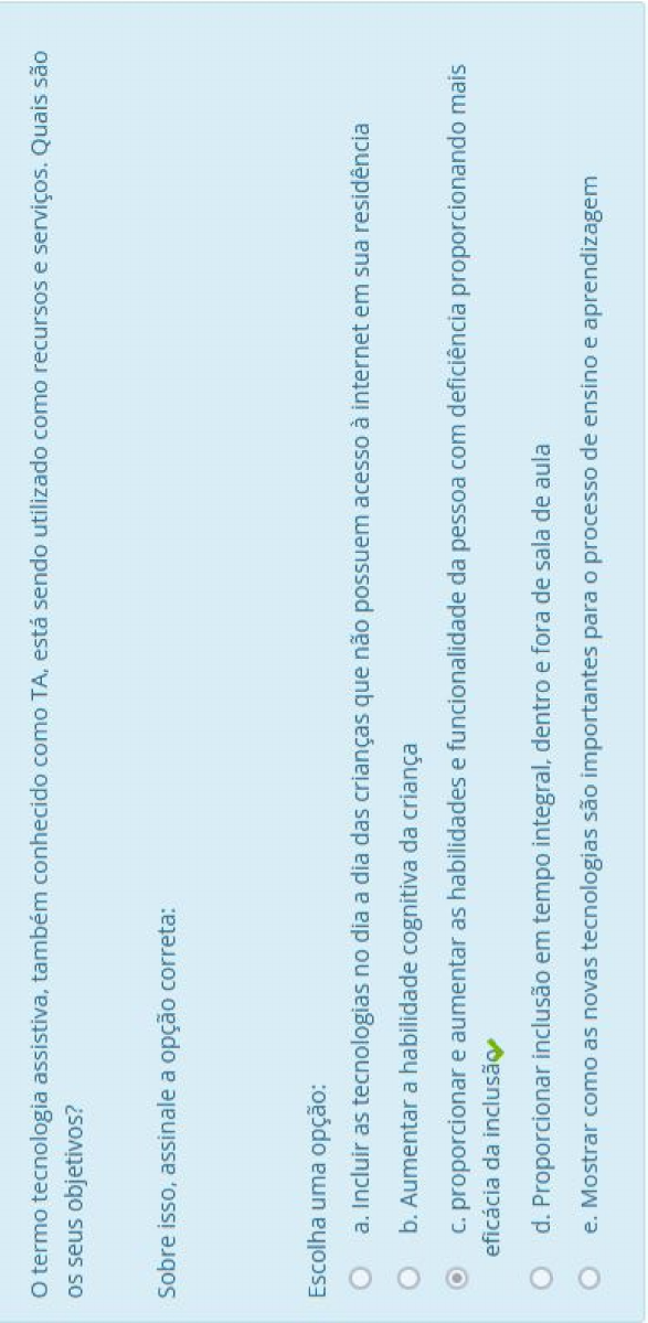 <p>termo tecnologia assistiva, também conhecido como TA, está sendo utilizado como recursos e serviços. Quais são os seus objetivos? Sobre isso, assinale a opção correta: Escolha uma opção: a. Incluir as tecnologias no dia a dia das crianças que não possuem acesso à internet em sua residência b. Aumentar a habilidade cognitiva da criança proporcionar e aumentar as habilidades e funcionalidade da pessoa com deficiência proporcionando mais eficácia da inclusão d. Proporcionar inclusão em tempo integral, dentro e fora de sala de aula e. Mostrar como as novas tecnologias são importantes para o processo de ensino e aprendizagem</p>