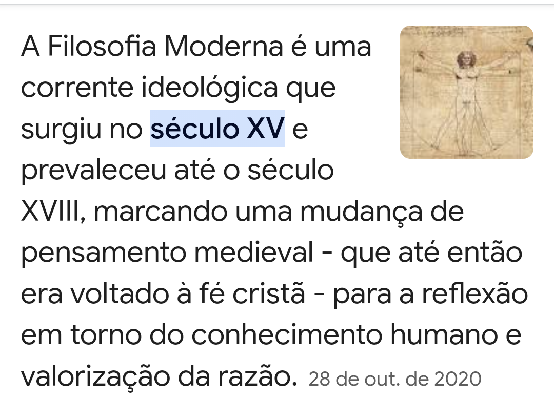 <p>A Filosofia Moderna é uma corrente ideológica que surgiu no século XV e prevaleceu até século XVIII, marcando uma mudança de pensamento medieval - que até então era voltado à fé - para a reflexão em torno do conhecimento humano e valorização da razão. 28 de out. de 2020</p>