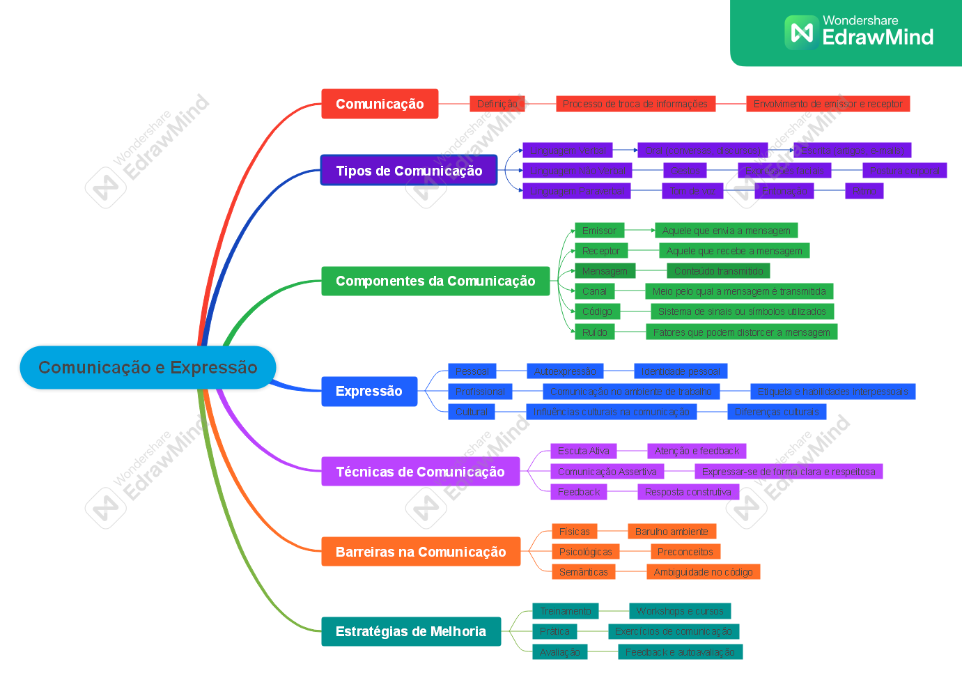 <p>Wondershare N EdrawMind Comunicação Definição Processo de troca de informações de emissor e receptor Verbal discursos) Tipos de Comunicação Gestos Postura corporal Paraverbal Tom Emissor Aquele que envia a mensagem Receptor Aquele que recebe a mensagem Conteúdo transmitido Componentes da Comunicação Cana Meio pelo qual a mensagem é transmitida Código Sistema de sinais ou utilizados Fatores que podem distorcer a mensagem Comunicação e Expressão Pessoal Autoexpressão Identidade pessoa Expressão Profissional Comunic no ambiente de trabalho Etiqueta e habilidades interpessoais Cultural Influências culturais na ao Diferenças culturais Escuta Ativa e feedback Técnicas de Comunicação Comunicação Assertiva Expressar-se de forma clara e respeitosa Feedback Resposta construtiva Físicas Barulho ambiente Barreiras na Comunicação Psicológicas Preconceitos Ambiguidade no código Treinamento Workshops e cursos Estratégias de Melhoria Prática Exercícios de Avaliac Feedback e</p>