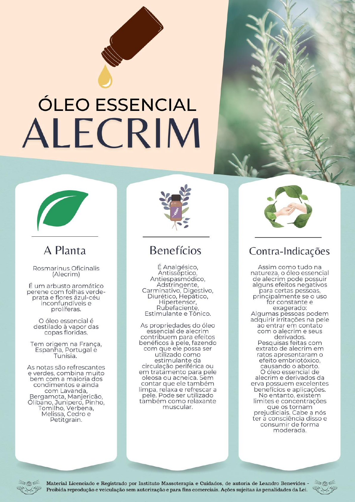 <p>ÓLEO ESSENCIAL ALECRIM A Planta Benefícios Contra-Indicações Rosmarinus Oficinalis É Analgésico, Assim como tudo na (Alecrim) Antisséptico, natureza, o óleo essencial Antiespasmódico, de alecrim pode possuir É um arbusto aromático Adstringente, alguns efeitos negativos perene com folhas verde- Carminativo, Digestivo, para certas pessoas, prata e flores ázul-céu Diurético, Hepático, principalmente se uso Hipertensor, for constante e inconfundíveis e Rubefaciente, exagerado: prolíferas. Estimulante e Tônico. Algumas pessoas podem adquirir irritações na pele óleo essencial é destilado à vapor das As propriedades do óleo ao entrar em contato copas floridas. essencial de alecrim com o alecrim e seus contribuem para efeitos derivados. benéficos à pele, fazendo Pesquisas feitas com Tem origem na França, Espanha, Portugal e com que ele possa ser extrato de alecrim em utilizado como ratos apresentaram o Tunísia. estimulante da efeito embriotóxico, circulação periférica ou causando o aborto. As notas são refrescantes em tratamento para pele óleo essencial de e verdes, combina muito bem com a maioria dos oleosa ou acneica. Sem alecrim e derivados da condimentos e ainda contar que ele também erva possuem excelentes limpa, relaxa e refrescar a benefícios e aplicações. com Lavanda, pele. Pode ser utilizado No entanto, existem Bergamota, também como relaxante limites e concentrações Ólibano, Junipero, Pinho, Tomilho, Verbena, muscular. que os tornam prejudiciais. Cabe a nós Melissa, Cedro e ter a consciência disso e Petitgrain. consumir de forma moderada. Material Licenciado e Registrado por Instituto Massoterapia e Cuidados, de autoria de Leandro Benevides Proibida reprodução e veiculação sem autorização e para fins comerciais. Ações sujeitas às penalidades da Lei.</p><p>ÓLEO ESSENCIAL ANIS A Planta Benefícios Contra-Indicações Verum Regulador do Apetite, anis-estrelado é (Anis Estrelado) Estimulante, Digestivo e considerado seguro, Carminativo. especialmente quando Potencial usado na preparação de anis-estrelado, também conhecido Antiespasmódico, Alivia pratos. Já no caso do chá, como estrela-de-anis, é espasmos de tosse, ainda existem poucos Asma, Cólica de Bebês e estudos que avaliem uma especiaria que é Gases. seus efeitos colaterais. feita a partir do fruto de Potencial Antisséptico, Ainda assim, algumas uma espécie de árvore asiática chamada de Antimicrobiano, pessoas parecem relatar Ilicium verum. Esta Coadjuvante na Redução algumas náuseas após especiaria normalmente do mal estar respiratório ingerir grandes em resfriados, gripes e quantidades. No caso do é facilmente encontrada na sua forma seca em bronquites. óleo essencial, se Acalma sintomas da aplicado diretamente na supermercados. Amenorréia. pele, poderá causar irritação da pele. Embora seja muito utilizado na culinária anis-estrelado está para conferir um sabor contraindicado para adocicado a algumas pessoas com preparações, anis- hipersensibilidade estrelado também grávidas, mulheres em apresenta vários fase de amamentação e benefícios para a saúde crianças, pois até devido aos seus momento não foram componentes, realizados estudos nessa especialmente o anetol, população sobre os que parece ser a efeitos a médio e longo substância presente em prazo do uso do anis- maior concentração. estrelado e, assim, não é possível indicar que uso dessa especiaria é seguro. Material Licenciado e Registrado por Instituto Massoterapia e Cuidados, de autoria de Leandro Benevides Proibida reprodução e veiculação sem autorização e para fins comerciais. Ações sujeitas às penalidades da Lei.</p><p>ÓLEO ESSENCIAL BERGAMOT ITALY A Planta Benefícios Contra-Indicações Citrus Bergâmia Antidepressivo e sedativo, óleo essencial de bergamota é auxiliando em casos de altamente fototóxico. A IFRA (Bergamot Italy) depressão e ansiedade. (Associação Internacional de Restaura o equilíbrio mental e Fragrâncias) recomenda que A planta é originária do combate a insônia. Possui um óleo essencial de bergamota seja Bérgamo, na Itália. É delicioso aroma é limitado a uma diluição máxima uma arvore de pequeno antisséptico e desodorante, de 0,4% no produto final. muito utilizado em perfumes. Não aplique óleo essencial de porte, de flores brancas e bergamota na pele que estará folhas verde-brilhantes. A óleo essencial de bergamota, exposta à luz solar ou à luz fruta lembra uma laranja em virtude de suas ultravioleta antes de 72 horas, ao em miniatura, de cor propriedades medicinais, menos que seja óleo essencial apresenta inúmeras utilidades de bergamota FCF. Caso amarelo-esverdeada em prol da saúde. Este óleo contrário, isso aumentará a quando madura, com possui um aroma refrescante possibilidade de queimaduras, combinado com um cítrico bolhas e erupções cutâneas nas sabor amargo e aroma áreas expostas ao sol. balanceado, ligeiramente aconselhável usar protetor solar floral. Inalá-lo estimula a sensação de alegria, frescor e e roupa protetora quando passar tempo sob a luz solar, energia. A tonalidade de sua principalmente se este tipo de cor está entre verde e medicamente está sendo usado. verde-oliva; quando exposto à Se você usa óleo de bergamota e luz solar ou ao oxigênio, exibe tem diabetes, assegure-se de uma tonalidade mais clara, controlar seus níveis de açúcar algo próximo a um tom quase no sangue regularmente. Caso marrom, mesclado com uma tenha uma cirurgia programada, verde-oliva amarelada ou deixe de usar o óleo de pálida. Alguns dos benefícios bergamota ao menos duas mais comuns do óleo essencial semanas antes da etapa de bergamota incluem: tirar a cirúrgico, já que pode interferir tensão emocional, funcionar no controle do no sangue como um potente durante o procedimento. antidepressivo, aliviar as dores Houve efeitos colaterais graves dos músculos e das em crianças que tomaram artic