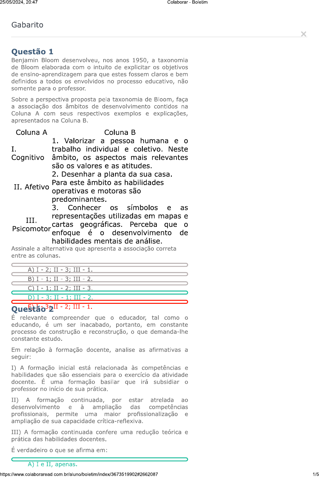 <p>25/05/2024, 20:47 Colaborar Boletim Gabarito Questão 1 Benjamin Bloom desenvolveu, nos anos 1950, a taxonomia de Bloom elaborada com o intuito de explicitar os objetivos de ensino-aprendizagem para que estes fossem claros e bem definidos a todos os envolvidos no processo educativo, não somente para o professor. Sobre a perspectiva proposta pela taxonomia de Bloom, faça a associação dos âmbitos de desenvolvimento contidos na Coluna A com seus respectivos exemplos e explicações, apresentados na Coluna B. Coluna A Coluna B 1. Valorizar a pessoa humana e o I. trabalho individual e coletivo. Neste Cognitivo âmbito, os aspectos mais relevantes são os valores e as atitudes. 2. Desenhar a planta da sua casa. Para este âmbito as habilidades II. Afetivo operativas e motoras são predominantes. 3. Conhecer os símbolos e as representações utilizadas em mapas e III. cartas geográficas. Perceba que o Psicomotor enfoque é o desenvolvimento de habilidades mentais de análise. Assinale a alternativa que apresenta a associação correta entre as colunas. A) I - 2; II 3; III 1. B) I - 1; II - III 2. C) I 1; II - 2; III 3. D) I - II 1: III 2. 2; III - 1. É relevante compreender que o educador, tal como o educando, é um ser inacabado, portanto, em constante processo de construção e reconstrução, o que demanda-lhe constante estudo. Em relação à formação docente, analise as afirmativas a seguir: I) A formação inicial está relacionada às competências e habilidades que são essenciais para o exercício da atividade docente. É uma formação basilar que irá subsidiar o professor no início de sua prática. II) A formação continuada, por estar atrelada ao desenvolvimento e à ampliação das competências profissionais, permite uma maior profissionalização e ampliação de sua capacidade III) A formação continuada confere uma redução teórica e prática das habilidades docentes. É verdadeiro o que se afirma em: A) I e II, apenas. https://www.colaboraread.com.br/aluno/boletim/index/3673519902#2662087 1/5</p><p>25/05/2024, 20:47 Colaborar Boletim B) II, apenas. C) I, II e III. D) III, apenas. Questão apenas. papel do professor é o de planejar, selecionar e organizar os conteúdos, programar tarefas, criar condições de estudo dentro da classe, incentivar os alunos para o estudo, ou seja, o professor dirige as atividades de aprendizagem dos alunos a fim de que estes se tornem sujeitos ativos da própria aprendizagem. Em relação aos âmbitos/níveis do planejamento, há um que é a dimensão mais cotidiana do planejamento, em que se operacionaliza os elementos contidos tanto no plano de ensino, como no planejamento escolar. Assinale a alternativa que apresenta o nome dado a esse registro. A) Plano de aula. B) Projeto Político Pedagógico. C) Plano de ensino. D) Plano didático. escolar. A prática docente exige que o professor, portanto, seja capaz de selecionar os conteúdos mais significativos, bem como articular com a metodologia mais indicada para cada problematização e para cada contexto. Sobre o método, é correto afirmar que: A) É a seleção do conteúdo a ser trabalhado. B) E o caminho a ser percorrido para atingir o objetivo proposto. C) objetivo da aula. avaliação de plano de aula. ensino híbrido exige que o aluno seja compreendido como um protagonista de seu processo de aprendizagem, sendo permeado pela personalização e individualização de suas necessidades educativas. Nesta forma de acontecer o ensino é preciso que o aluno seja compreendido dentro de sua realidade e de seu ritmo de aprendizagem. Considerando o ensino híbrido e suas variáveis, analise as sentenças a seguir: I) tempo deve ser restrito apenas à questão cronológica do dia ou do ano escolar, sem primar pelo tempo de aprendizagem do aluno. II) Quanto ao local/lugar é fundamental perceber que, se o aprendiz é o protagonista do processo de aprendizagem, este método não está restrito aos ambientes físicos tradicionais, ou seja, a escola deve desenvolver no estudante a capacidade de aprender a aprender e isso implica que o aprendizado pode ocorrer com variadas ferramentas e em diferentes locais. III) caminho (metodologia) deve estar relacionado às necessidades educativas dos alunos. Logo, a metodologia não deve estar centrada no professor, mas nas demandas dos aprendizes, o que possibilita os processos de 2/5</p><p>25/05/2024, 20:47 Colaborar Boletim individualização e de personalização das estratégias, potencializando a aprendizagem. IV) ritmo deixou de ser uniforme e homogêneo, isto é, sabemos que cada pessoa possui um ritmo de aprendizagem que pode variar de acordo com elementos, como: contexto no qual está inserido, sua habilidade, sua motivação, afetividade na relação com o professor e tantas outras. É correto o que se afirma em: A) II e III, apenas. B) I, II e III, apenas. C) I, II e IV, apenas. D) II, apenas. Questão 6 e IV, apenas. A crença de que todos os alunos são capazes de aprender, demanda que o professor considere tempos e ritmos diferenciados, ação que deve perpassar toda a ação didática, inclusive o momento de se efetivar a avaliação da aprendizagem que visa saber das aprendizagens alcançadas e dos saberes ainda em construção. Essa concepção avaliativa apresenta pressupostos: A) B) De verificação. C) Quantitativos. D) Classificatórios. Questão medida. Os dispositivos eletrônicos são ferramentas que auxiliam no processo de inserir as tecnologias no contexto educacional. Contudo, a tecnologia por si só não é capaz de transformar a educação e a prática docente. Sobre o uso de tecnologias na educação, avalie as seguintes asserções e a relação proposta entre elas I) investimento em infraestrutura é um primeiro estágio para que a escola possa incorporar a tecnologia como uma realidade dentro de seu contexto. PORQUE II) Antes de realizar este investimento, é necessário que as variáveis: escalabilidade, amigabili