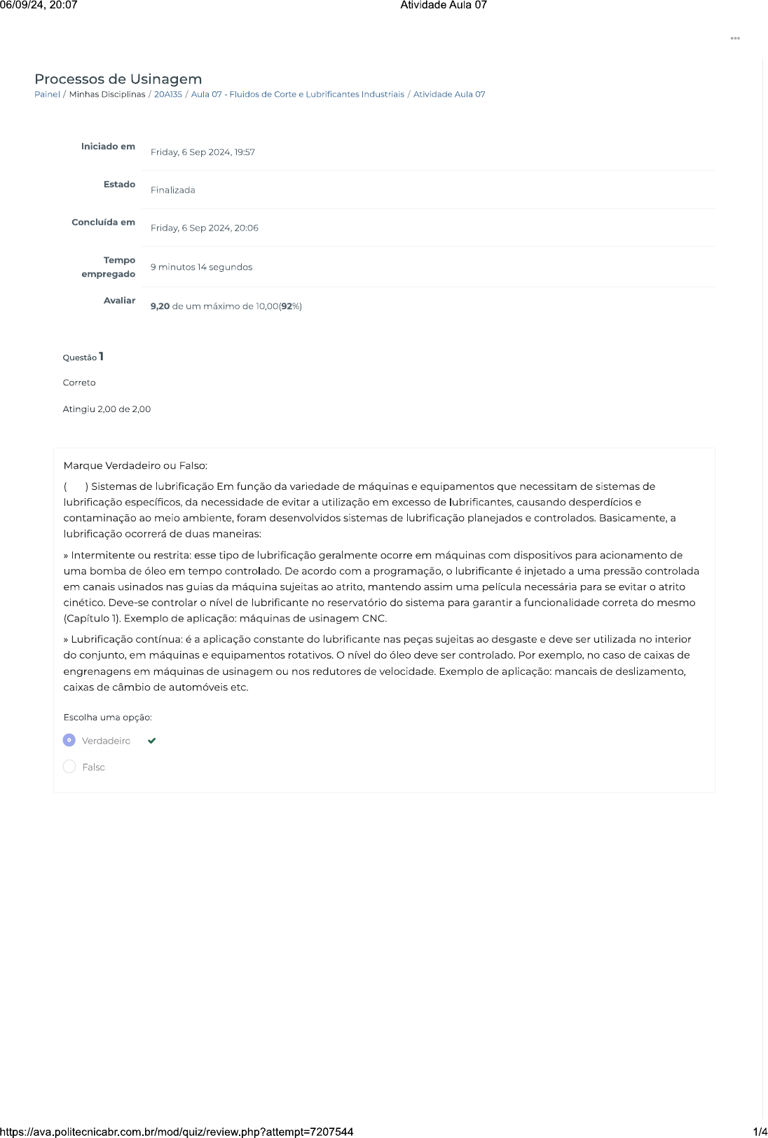 <p>06/09/24, 20:07 Atividade Aula 07 Processos de Usinagem Painel / Minhas Disciplinas / 20A135 / Aula 07 Fluidos de Corte e Lubrificantes Industriais / Atividade Aula 07 Iniciado em Friday, 6 Sep 2024, 19:57 Estado Finalizada Concluída em Friday, 6 Sep 2024, 20:06 Tempo 9 minutos 14 segundos empregado Avaliar 9,20 de um máximo de 10,00(92%) Questão 1 Correto Atingiu 2,00 de 2,00 Marque Verdadeiro ou Falso: ( ) Sistemas de lubrificação Em função da variedade de máquinas e equipamentos que necessitam de sistemas de lubrificação específicos, da necessidade de evitar a utilização em excesso de lubrificantes, causando desperdícios e contaminação ao meio ambiente, foram desenvolvidos sistemas de lubrificação planejados e controlados. Basicamente, a lubrificação ocorrerá de duas maneiras: Intermitente ou restrita: esse tipo de lubrificação geralmente ocorre em máquinas com dispositivos para acionamento de uma bomba de óleo em tempo controlado. De acordo com a programação, lubrificante é injetado a uma pressão controlada em canais usinados nas guias da máquina sujeitas ao atrito, mantendo assim uma película necessária para se evitar o atrito cinético. Deve-se controlar nível de lubrificante no reservatório do sistema para garantir a funcionalidade correta do mesmo (Capítulo 1). Exemplo de aplicação: máquinas de usinagem CNC. Lubrificação contínua: é a aplicação constante do lubrificante nas peças sujeitas ao desgaste e deve ser utilizada no interior do conjunto, em máquinas e equipamentos rotativos. nível do óleo deve ser controlado. Por exemplo, no caso de caixas de engrenagens em máquinas de usinagem ou nos redutores de velocidade. Exemplo de aplicação: mancais de deslizamento, caixas de câmbio de automóveis etc. Escolha uma opção: Verdadeiro Falso 1/4</p><p>06/09/24, 20:07 Atividade Aula 07 Correto Atingiu 2,00 de 2,00 Os fluidos de corte são substâncias desenvolvidas com a função de refrigerar a peça e a ferramenta de corte durante a usinagem. A eficiência nos trabalhos de usinagem está diretamente ligada aos fluidos de corte, uma vez que influenciam no desempenho das operações de corte. Apresentam as seguintes funções primárias, exceto: Escolha uma opção: a. criar uma película entre a aresta de corte e a superfície da peça (função lubrificante). b. evitar que as partes da máquina sem proteção se C. reduzir o esforço de peça. d. auxiliar na remoção de cavacos (ação de lavagem) e. refrigerar a ferramenta de corte e a peça. Questão 3 Parcialmente correto Atingiu 1,20 de 2,00 Os fluidos de corte podem ser classificados em função de sua fabricação e aplicação, conforme a seguir: Óleos EP são óleos minerais nos quais se incorporam aditivos de extrema pressão. Podem ser enxofre, cloro ou fósforo. são misturas de óleos graxos (5% a 25%) e minerais. São muito utiliza- dos para usinagem do cobre e suas ligas. Óleos com têm origem animal ou vegetal, possuem excelente oleosidade e médias características refrigerantes. Seu longo tempo em exposição ou armazenagem na máquina favorece o desenvolvimento de bactérias e fungos que podem causar infecções Óleos graxo cutâneas. apresentam aspecto de emulsão opaca de branca em água, contendo aditivos anticorrosivos e de extrema pressão. São Óleos mine diluídos em água numa proporção de 1% a Os óleos solúveis aliam propriedades refrigerantes com lubrificantes. x Solúveis suas características refrigerantes são inferiores, mas conferem boas propriedades protetivas contra oxidação. x 2/4</p><p>06/09/24, 20:07 Atividade Aula 07 Correto Atingiu 2,00 de 2,00 A utilização e manuseio de fluidos de corte utilizados em operações de usinagem exigem procedimentos que garantam a segurança dos profissionais e evitem contaminação do meio ambiente e de efluentes. Marque a alternativa correta. Escolha uma opção: a. Em caso de corte ou arranhões acidentais, suspender contato com fluido, lavar ferimento e procurar atendimento de profissional de saúde capacitado. b. Lavar as áreas da pele que entram em contato com os salpicos de fluido, sujeira e partículas metálicas ao menos duas vezes durante dia de trabalho. C. As máquinas devem ser equipadas com proteções que evitem respingos de fluido no operador e em pessoas próximas (NR 12). d. Realizar limpezas periódicas no reservatório do fluido da máquina-ferramenta o e. todas as alternativas corretas. Questão 5 Correto Atingiu 2,00 de 2,00 Associe corretamente os principais aditivos utilizados em lubrificantes, levando em consideração os tipos e origem química. Anticorrosivo Sulfonatos de cálcio, sódio ou bário, aminas orgânicas etc. Éster poli-isobutenilsuccínico ou succinimidas. Dispersante de cinzas Sulfonatos, fenatos ou salicilatos de cálcio, bário ou magnésio. Detergente básico Melhorador da viscosidade Polímeros como poliestireno e copolímeros derivados do etileno e propileno. Metacrilatos Melhorador do ponto de mínima fluidez Compostos de silicones ou metacrilatos. Antiespumante Entre em Contato Links Úteis https://www.politecnicabr.com.br Dicas da nossa Diretora Acadêmica 0800 084 2627 Planner de Estudos 0800 084 2627 Declaração de Matrícula Orientações do AVA Abertura de Ticket @ Fale com Tutor Cronograma de Estudos Manual de Estágio Manual de Competência Siga-nos nas redes sociais 3/4</p>