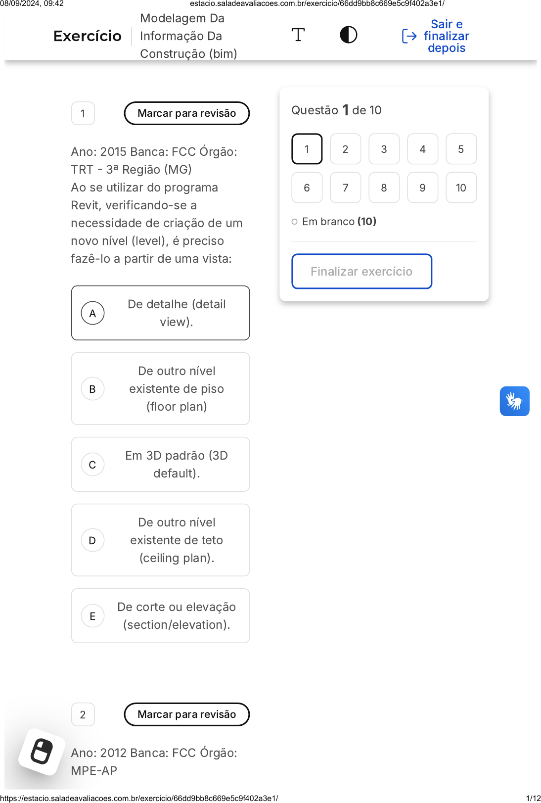 <p>A</p><p>B</p><p>C</p><p>D</p><p>E</p><p>1 Marcar para revisão</p><p>Ano: 2015 Banca: FCC Órgão:</p><p>TRT � 3ª Região �MG�</p><p>Ao se utilizar do programa</p><p>Revit, verificando-se a</p><p>necessidade de criação de um</p><p>novo nível (level), é preciso</p><p>fazê-lo a partir de uma vista:</p><p>De detalhe (detail</p><p>view).</p><p>De outro nível</p><p>existente de piso</p><p>(floor plan)</p><p>Em 3D padrão �3D</p><p>default).</p><p>De outro nível</p><p>existente de teto</p><p>(ceiling plan).</p><p>De corte ou elevação</p><p>(section/elevation).</p><p>2 Marcar para revisão</p><p>Ano: 2012 Banca: FCC Órgão:</p><p>MPE�AP</p><p>Questão 1 de 10</p><p>Em branco �10�</p><p>Finalizar exercício</p><p>1 2 3 4 5</p><p>6 7 8 9 10</p><p>Exercício</p><p>Modelagem Da</p><p>Informação Da</p><p>Construção (bim)</p><p>Sair e</p><p>finalizar</p><p>depois</p><p>08/09/2024, 09:42 estacio.saladeavaliacoes.com.br/exercicio/66dd9bb8c669e5c9f402a3e1/</p><p>https://estacio.saladeavaliacoes.com.br/exercicio/66dd9bb8c669e5c9f402a3e1/ 1/12</p><p>A</p><p>B</p><p>C</p><p>O termo curtain wall, usado</p><p>pelo Autodesk Revit Building,</p><p>pode ser traduzido como</p><p>parede cortina. No entanto,</p><p>esta designação deve ser</p><p>entendida num sentido mais</p><p>lato, pois este gênero de</p><p>objetos presta-se igualmente à</p><p>criação de pequenos vãos,</p><p>desde que referentes a um</p><p>conjunto de painéis divididos</p><p>por uma grelha de caixilhos. A</p><p>respeito dos componentes de</p><p>uma parede cortina, é correto</p><p>afirmar que:</p><p>Não é possível</p><p>colocar caixilhos</p><p>sobre as linhas de</p><p>grelha, pois devem</p><p>ser obrigatoriamente</p><p>definidos antes da</p><p>criação das grelhas.</p><p>Os painéis que</p><p>resultam da divisão da</p><p>superfície de uma</p><p>parede cortina não</p><p>podem ser</p><p>manipulados</p><p>individualmente.</p><p>Os system panels são</p><p>habitualmente</p><p>utilizados para</p><p>representar os painéis</p><p>vazios, ou seja, um</p><p>vão aberto.</p><p>08/09/2024, 09:42 estacio.saladeavaliacoes.com.br/exercicio/66dd9bb8c669e5c9f402a3e1/</p><p>https://estacio.saladeavaliacoes.com.br/exercicio/66dd9bb8c669e5c9f402a3e1/ 2/12</p><p>D</p><p>E</p><p>A</p><p>B</p><p>Para constituir uma</p><p>grelha secundária</p><p>dentro da grelha</p><p>principal é possível</p><p>inserir uma parede</p><p>cortina em um painel.</p><p>A grelha é composta</p><p>unicamente de linhas</p><p>traçadas em uma ou</p><p>duas direções</p><p>perpendiculares entre</p><p>si.</p><p>3 Marcar para revisão</p><p>Os níveis representam os</p><p>pavimentos do nosso projeto. A</p><p>ferramenta de nível é</p><p>importante para definir a altura</p><p>vertical ou os andares de uma</p><p>construção, os quais serão</p><p>referências para realização do</p><p>projeto. No Revit, a definição</p><p>dos níveis acontece:</p><p>No fim do projeto,</p><p>após definidas as</p><p>posições das paredes</p><p>em planta.</p><p>Apenas após</p><p>finalizada a planta,</p><p>quando são feitos os</p><p>cortes.</p><p>08/09/2024, 09:42 estacio.saladeavaliacoes.com.br/exercicio/66dd9bb8c669e5c9f402a3e1/</p><p>https://estacio.saladeavaliacoes.com.br/exercicio/66dd9bb8c669e5c9f402a3e1/ 3/12</p><p>C</p><p>D</p><p>E</p><p>Apenas após</p><p>finalizada a planta,</p><p>quando são feitas as</p><p>elevações.</p><p>De preferência, antes</p><p>de dar início à</p><p>realização da planta,</p><p>para que as paredes</p><p>já fiquem na altura</p><p>adequada.</p><p>De preferência,</p><p>quando for realizada a</p><p>visualização 3D, antes</p><p>de serem feitos cortes</p><p>e elevações.</p><p>4 Marcar para revisão</p><p>Ano: 2014 Banca: FCC Órgão:</p><p>TCE�RS</p><p>Com a chegada da modelagem</p><p>da informação da construção,</p><p>tem-se uma mudança de</p><p>paradigma, que pode alterar de</p><p>maneira profunda as relações</p><p>de trabalho entre as equipes</p><p>envolvidas num mesmo projeto.</p><p>A plataforma ou conceito</p><p>building information modeling -</p><p>BIM�</p><p>08/09/2024, 09:42 estacio.saladeavaliacoes.com.br/exercicio/66dd9bb8c669e5c9f402a3e1/</p><p>https://estacio.saladeavaliacoes.com.br/exercicio/66dd9bb8c669e5c9f402a3e1/ 4/12</p><p>A</p><p>B</p><p>C</p><p>Gera um modelo</p><p>digital do edifício que</p><p>representa</p><p>exclusivamente suas</p><p>características</p><p>geométricas.</p><p>Possui apenas um</p><p>software baseado</p><p>nessa filosofia,</p><p>desenvolvido a partir</p><p>de tecnologia única.</p><p>É apenas um</p><p>modelador 3D</p><p>destinado a gerar</p><p>apresentações com</p><p>alta qualidade e</p><p>realismo gráfico.</p><p>08/09/2024, 09:42 estacio.saladeavaliacoes.com.br/exercicio/66dd9bb8c669e5c9f402a3e1/</p><p>https://estacio.saladeavaliacoes.com.br/exercicio/66dd9bb8c669e5c9f402a3e1/ 5/12</p><p>D</p><p>E</p><p>Tem como principal</p><p>característica a</p><p>criação de modelos</p><p>tridimensionais</p><p>alimentados por</p><p>diversos tipos de</p><p>informações que</p><p>permitem a geração</p><p>de documentos como</p><p>plantas, cortes,</p><p>elevações e</p><p>simulações</p><p>relacionadas ao</p><p>empreendimento.</p><p>É uma filosofia de</p><p>trabalho que permite</p><p>independência aos</p><p>arquitetos,</p><p>engenheiros e</p><p>construtores �AEC) na</p><p>elaboração de um</p><p>modelo (edifício)</p><p>virtual bastante</p><p>preciso sem a</p><p>necessidade de</p><p>trabalho conjunto.</p><p>5 Marcar para revisão</p><p>Tribunal de Justiça do Estado</p><p>do Amapá �TJ�AP� - FCC �</p><p>2014</p><p>Ao usarmos um software</p><p>aplicado à arquitetura, é</p><p>importante conhecer os</p><p>principais formatos de arquivos</p><p>que ele permite gerar e</p><p>importar, pois facilita a troca de</p><p>08/09/2024, 09:42 estacio.saladeavaliacoes.com.br/exercicio/66dd9bb8c669e5c9f402a3e1/</p><p>https://estacio.saladeavaliacoes.com.br/exercicio/66dd9bb8c669e5c9