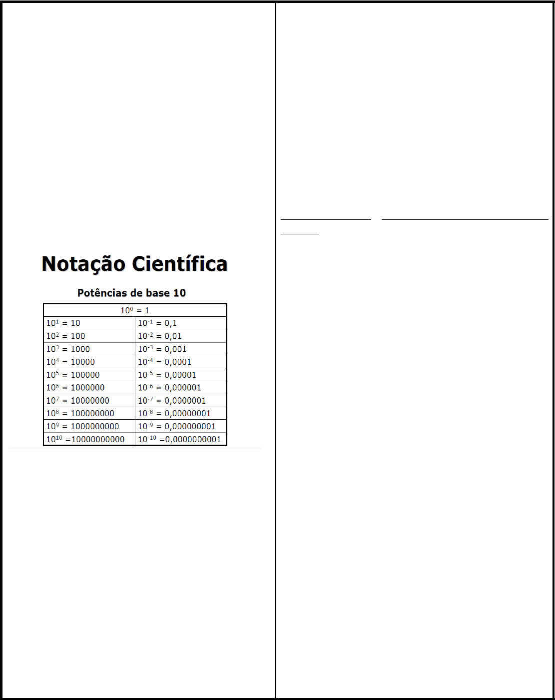 <p>Notação Científica</p><p>Notação científica é uma forma simplificada de representar números reais muito grandes ou muito pequenos nas ciências em geral. Nessa disposição, a é chamado de mantissa, ou coeficiente, e n é chamado de expoente, ou ordem de grandeza.</p><p>A notação científica é uma forma de escrever números usando potência de 10. É utilizada para reduzir a escrita de números que apresentam muitos algarismos.</p><p>Números muito pequenos ou muito grandes são frequentemente encontrados nas ciências em geral e escrever em notação científica facilita fazer comparações e cálculos.</p><p>Um número em notação científica apresenta o seguinte formato:</p><p>a . 10n</p><p>Sendo,</p><p>a um número real igual ou maior que 1 e menor que 10;</p><p>n um número inteiro.</p><p>Veja abaixo como transformar os números em</p><p>notação científica de forma prática:</p><p>→ 1º Passo: Escrever o número na forma decimal, com apenas um algarismo diferente de 0 na frente</p><p>da vírgula.</p><p>→ 2º Passo: Colocar no expoente da potência de 10.</p><p>O número de casas decimais que tivemos que "andar" com a vírgula, será o expoente. Se ao andar com a vírgula o valor do número diminuiu, o expoente ficará positivo, se aumentou o expoente ficará negativo.</p><p>→ 3º Passo: Escrever o produto do número pela potência de 10.</p><p>Observe os exemplos:</p><p>a) 5 = 5 . 1 = 5 . 100</p><p>b) 52 = 5,2 . 101</p><p>c) 500 = 5 . 102</p><p>d) 1 300 = 1,3 . 103</p><p>e) 500 300 = 5,003 . 105</p><p>f) 42000000 = 4,2 . 107</p><p>g) 1,3 = 1,3 . 100</p><p>h) –25 800 = –2,58 . 104</p><p>i) 15 200,9 = 1,52009 . 104</p><p>j) 6 590 000 000 000 000 = 6,59 . 1015</p><p>k) 0,35 = 3,5 . 10–1</p><p>l) 0,004 = 4 . 10–3</p><p>m) 0,00501 = 5,01 . 10–3</p><p>n) 0,0000002 = 2 . 10–7</p><p>o) 0, 000000000016 = 1,6 . 10 –11</p><p>Para transformar notação científica em número decimal, devemos contar os números depois da vírgula e completar com zeros até a quantidade que o expoente da base 10 indicar.</p><p>Observe os exemplos:</p><p>· 6. 10 – 12 = 0,000000000006</p><p>· 1,07 . 108 = 107000000</p><p>· 3,45 . 105 = 345000</p><p>· 2,6 . 10 – 4 = 0,00026</p><p>ATIVIDADES</p><p>1) O número 0,0000045, em notação cientifica, corresponderá a:</p><p>a) 0,45 ∙ 10–5</p><p>b) 0,45 ∙ 10–6</p><p>c) 4,5 ∙ 10–4</p><p>d) 4,5 ∙ 10–5</p><p>e) 4,5 ∙ 10–6</p><p>2) A carga de um elétron é – 0,00000000000000000016 C.</p><p>Esse número, em notação cientifica, será:</p><p>a) – 1,6 ∙ 10 –15 C</p><p>b) – 1,6 ∙ 10 –16 C</p><p>c) – 1,6 ∙ 10 –17 C</p><p>d) – 1,6 ∙ 10 –18 C</p><p>e) – 1,6 ∙ 10 –19 C</p><p>3) Como escrevemos 7,5 ∙ 10–5 na forma decimal?</p><p>a) 7,50000</p><p>b) 750000</p><p>c) 0,000075</p><p>d) 0,00075</p><p>e) 0,75000</p><p>4) Como escrevemos 2,045 ∙ 104 na forma decimal?</p><p>a) 0,2045</p><p>b) 204,5000</p><p>c) 20,4500</p><p>d) 20450000</p><p>e) 20450</p><p>image1.png</p>