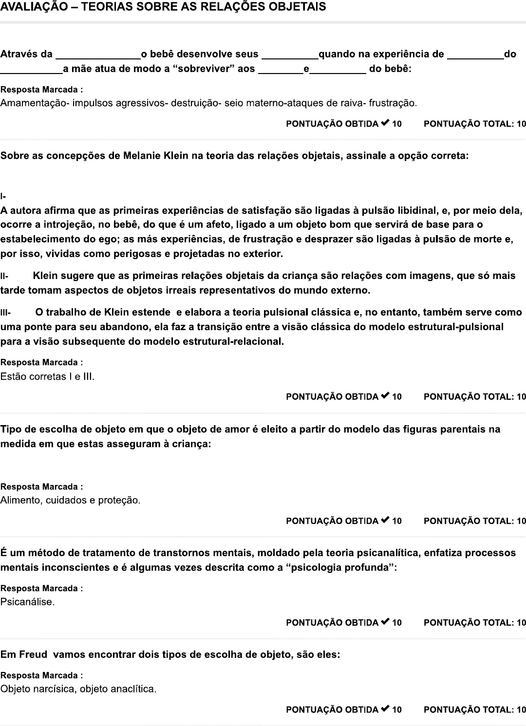 <p>AVALIAÇÃO - TEORIAS SOBRE AS RELAÇÕES OBJETAIS Através da o bebê desenvolve seus quando na experiência de do a mãe atua de modo a "sobreviver" aos e do bebê: Resposta Marcada : Amamentação- impulsos agressivos- destruição- seio materno-ataques de raiva- PONTUAÇÃO OBTIDA 10 PONTUAÇÃO TOTAL: 10 Sobre as concepções de Melanie Klein na teoria das relações objetais, assinale a opção correta: I- A autora afirma que as primeiras experiências de satisfação são ligadas à pulsão libidinal, e, por meio dela, ocorre a introjeção, no bebê, do que é um afeto, ligado a um objeto bom que servirá de base para o estabelecimento do ego; as más experiências, de frustração e desprazer são ligadas à pulsão de morte e, por isso, vividas como perigosas e projetadas no exterior. II- Klein sugere que as primeiras relações objetais da criança são relações com imagens, que só mais tarde tomam aspectos de objetos irreais representativos do mundo externo. III- o trabalho de Klein estende e elabora a teoria pulsional clássica e, no entanto, também serve como uma ponte para seu abandono, ela faz a transição entre a visão clássica do modelo estrutural-pulsional para a visão subsequente do modelo estrutural-relacional Resposta Marcada : Estão corretas e III. PONTUAÇÃO OBTIDA 10 PONTUAÇÃO TOTAL: 10 Tipo de escolha de objeto em que o objeto de amor é eleito a partir do modelo das figuras parentais na medida em que estas asseguram à criança: Resposta Marcada Alimento, cuidados e proteção. PONTUAÇÃO OBTIDA 10 PONTUAÇÃO TOTAL: 10 É um método de tratamento de transtornos mentais, moldado pela teoria psicanalítica, enfatiza processos mentais inconscientes e é algumas vezes descrita como a "psicologia profunda": Resposta Marcada : Psicanálise. PONTUAÇÃO OBTIDA 10 PONTUAÇÃO TOTAL: 10 Em Freud vamos encontrar dois tipos de escolha de objeto, são eles: Resposta Marcada Objeto narcísica, objeto anaclítica. PONTUAÇÃO OBTIDA 10 PONTUAÇÃO TOTAL: 10</p><p>Conforme os estudos da apostila, trata-se de um elemento importante no processo de integração, estabelecida entre o bebê e sua mãe e não se limita à prática meramente mecânica, para fins de sobrevivência: Resposta Marcada : Amamentação. PONTUAÇÃO OBTIDA 10 PONTUAÇÃO TOTAL: 10 Freud amplia a noção de escolha narcísica e apresenta dela o quadro seguinte: "Ama-se segundo o tipo narcísico:, exceto : Resposta Marcada : O que o outro é. PONTUAÇÃO OBTIDA 10 PONTUAÇÃO TOTAL: 10 É uma escolha regressiva e complementar - mulher que alimenta e homem que protege: Resposta Marcada : Objeto anaclítica. PONTUAÇÃO OBTIDA 10 PONTUAÇÃO TOTAL: 10 Os estágios iniciais da vida são marcados pela relação com aquele que cuida do bebê e se ocupa em atender suas necessidades, na maior parte das vezes, a mãe. Esta dependência absoluta inicial é correspondida por uma condição chamada de: Resposta Marcada : Preocupação materna primária. PONTUAÇÃO OBTIDA 10 PONTUAÇÃO TOTAL: 10 Sobre as contribuições dos estudos de Ronald Fairbairn nas relações objetais, assinale a alternativa correta: I- Para Fairbairn, o processo de desenvolvimento da personalidade define-se como desenvolvimento da relação de objeto. II- A dependência madura, última fase do desenvolvimento das relações de objeto, é caracterizada pela possibilidade de relações mais dependentes do objeto. III - Segundo Fairbairn, as fases do desenvolvimento da relação de objeto, são basicamente três: Dependência infantil, etapa de transição, dependência madura. Resposta Marcada : Estão corretas e III. PONTUAÇÃO OBTIDA 10 PONTUAÇÃO TOTAL: 10 Total 100 / 100</p>