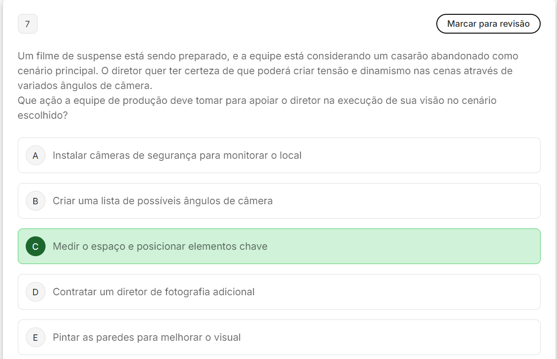 <p>7 Marcar para revisão Um filme de suspense está sendo preparado, e a equipe está considerando um casarão abandonado como cenário principal. o diretor quer ter certeza de que poderá criar tensão e dinamismo nas cenas através de variados ângulos de câmera. Que ação a equipe de produção deve tomar para apoiar o diretor na execução de sua visão no cenário escolhido? A Instalar câmeras de segurança para monitorar o local B Criar uma lista de possíveis ângulos de câmera C Medir o espaço e posicionar elementos chave D Contratar um diretor de fotografia adicional E Pintar as paredes para melhorar o visual</p>