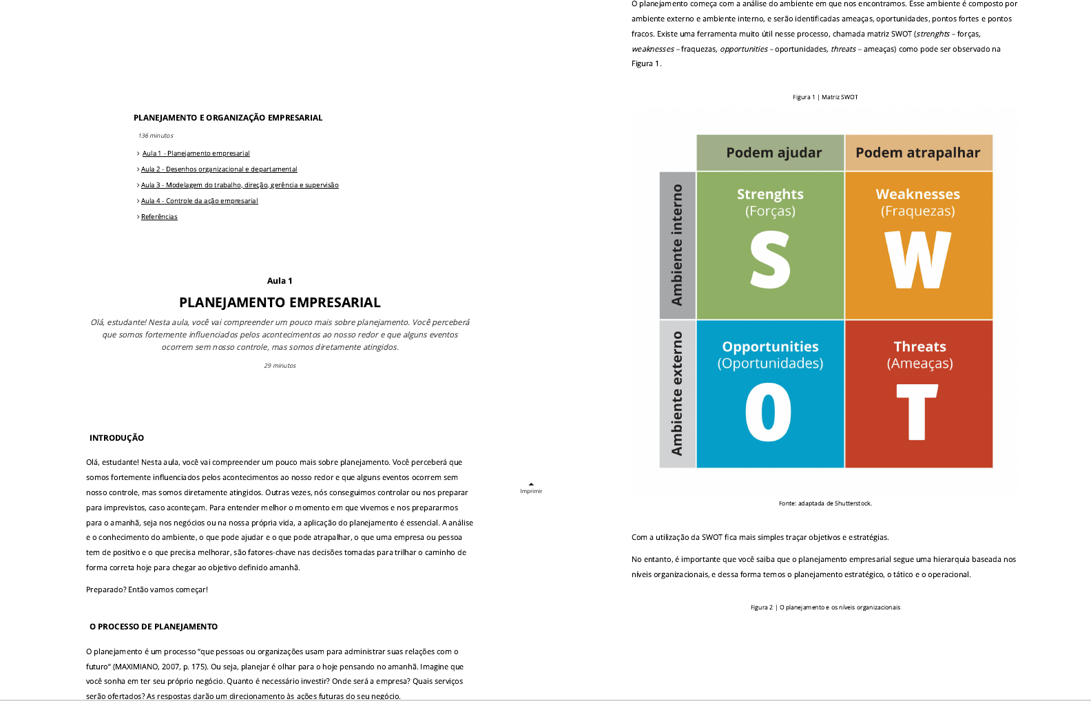 <p>Imprimir</p><p>INTRODUÇÃO</p><p>Olá, estudante! Nesta aula, você vai compreender um pouco mais sobre planejamento. Você perceberá que</p><p>somos fortemente in�uenciados pelos acontecimentos ao nosso redor e que alguns eventos ocorrem sem</p><p>nosso controle, mas somos diretamente atingidos. Outras vezes, nós conseguimos controlar ou nos preparar</p><p>para imprevistos, caso aconteçam. Para entender melhor o momento em que vivemos e nos prepararmos</p><p>para o amanhã, seja nos negócios ou na nossa própria vida, a aplicação do planejamento é essencial. A análise</p><p>e o conhecimento do ambiente, o que pode ajudar e o que pode atrapalhar, o que uma empresa ou pessoa</p><p>tem de positivo e o que precisa melhorar, são fatores-chave nas decisões tomadas para trilhar o caminho de</p><p>forma correta hoje para chegar ao objetivo de�nido amanhã.</p><p>Preparado? Então vamos começar!</p><p>O PROCESSO DE PLANEJAMENTO</p><p>O planejamento é um processo “que pessoas ou organizações usam para administrar suas relações com o</p><p>futuro” (MAXIMIANO, 2007, p. 175). Ou seja, planejar é olhar para o hoje pensando no amanhã. Imagine que</p><p>você sonha em ter seu próprio negócio. Quanto é necessário investir? Onde será a empresa? Quais serviços</p><p>serão ofertados? As respostas darão um direcionamento às ações futuras do seu negócio.</p><p>Aula 1</p><p>PLANEJAMENTO EMPRESARIAL</p><p>Olá, estudante! Nesta aula, você vai compreender um pouco mais sobre planejamento. Você perceberá</p><p>que somos fortemente in�uenciados pelos acontecimentos ao nosso redor e que alguns eventos</p><p>ocorrem sem nosso controle, mas somos diretamente atingidos.</p><p>29 minutos</p><p>PLANEJAMENTO E ORGANIZAÇÃO EMPRESARIAL</p><p> Aula 1 - Planejamento empresarial</p><p> Aula 2 - Desenhos organizacional e departamental</p><p> Aula 3 - Modelagem do trabalho, direção, gerência e supervisão</p><p> Aula 4 - Controle da ação empresarial</p><p> Referências</p><p>136 minutos</p><p>O planejamento começa com a análise do ambiente em que nos encontramos. Esse ambiente é composto por</p><p>ambiente externo e ambiente interno, e serão identi�cadas ameaças, oportunidades, pontos fortes e pontos</p><p>fracos. Existe uma ferramenta muito útil nesse processo, chamada matriz SWOT (strenghts – forças,</p><p>weaknesses – fraquezas, opportunities – oportunidades, threats – ameaças) como pode ser observado na</p><p>Figura 1.</p><p>Figura 1 | Matriz SWOT</p><p>Fonte: adaptada de Shutterstock.</p><p>Com a utilização da SWOT �ca mais simples traçar objetivos e estratégias.</p><p>No entanto, é importante que você saiba que o planejamento empresarial segue uma hierarquia baseada nos</p><p>níveis organizacionais, e dessa forma temos o planejamento estratégico, o tático e o operacional.</p><p>Figura 2 | O planejamento e os níveis organizacionais</p><p>Fonte: elaborada pela autora.</p><p>O nível estratégico envolve a alta gerência. É formado por presidente ou CEO, vice-presidente e diretores.</p><p>Nesse nível ocorre o planejamento estratégico, o que envolve a organização como um todo, de�nindo os</p><p>objetivos organizacionais a longo prazo, bem como a estratégia da organização nesse período. Normalmente,</p><p>o tempo para o longo prazo é estimado entre três e cinco anos, mas esse tempo pode variar para mais ou</p><p>menos, de acordo com o setor de atuação da empresa. Existem setores que �cam obsoletos mais</p><p>rapidamente, como é o caso de empresas que atuam fortemente com tecnologia, por exemplo, empresas de</p><p>celulares.</p><p>Do nível estratégico seguimos para o nível tático, que é formado pelos departamentos e as �liais da empresa,</p><p>tendo como base a média de um a três anos para execução. O planejamento nesse nível segue as diretrizes</p><p>de�nidas no planejamento estratégico, e são de�nidos novos objetivos e estratégias dentro de cada</p><p>departamento. Por exemplo, o departamento de marketing vai criar objetivos e estratégias voltados ao</p><p>marketing para que a organização consiga conquistar seu objetivo estratégico. O mesmo deve ocorrer com os</p><p>outros departamentos, como logística, produção, RH etc.</p><p>O próximo nível, chamado de operacional ou funcional, é a parte do planejamento no qual são elaborados os</p><p>planos de ação; isto é, as estratégias de�nidas no planejamento estratégico e no tático são colocadas em</p><p>prática. É o nível composto pelos colaboradores de cada área de uma empresa. Pode ter duração semestral a</p><p>um ano, mas também pode ocorrer de ser bimestral ou trimestral.</p><p>ANÁLISE DO AMBIENTE E DEFINIÇÃO DE ESTRATÉGIAS</p><p>Sabendo que o planejamento é um processo e que ele ocorre em diferentes níveis organizacionais, vamos</p><p>comentar um pouco mais da análise do ambiente.</p><p>A análise do ambiente permite que sejam identi�cadas oportunidades para criação ou para melhoria de um</p><p>produto ou serviço. Também permite que sejam visualizadas as principais ameaças que a empresa pode</p><p>enfrentar em seu mercado. E, mesmo que as nossas decisões estejam pautadas no que está acontecendo</p><p>agora, no momento presente, entender como está o ambiente que cerca a empresa é nos preparar para o</p><p>amanhã com mais estabilidade para lidar com os imprevistos que podem acontecer.</p><p>Embora não seja possível controlar o que ocorre nos ambientes legal, econômico, político, geográ�co,</p><p>tecnológico e sociocultural, somos afetados de forma direta ou indireta. A taxa Selic, por exemplo, é um</p><p>mecanismo econômico que interfere na forma como fazemos um �nanciamento. Portanto, antes de realizar</p><p>um �nanciamento é interessante veri�car o valor da Selic e se a tendência é ela aumentar ou diminuir. No</p><p>entanto, mesmo que se decida fazer ou não o �nanciamento, não cabe nós aume