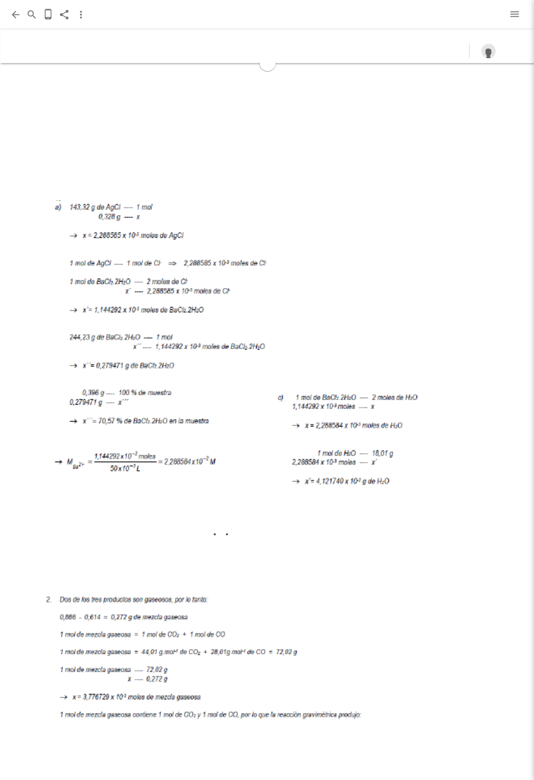 <p>Sobre • Central de ajuda •</p><p>Gamification • Trabalhe conosco •</p><p>Blog • Política de privacidade •</p><p>Termos de uso</p><p>© 2019 Passei Direto</p><p>Materiais de estudo</p><p>Perguntas e respostas</p><p>Minhas disciplinas</p><p>Cálculo Numérico</p><p>Mecânica Geral</p><p>Hidráulica I</p><p>Topografia I</p><p>Resistência dos Materi…</p><p>Meu Perfil</p><p>Listas 1</p><p>Histórico</p><p>Enviados</p><p> Buscar material de estudo e estudantes 1 Samuel</p><p>6.103.860º Seja Premium</p><p>Conteúdo 3 de 3 este mês. Para estudar ilimitado, ganhe pontos ou assine o Premium</p><p>Lista de Exercícios Gravimetria –</p><p>1. de 0Uma amostra ,3960 g que contém cloreto de bário foi totalmente dissolvida em 50,00 mL de água destilada. Posteriormente, todos os íons</p><p>cloreto foram precipitados com soluç os 0,3280 g de cloreto de prata ão de nitrato de prata, tendo sido produzid .</p><p>a) Qual a percentagem em massa de cloreto de bário prese ário hidratado? nte na amostra de cloreto de b</p><p>b) Qual a molaridade correspondente ao íon bário na solução de partida?</p><p>c) Qual a massa correspondente de água presen amostra original? te na</p><p>MM (AgCl) = 143,32 g.mol</p><p>-1</p><p>MM (BaCl O) = 244,23 g.mol2.2H2</p><p>-1</p><p>MM (H O) = 18,01 g.mol2</p><p>-1</p><p>b)</p><p>2. Uma amostra de 0.8860 g que contém oxalato de cálcio foi calcinada até a massa constante de 0,6140 g. Calcule a percentagem de CaC2O4</p><p>presente na amostra .</p><p>Reação gravimétrica:</p><p>CaC2O4 → CaO + CO + CO (s) 2 (g) (g)</p><p>Δ</p><p>MM (CO) = 28,01 g.mol</p><p>-1</p><p>MM (CO ) = 44,01 g.mol2</p><p>-1</p><p>MM (CaC ) = 128,10 g.mol2O4</p><p>-1</p><p>Resposta: 54,60 %</p><p>Lista de Exercícios Gravimetria GABARITO</p><p>Química Analítica II • UNB 29 2 0 Yuriana</p><p>há 5 anos</p><p></p><p> Salvar</p><p>https://saibamais.passeidireto.com/sobre-nos</p><p>https://centraldeajuda.passeidireto.com/</p><p>https://www.passeidireto.com/gamificacao</p><p>https://saibamais.passeidireto.com/carreiras</p><p>https://www.passeidireto.com/blog</p><p>https://www.passeidireto.com/privacidade</p><p>https://www.passeidireto.com/termos-de-uso</p><p>https://www.passeidireto.com/</p><p>https://www.passeidireto.com/perguntas-respostas</p><p>https://www.passeidireto.com/disciplina/seguindo</p><p>https://www.passeidireto.com/disciplina/calculo-numerico/</p><p>https://www.passeidireto.com/disciplina/mecanica-geral/</p><p>https://www.passeidireto.com/disciplina/hidraulica-i/</p><p>https://www.passeidireto.com/disciplina/topografia-i/</p><p>https://www.passeidireto.com/disciplina/resistencia-dos-materiais-i/</p><p>https://www.passeidireto.com/perfil/47733126/materiais</p><p>https://www.passeidireto.com/perfil/47733126/listas</p><p>https://www.passeidireto.com/perfil/47733126/historico</p><p>https://www.passeidireto.com/perfil/47733126/enviados</p><p>https://www.passeidireto.com/</p><p>https://www.passeidireto.com/disciplina/quImica-analItica-ii/</p><p>https://www.passeidireto.com/perfil/4070185</p>