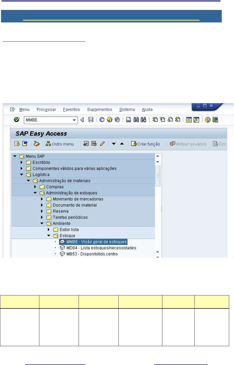 <p>Curso Prático de MM – Aula 4</p><p>Sites: www.grandesprojetos.com www.juliobattisti.com.br</p><p>Página 1 – Última Atualização – 06.07.2021</p><p>Proibido o uso deste material em sala de aula e em treinamentos sem autorização do autor.</p><p>Aula 4 – Exibir Síntese dos Estoques – mmbe</p><p>Exibir Síntese dos Estoques - mmbe</p><p> O que é: Uma visualização rápida do nível de estoques nos Centros.</p><p> Quando usar: Na Síntese dos Estoques você visualiza a quantidade em estoque</p><p>do material disponível por centro, depósito, lote e também por empresa e</p><p>estoques especiais;</p><p> Como Fazer: O código da transação é: mmbe</p><p>Copyright by SAP AG</p><p>Figura – Visão Geral de Estoques - mmbe</p><p>Campo Valor 1 Valor 2 Valor 3 Valor 4 Valor 5</p><p>Material 400-400,</p><p>400-430,</p><p>100-100</p><p>n-2110 e</p><p>300-200</p><p>m-01,</p><p>m-10.. m-15</p><p>400-512,</p><p>400-430</p><p>300-200,</p><p>1300-100</p><p>Curso Prático de MM – Aula 4</p><p>Sites: www.grandesprojetos.com www.juliobattisti.com.br</p><p>Página 2 – Última Atualização – 06.07.2021</p><p>Proibido o uso deste material em sala de aula e em treinamentos sem autorização do autor.</p><p>Copyright by SAP AG</p><p>Figura – Delimitações do Banco de Dados</p><p>Em seguida você pode pesquisar por material, por centro (Empresa) ou por</p><p>depósito. Você pode preencher apenas uma ou várias informações</p><p>simultaneamente. Por exemplo, caso queira pesquisar um determinado material</p><p>numa unidade empresarial num determinado depósito.</p><p>Copyright by SAP AG</p><p>Figura – Botão Executar</p><p>Após preencher estas informações você clica no botão executar ou dá um F8.</p><p>Curso Prático de MM – Aula 4</p><p>Sites: www.grandesprojetos.com www.juliobattisti.com.br</p><p>Página 3 – Última Atualização – 06.07.2021</p><p>Proibido o uso deste material em sala de aula e em treinamentos sem autorização do autor.</p><p>Copyright by SAP AG</p><p>Figura – Visão Geral de Estoques</p><p>Será exibida a tela Síntese dos Estoques. Para visualizar um item em “detalhes”</p><p>você dá um duplo clique no item. Caso o item esteja com o status “reservado”</p><p>também aparecerá.</p><p>Copyright by SAP AG</p><p>Figura – Lista Básica</p><p>Curso Prático de MM – Aula 4</p><p>Sites: www.grandesprojetos.com www.juliobattisti.com.br</p><p>Página 4 – Última Atualização – 06.07.2021</p><p>Proibido o uso deste material em sala de aula e em treinamentos sem autorização do autor.</p><p>Copyright by SAP AG</p><p>Figura – Visão Geral de Estoques – Seleção de Material</p><p>Copyright by SAP AG</p><p>Figura – Botão Seleção Nova</p><p>Copyright by SAP AG</p><p>Figura – Outro Material – Visão Geral de Estoques</p><p>Curso Prático de MM – Aula 4</p><p>Sites: www.grandesprojetos.com www.juliobattisti.com.br</p><p>Página 5 – Última Atualização – 06.07.2021</p><p>Proibido o uso deste material em sala de aula e em treinamentos sem autorização do autor.</p><p>Copyright by SAP AG</p><p>Figura – Menu Ambiente – Pedidos Pendentes</p><p>Copyright by SAP AG</p><p>Figura – Documentos de Compra para Material</p><p>Copyright by SAP AG</p><p>Figura – Menu Ambiente / Movimentos de Mercadorias</p><p>Curso Prático de MM – Aula 4</p><p>Sites: www.grandesprojetos.com www.juliobattisti.com.br</p><p>Página 6 – Última Atualização – 06.07.2021</p><p>Proibido o uso deste material em sala de aula e em treinamentos sem autorização do autor.</p><p>Copyright by SAP AG</p><p>Figura – Lista de Documentos de Material</p><p>Dica: Para complementar a visualização também existe o menu “Suplementos”. Ao</p><p>clicar com botão direito em cima do Depósito também irá aparecer uma lista</p><p>suspensa com diversas opções.</p><p>Copyright by SAP AG</p><p>Figura – Suplementos – Exibir Material</p><p>Curso Prático de MM – Aula 4</p><p>Sites: www.grandesprojetos.com www.juliobattisti.com.br</p><p>Página 7 – Última Atualização – 06.07.2021</p><p>Proibido o uso deste material em sala de aula e em treinamentos sem autorização do autor.</p><p>Copyright by SAP AG</p><p>Figura – Lista Suspensa - Depósito</p><p>Visão Geral do Ambiente de Negócios:</p><p>Neste item você pode realizar uma pesquisa por material, por centro (Empresa) ou</p><p>por depósito. Você pode preencher apenas uma ou várias informações</p><p>simultaneamente. Por exemplo, caso queira pesquisar um determinado material</p><p>numa unidade empresarial num determinado depósito.</p>