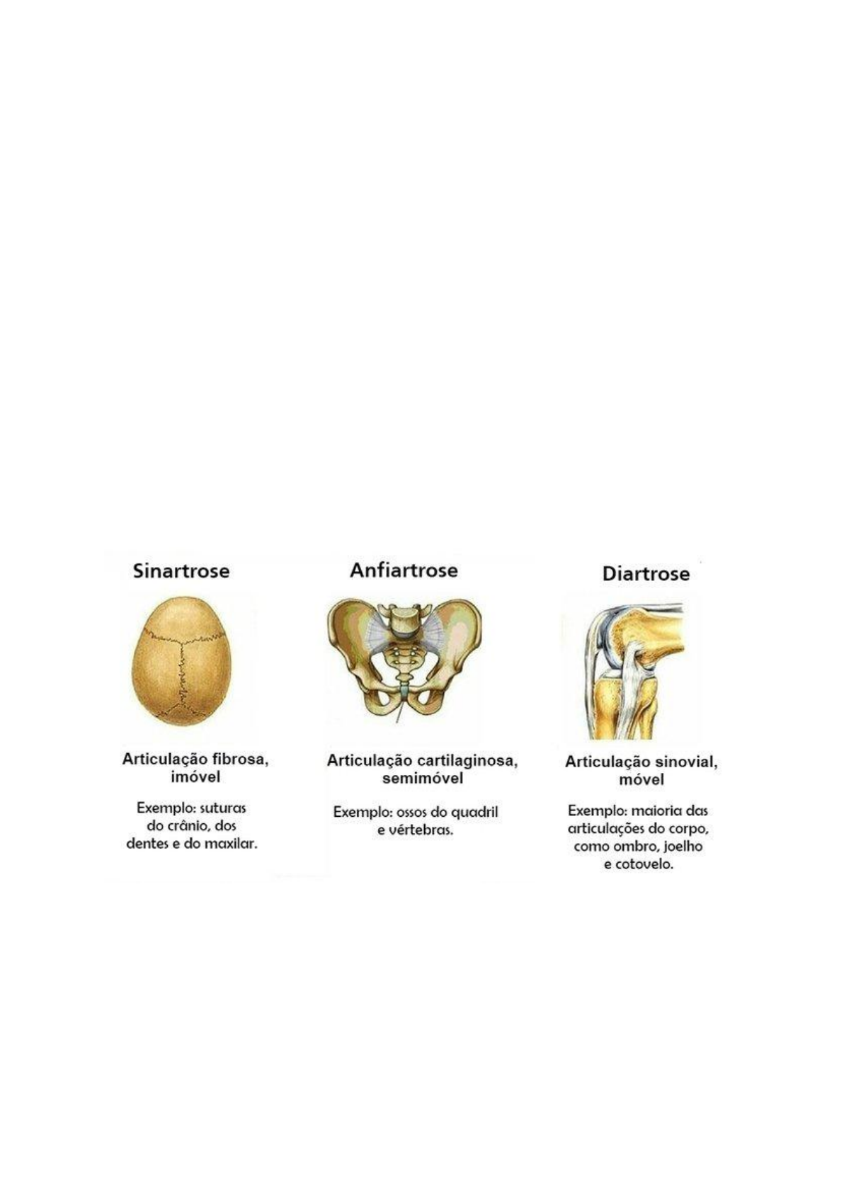 <p>ARTICULAÇÕES</p><p>Articulações são as junções entre dois ou mais ossos. Algumas articulações normalmente não se</p><p>movem, como as localizadas entre as placas do crânio. Outras articulações permitem uma ampla e</p><p>complexa gama de movimentos.</p><p>A configuração de uma articulação determina o grau e o sentido do movimento possível. Por exemplo,</p><p>as articulações do ombro, que têm um formato de esfera e soquete, permitem rotações para dentro e para</p><p>fora, bem como os movimentos dos braços para frente, para trás e para os lados. As articulações</p><p>dobradiças dos joelhos, dedos das mãos e dedos dos pés permitem apenas dobrar (flexão) e abrir</p><p>(extensão) os dedos.EO</p><p>Os componentes das articulações proporcionam estabilidade e reduzem o risco de danos por uso</p><p>constante. Em uma articulação, as extremidades dos ossos são cobertas por cartilagem. Cartilagem é um</p><p>tecido liso, resistente, elástico e protetor composto por colágeno, água e proteoglicanos que reduz o atrito</p><p>durante o movimento das articulações. (O colágeno é um tecido fibroso resistente e os proteoglicanos são</p><p>substâncias que ajudam a dar resistência à cartilagem.)</p><p>As articulações também têm um revestimento (tecido sinovial) que as envolve para formar a cápsula</p><p>articular. As células do tecido sinovial produzem uma pequena quantidade de líquido claro (líquido</p><p>sinovial) que nutre a cartilagem e reduz ainda mais o atrito, facilitando o movimento.</p><p>Classificação das articulações</p><p>Existem diferentes formas de classificar uma articulação, sendo a mais comum a classificação que utiliza</p><p>como critério o material encontrado entre os ossos. De acordo com esse critério, podemos dividi-las em:</p><p>- Sinartrose: Também chamada de articulação fibrosa ou articulação imóvel, ela possui pequena</p><p>separação com tecido conjuntivo fibroso entre os ossos. Seu papel principal é proporcionar a absorção de</p><p>choque.</p><p>A articulação fibrosa pode ser classificada em dois tipos: suturas e sindesmoses. As suturas são aquelas</p><p>articulações encontradas nos ossos do crânio. Já a sindesmose é aquela encontrada entre a tíbia e a</p><p>fíbula.</p><p>- Anfiartrose: Também chamada de articulação cartilaginosa ou articulação semimóvel, ela apresenta</p><p>tecido cartilaginoso entre os ossos, que pode ser do tipo hialino ou fibroso. Quando a cartilagem é hialina,</p><p>a articulação recebe o nome de sincondrose e, quando a cartilagem é fibrosa, recebe a denominação de</p><p>sínfise. As articulações cartilaginosas são encontradas nos ossos do quadril e entre as vértebras.</p><p>- Diartrose: Nessa articulação, também chamada de sinovial ou móvel, observa-se o livre deslizamento</p><p>entre a superfície de um osso e outro em virtude da presença de um líquido denominado de sinovial.</p><p>Diferentemente das outras formas de articulação, as peças articuladas unem-se por meio da cápsula</p><p>articular, onde o líquido está localizado.</p><p>Vale salientar que as articulações sinoviais podem ser classificadas de acordo com a capacidade de</p><p>movimentação que possuem. Se elas se movem em apenas um eixo de rotação, recebem o nome de</p><p>uniaxiais; se possuem dois eixos, são chamadas de biaxiais; e se possuem três eixos, recebem o nome</p><p>de poliaxiais.</p><p>As articulações sinoviais movem-se de várias maneiras. Entre os movimentos realizados por esse tipo</p><p>de articulação, podemos citar a flexão, extensão, abdução, adução, rotação, pronação, inversão, refração,</p><p>elevação e depressão.</p><p>Principais Articulações e Movimentos</p><p>Conheça algumas das principais articulações do corpo humano e o movimento que realizam.</p><p>Articulações do Crânio</p><p>Os ossos do crânio estão ligados de forma que não permitem movimentos. É formado por articulações</p><p>fixas ou suturas, caracterizando a sinartrose.</p><p>Outro exemplo é a articulação entre as costelas e o osso esterno, a movimentação quase não ocorre.</p><p>Articulações do Ombro</p><p>As articulações do ombro são Glenoumeral, Acromioclavicular e Esternoclavicular. Em conjunto, elas</p><p>permitem os movimentos de deslizamento, adução e abdução, flexão e extensão, rotação e circundução.</p><p>É comum ocorrer luxações no ombro, que é quando ele se desloca. A causa mais comum é durante a</p><p>prática de determinados esportes, como natação, basquete e vôlei, ou devido a algum acidente.</p><p>Articulações do Cotovelo</p><p>As articulações do cotovelo são responsáveis pela movimentação do antebraço.</p><p>As articulações do cotovelo são: Úmero-ulnar, Úmero-radial e Rádio-ulnar proximal. Elas possibilitam</p><p>movimentos de flexão e extensão.</p><p>Ela faz a ligação entre o braço e o antebraço, sendo fundamental para sua movimentação pois funciona</p><p>como uma espécie de dobradiça.</p><p>Articulações do Punho e Mão</p><p>As articulações da mão permitem a movimentação dos dedos</p><p>As articulações do punho e da mão são: Rádio-ulnar distal, Rádiocárpica, Carpometacarpiana,</p><p>Metacarpofalangiana, Interfalângicas.</p><p>Elas permitem movimentos de adução, abdução, flexão, extensão e deslizamento. Em conjunto, são</p><p>responsáveis pela movimentação do punho e dos dedos.</p><p>Articulações do Quadril</p><p>As articulações do quadril são: Sacroilíaca e Coxofemoral. A articulação sacroilíaca só realiza o</p><p>movimento de deslizamento.</p><p>Os movimentos realizados pela coxofemoral são abdução e adução, flexão e extensão, rotação e</p><p>circundação.</p><p>Articulações do Joelho</p><p>A articulação do joelho possui elementos que ajudam na estabilização do corpo</p><p>As articulações do joelho são: Patelo-femoral, Tíbio-femoral e Tíbio-f
