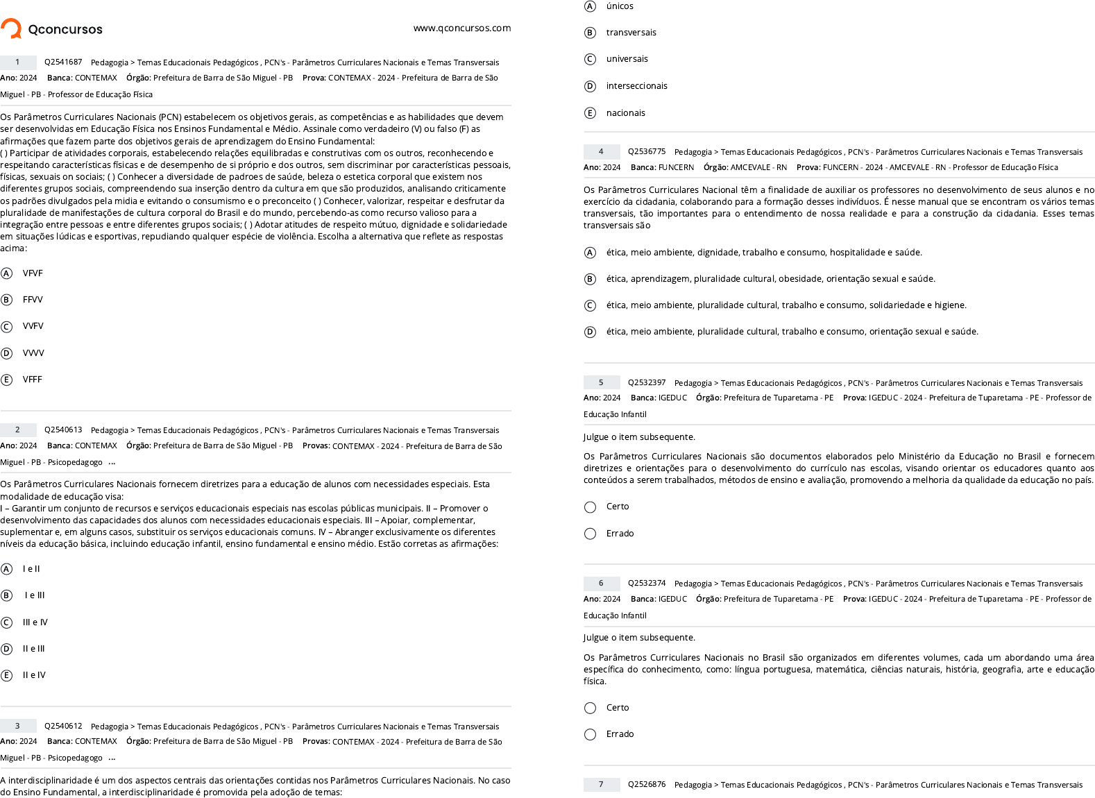 <p>www.qconcursos.com</p><p>Ano: 2024 Banca: CONTEMAX Órgão: Prefeitura de Barra de São Miguel - PB</p><p>Os Parâmetros Curriculares Nacionais (PCN) estabelecem os objetivos gerais, as competências e as habilidades que devem</p><p>ser desenvolvidas em Educação Física nos Ensinos Fundamental e Médio. Assinale como verdadeiro (V) ou falso (F) as</p><p>a�rmações que fazem parte dos objetivos gerais de aprendizagem do Ensino Fundamental:</p><p>( ) Participar de atividades corporais, estabelecendo relações equilibradas e construtivas com os outros, reconhecendo e</p><p>respeitando características físicas e de desempenho de si próprio e dos outros, sem discriminar por características pessoais,</p><p>físicas, sexuais on sociais; ( ) Conhecer a diversidade de padroes de saúde, beleza o estetica corporal que existem nos</p><p>diferentes grupos sociais, compreendendo sua inserção dentro da cultura em que são produzidos, analisando criticamente</p><p>os padrões divulgados pela midia e evitando o consumismo e o preconceito ( ) Conhecer, valorizar, respeitar e desfrutar da</p><p>pluralidade de manifestações de cultura corporal do Brasil e do mundo, percebendo-as como recurso valioso para a</p><p>integração entre pessoas e entre diferentes grupos sociais; ( ) Adotar atitudes de respeito mútuo, dignidade e solidariedade</p><p>em situações lúdicas e esportivas, repudiando qualquer espécie de violência. Escolha a alternativa que re�ete as respostas</p><p>acima:</p><p>A VFVF</p><p>B FFVV</p><p>C VVFV</p><p>D VVVV</p><p>E VFFF</p><p>Ano: 2024 Banca: CONTEMAX Órgão: Prefeitura de Barra de São Miguel - PB</p><p>Os Parâmetros Curriculares Nacionais fornecem diretrizes para a educação de alunos com necessidades especiais. Esta</p><p>modalidade de educação visa:</p><p>I – Garantir um conjunto de recursos e serviços educacionais especiais nas escolas públicas municipais. II – Promover o</p><p>desenvolvimento das capacidades dos alunos com necessidades educacionais especiais. III – Apoiar, complementar,</p><p>suplementar e, em alguns casos, substituir os serviços educacionais comuns. IV – Abranger exclusivamente os diferentes</p><p>níveis da educação básica, incluindo educação infantil, ensino fundamental e ensino médio. Estão corretas as a�rmações:</p><p>A I e II</p><p>B I e III</p><p>C III e IV</p><p>D II e III</p><p>E II e IV</p><p>Ano: 2024 Banca: CONTEMAX Órgão: Prefeitura de Barra de São Miguel - PB</p><p>A interdisciplinaridade é um dos aspectos centrais das orientações contidas nos Parâmetros Curriculares Nacionais. No caso</p><p>do Ensino Fundamental, a interdisciplinaridade é promovida pela adoção de temas:</p><p>1 Q2541687 >Pedagogia Temas Educacionais Pedagógicos , PCN's - Parâmetros Curriculares Nacionais e Temas Transversais</p><p>Prova: CONTEMAX - 2024 - Prefeitura de Barra de São</p><p>Miguel - PB - Professor de Educação Física</p><p>2 Q2540613 >Pedagogia Temas Educacionais Pedagógicos , PCN's - Parâmetros Curriculares Nacionais e Temas Transversais</p><p>Provas: CONTEMAX - 2024 - Prefeitura de Barra de São</p><p>Miguel - PB - Psicopedagogo ...</p><p>3 Q2540612 >Pedagogia Temas Educacionais Pedagógicos , PCN's - Parâmetros Curriculares Nacionais e Temas Transversais</p><p>Provas: CONTEMAX - 2024 - Prefeitura de Barra de São</p><p>Miguel - PB - Psicopedagogo ...</p><p>A únicos</p><p>B transversais</p><p>C universais</p><p>D interseccionais</p><p>E nacionais</p><p>Ano: 2024 Banca: FUNCERN Órgão: AMCEVALE - RN</p><p>Os Parâmetros Curriculares Nacional têm a �nalidade de auxiliar os professores no desenvolvimento de seus alunos e no</p><p>exercício da cidadania, colaborando para a formação desses indivíduos. É nesse manual que se encontram os vários temas</p><p>transversais, tão importantes para o entendimento de nossa realidade e para a construção da cidadania. Esses temas</p><p>transversais são</p><p>A ética, meio ambiente, dignidade, trabalho e consumo, hospitalidade e saúde.</p><p>B ética, aprendizagem, pluralidade cultural, obesidade, orientação sexual e saúde.</p><p>C ética, meio ambiente, pluralidade cultural, trabalho e consumo, solidariedade e higiene.</p><p>D ética, meio ambiente, pluralidade cultural, trabalho e consumo, orientação sexual e saúde.</p><p>Ano: 2024 Banca: IGEDUC Órgão: Prefeitura de Tuparetama - PE</p><p>Julgue o item subsequente.</p><p>Os Parâmetros Curriculares Nacionais são documentos elaborados pelo Ministério da Educação no Brasil e fornecem</p><p>diretrizes e orientações para o desenvolvimento do currículo nas escolas, visando orientar os educadores quanto aos</p><p>conteúdos a serem trabalhados, métodos de ensino e avaliação, promovendo a melhoria da qualidade da educação no país.</p><p>Certo</p><p>Errado</p><p>Ano: 2024 Banca: IGEDUC Órgão: Prefeitura de Tuparetama - PE</p><p>Julgue o item subsequente.</p><p>Os Parâmetros Curriculares Nacionais no Brasil são organizados em diferentes volumes, cada um abordando uma área</p><p>especí�ca do conhecimento, como: língua portuguesa, matemática, ciências naturais, história, geogra�a, arte e educação</p><p>física.</p><p>Certo</p><p>Errado</p><p>4 Q2536775 >Pedagogia Temas Educacionais Pedagógicos , PCN's - Parâmetros Curriculares Nacionais e Temas Transversais</p><p>Prova: FUNCERN - 2024 - AMCEVALE - RN - Professor de Educação Física</p><p>5 Q2532397 >Pedagogia Temas Educacionais Pedagógicos , PCN's - Parâmetros Curriculares Nacionais e Temas Transversais</p><p>Prova: IGEDUC - 2024 - Prefeitura de Tuparetama - PE - Professor de</p><p>Educação Infantil</p><p>6 Q2532374 >Pedagogia Temas Educacionais Pedagógicos , PCN's - Parâmetros Curriculares Nacionais e Temas Transversais</p><p>Prova: IGEDUC - 2024 - Prefeitura de Tuparetama - PE - Professor de</p><p>Educação Infantil</p><p>7 Q2526876 >Pedagogia Temas Educacionais Pedagógicos , PCN's - Parâmetros Curriculares Na