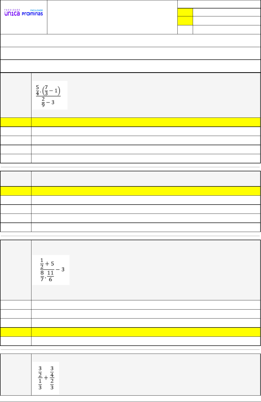 <p>Pincel Atômico - 08/09/2024 13:37:33 1/3</p><p>ANA GABRIELA</p><p>RODRIGUES DE BRITO</p><p>Exercício Caminho do Conhecimento - Etapa 6 (19805)</p><p>Atividade finalizada em 08/09/2024 13:36:55 (2559254 / 1)</p><p>LEGENDA</p><p>Resposta correta na questão</p><p># Resposta correta - Questão Anulada</p><p>X Resposta selecionada pelo Aluno</p><p>Disciplina:</p><p>FUNDAMENTOS DA MATEMÁTICA [1270434] - Avaliação com 8 questões, com o peso total de 1,67 pontos [capítulos - 3]</p><p>Turma:</p><p>Segunda Graduação: Segunda Graduação 6 meses - Licenciatura em Matemática - Grupo: FPD-AGO/2024 - SGegu0A180824 [139915]</p><p>Aluno(a):</p><p>91663866 - ANA GABRIELA RODRIGUES DE BRITO - Respondeu 5 questões corretas, obtendo um total de 1,04 pontos como nota</p><p>[360845_170584]</p><p>Questão</p><p>001</p><p>Encontre o valor da expressão numérica.</p><p>Marque a alternativa correspondente ao valor correto.</p><p>X - 3/5</p><p>5/4</p><p>- 25/9</p><p>- 5/3</p><p>5/3</p><p>[360846_170532]</p><p>Questão</p><p>002</p><p>(PUC – RJ- Adaptado) A soma 1,3333... + 0,1666666... – 0,5252... é igual a:</p><p>X 193/198</p><p>297/198</p><p>52/99</p><p>245/198</p><p>132/99</p><p>[360846_170531]</p><p>Questão</p><p>003</p><p>Resolva a seguinte expressão numérica, e assinale a alternativa que corresponde a</p><p>correta.</p><p>21/8</p><p>18/8</p><p>-18/8</p><p>-3/8</p><p>X 3/8</p><p>[360845_170527]</p><p>Questão</p><p>004</p><p>Resolva a seguinte expressão e assinale a resposta correta.</p><p>Pincel Atômico - 08/09/2024 13:37:33 2/3</p><p>9/2</p><p>45/8</p><p>36/8</p><p>X 8/9</p><p>9/8</p><p>[360845_170577]</p><p>Questão</p><p>005</p><p>1</p><p>49/5</p><p>9/5</p><p>2</p><p>X 8/15</p><p>[360845_170580]</p><p>Questão</p><p>006</p><p>(OBMEP) Um garrafão cheio de água pesa 10,8 kg. Se retirarmos metade da agua</p><p>nele contida, pesar a 5,7 kg. Quanto pesa, em gramas, esse garrafão vazio?</p><p>500.</p><p>800.</p><p>X 600.</p><p>400.</p><p>700.</p><p>[360845_170583]</p><p>Questão</p><p>007</p><p>(ENEM – 2013) Cinco empresas de gêneros alimentícios encontram-se à venda. Um</p><p>empresário, almejando ampliar os seus investimentos, deseja comprar uma dessas</p><p>empresas. Para escolher qual delas irá comprar, analisa o lucro (em milhões de</p><p>reais) de cada uma delas, em função de seus tempos (em anos) de existência,</p><p>decidindo comprar a empresa que apresente o maior lucro médio anual. O quadro</p><p>apresenta o lucro (em milhões de reais) acumulado ao longo do tempo (em anos) de</p><p>existência de cada empresa.</p><p>O empresário decidiu comprar a empresa:</p><p>H</p><p>X G</p><p>P</p><p>M</p><p>F</p><p>Pincel Atômico - 08/09/2024 13:37:33 3/3</p><p>[360846_170528]</p><p>Questão</p><p>008</p><p>Um eleitor que mora no interior percorreu 72 km para não deixar de votar. Os três</p><p>quartos iniciais do percurso foram feitos de trem e o restante a pe. Quantos</p><p>quilômetros ele percorreu de trem?</p><p>25 km</p><p>50 km</p><p>X 54 km</p><p>62 km</p><p>40 km</p>