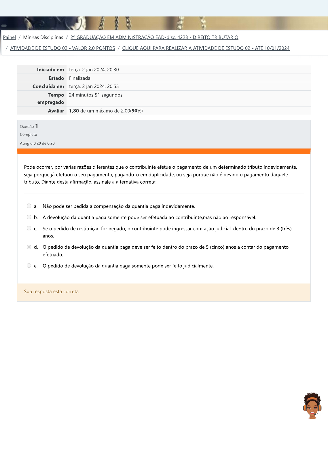 <p>Painel / Minhas Disciplinas / 2° GRADUAÇÃO EM ADMINISTRAÇÃO EAD-disc. 4223 DIREITO TRIBUTÁRIO / ATIVIDADE DE ESTUDO 02 VALOR 2,0 PONTOS / CLIQUE AQUI PARA REALIZAR A ATIVIDADE DE ESTUDO 02 - ATÉ 10/01/2024 Iniciado em terça, 2 jan 2024, 20:30 Estado Finalizada Concluída em terça, 2 jan 2024, 20:55 Tempo 24 minutos 51 segundos empregado Avaliar 1,80 de um máximo de 2,00(90%) Questão 1 Completo Atingiu 0,20 de 0,20 Pode ocorrer, por várias razões diferentes que o contribuinte efetue o pagamento de um determinado tributo indevidamente, seja porque já efetuou o seu pagamento, pagando-o em duplicidade, ou seja porque não é devido o pagamento daquele tributo. Diante desta afirmação, assinale a alternativa correta: a. Não pode ser pedida a compensação da quantia paga indevidamente. b. A devolução da quantia paga somente pode ser efetuada ao contribuinte,mas não ao responsável. C. Se o pedido de restituição for negado, o contribuinte pode ingressar com ação judicial, dentro do prazo de 3 (três) anos. d. pedido de devolução da quantia paga deve ser feito dentro do prazo de 5 (cinco) anos a contar do pagamento efetuado. e. pedido de devolução da quantia paga somente pode ser feito judicialmente. Sua resposta está correta.</p><p>Questão 2 Completo Atingiu 0,20 de 0,20 Com a suspensão, um crédito tributário não é exigido enquanto perdurar o prazo estabelecido de acordo com a espécie de suspensão, o que não significa que o crédito tributário não exista mais. Diante desta afirmação, assinale a alternativa correta: a. A suspensão do crédito tributário não impede a sua constituição, porém implica no curso da prescrição b. A suspensão do crédito tributário importa na sua desconstituição. C. As hipóteses que acarretam a suspensão do crédito tributário enumeradas no Código Tributário Nacional são exemplificativas. d. Pode-se entender por suspensão do crédito tributário, a paralisação de seus efeitos. e. A suspensão do crédito tributário impede que o contribuinte obtenha uma certidão negativa com efeitos positivos. Sua resposta está correta. Questão 3 Completo Atingiu 0,00 de 0,20 responsável pelo pagamento de um tributo é aquela pessoa que mesmo não sendo o contribuinte, diante de disposição legal se obriga ao cumprimento de uma obrigação tributária. Diante desta afirmação, assinale a alternativa correta: a. Na responsabilidade por transferência, o ente público pode exigir o pagamento do tributo ou o cumprimento da obrigação diretamente ao seu responsável. b. Para que um terceiro assuma este encargo deve haver um nexo entre ele e o contribuinte. C. A simples extinção a sociedade empresarial ou a sua falência obriga o sócio a efetuar o pagamento dos tributos devidos. d. sócio de uma sociedade empresarial pode ser responsável pelos atos que ocorreram antes ou após de sua gestão e. A responsabilidade por sucessão se divide em reponsabilidade por terceiros e reponsabilidade por infrações. Sua resposta está incorreta.</p><p>Questão 4 Completo Atingiu 0,20 de 0,20 Existem dois tipos de infrações tributárias, as administrativas e as que são definidas como crime. Diante desta afirmação, pode- se afirmar que: a. Em se tratando de responsabilidade penal, não é necessário que o sujeito tenha a intenção de praticar o ato definido como crime b. As infrações administrativas decorrem do não cumprimento de uma obrigação tributária principal e, não de uma obrigação acessória. C. pagamento integral do débito não acarreta a extinção da punibilidade. d. Ao cometer uma infração administrativa, o infrator responde pelos seus atos somente se tiver tido a intenção de praticar o crime. e. A infração penal em direito tributário é aquela definida em lei como crime contra a ordem tributária. Sua resposta está correta. Questão 5 Completo Atingiu 0,20 de 0,20 Pode o sujeito passivo efetuar o pagamento do tributo devido, acrescido dos juros e da correção monetária antes mesmo do início do processo de fiscalização. É o que se denomina de denúncia espontânea. É correto afirmar que: a. Efetuado o pagamento e apresentado o respectivo recibo de pagamento à autoridade competente, é dever, ainda, do sujeito passivo deverá efetuar o pagamento da multa tributária. b. A fiscalização tributária tem início com a denúncia espontânea. C. Pode o sujeito passivo efetuar o pagamento após o recebimento da notificação, sendo este ato definido como denúncia espontânea. d. O parcelamento do débito suspende a punibilidade, não isentando o contribuinte do pagamento da multa. e. Em se tratando de confissão de dívida, o sujeito passivo está dispensado do pagamento da multa devida. Sua resposta está correta.</p><p>Questão 6 Completo Atingiu 0,20 de 0,20 A extinção do crédito tributário acarreta a extinção da obrigação tributária, não sendo mais devido o seu pagamento. Acerca da extinção do crédito tributário, assinale a alternativa correta: a. Pela transação, as partes são credoras e devedoras, uma da outra, ao mesmo tempo. b. A remissão consiste em um ato do ente tributante que perdoa o pagamento da dívida principal, de forma total ou parcial. C. Pela consignação em pagamento, o credor decide receber coisa diversa da avençada, extinguindo a obrigação tributária. d. pagamento de uma penalidade não elide o pagamento da obrigação tributária principal. e. A noção de compensação tem origem no direito civil e traduz a ideia de que mediante concessões recíprocas, credor e devedor termo a uma obrigação tributária. Sua resposta está correta. Questão 7 Completo Atingiu 0,20 de 0,20 Esta modalidade de suspensão do crédito tributário independe do tipo de lançamento e, pode ocorrer judicialmente ou administrativamente e se trata de um procedimento adotado quando o contribuinte não concorda com o valor do lançamento. Trata-se da: a. Transação. b. Rec