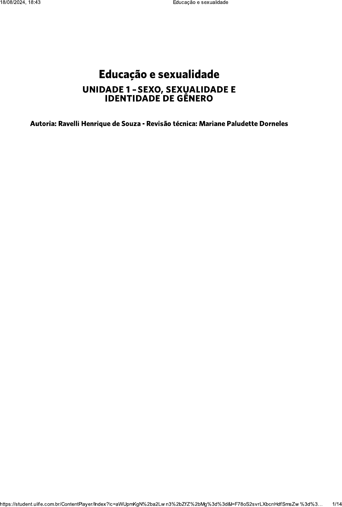 <p>18/08/2024, 18:43 Educação e sexualidade Educação e sexualidade UNIDADE 1 - SEXO, SEXUALIDADE E IDENTIDADE DE GÊNERO Autoria: Ravelli Henrique de Souza - Revisão técnica: Mariane Paludette Dorneles 1/14</p><p>18/08/2024, 18:43 Educação e sexualidade Introdução Para compreendermos as identidades de gênero, sexo e sexualidade é preciso entender que a subjetividade humana está relacionada à construção e à reconstrução de si e do outro, pois partilhamos a produção do imaginário simbólico em diversos níveis, da forma que, do ponto de vista estrutural, somos internamente parecidos e também partilhamos uma linguagem comum em nosso meio de comunicação. A linguagem como composição do plano simbólico faz parte de uma universalização comum que sentimos e compartilhamos em conjunto a ponto de não ignorar as subjetividades, incorporando todas as dimensões do ser, do sentir e do saber. Tendo isso em tempos ditos contemporâneos, reproduzimos as práticas medievais em relação às subjetividades e aos corpos ordenados e hierarquizados a partir de aparências físicas, distinguindo os sujeitos. Esse processo nega os direitos igualitários em relação às questões de gênero, de sexo e de sexualidade. Mediante essas considerações sociais, esta unidade tem o objetivo de esclarecer conceitos e refletir sobre as relações de sexo, gênero e sexualidade no ambiente escolar por meio da linguagem e de suas políticas exclusivas e inclusivas com base nos questionamentos: que precisamos compreender conceitualmente sobre sexo biológico? De onde surgiu a história do sexo e da sexualidade? Quais são as manifestações da sexualidade e da heteronormatividade ao longo da vida? Como entendemos as identidades de gênero e suas subjetividades na sociedade contemporânea? A fim de responder a tais indagações nos tópicos a seguir, desejo a você, estudante, bons estudos! 1.1 que precisamos compreender conceitualmente sobre sexo biológico? No que se refere à definição de sexo, este se caracteriza por determinismo biológico, de modo que, no momento do nascimento, são estabelecidos os genótipos que você poderá ver a seguir. XX Para fêmeas. XY Para machos. No caso dos machos, os indivíduos têm o gameta (células sexuais) menor e a determinação do genótipo ocorre no momento da união dos gametas, formando o zigoto, que, em geral, movimentam-se e produzem espermatozoides. Já nas fêmeas, o gameta costuma ser maior e possui incapacidade de movimentos. Assim: 2/14</p><p>18/08/2024, 18:43 Educação e sexualidade sexo biológico é determinado no nascimento e se refere às características genotípicas e fenotípicas do corpo. Pode-se nascer homem ou mulher e, excepcionalmente, hermafrodita, sendo o hermafroditismo uma anomalia genética rara em que ambos os órgãos genitais, masculino e feminino, estão presentes. (TAQUETTE, 2015, p. 52) A palavra "hermafrodita" é um conceito antigo, utilizado para diminuir pessoas consideradas cientificamente como intersexo; ou seja, esse termo é empregado para justificar diversificadas condições em que [...] uma pessoa nasce com uma anatomia reprodutiva ou sexual que não parece caber as definições típicas de fêmea ou de macho. Por exemplo, uma pessoa pode ter nascido parecendo ser do sexo feminino do lado de fora, mas tendo principalmente anatomia masculina típica no interior. Ou uma pessoa pode nascer com órgãos genitais que parecem estar entre os tipos habituais do sexo masculino e feminino - por exemplo, uma menina pode nascer com um clitóris notoriamente grande, ou sem uma abertura vaginal, ou um menino pode nascer com um pênis, principalmente pequeno, ou com um escroto que é dividido de forma que se formou mais como lábios. Ou uma pessoa pode nascer com genética do mosaico, de modo que algumas de suas células têm cromossomos XX e algumas têm XY (SOUZA; 2017, p. 2) Assim, nas lentes de Foucault (2015), a partir do final do século 17 e início do 18, caracterizados como da Repressão" ganharam força os discursos opressores e binários, que categorizam as subjetividades humanas em uma organização binária, limitada ao conceito de sexo biológico, categorizado por ideais de ser macho e fêmea Em outras palavras, é possível dizer que, por meio dos inúmeros discursos que constituem o sujeito, a subjetividade é fruto de processos históricos e discursivos que naturalizam os diferentes modos de enunciação. Figura 1 Representação dos sexos, masculino, feminino e intersexo Fonte: Mantinov, Shutterstock, 2020. #PraCegoVer: a figura mostra um par de sapatos preto diante de uma encruzilhada sobre qual decisão tomar a respeito do gênero: homem, mulher ou intersexual. Para melhor esclarecimento, assim como Foucault não pretendemos "[...] afirmar que o sexo não tenha sido proibido, bloqueado, mascarado ou desconhecido desde a época clássica; nem mesmo afirmamos que a partir daí ele o tenha sido menos do que antes" (FOUCAULT, 2015a, p. 17). Também como Silva (2017), consideramos que o sexo deve ser entendido como uma categoria social, econômica e política de poder, sendo necessário reescrever sua história a partir de elementos culturais fundamentais que não sejam pautados na pastoral cristã. 3/14</p><p>18/08/2024, 18:43 Educação e sexualidade Desse modo, é preciso entender as sexualidades a partir da vontade de ser e saber, para não nos determos a tabus violentadores que deslegitimam a sexualidade como uma ciência construída social e culturalmente (SOUZA; OLIVEIRA; CALSA, 2020). 1.2 A história do sexo e da sexualidade: interesse e influências da pastoral cristã Pelas proposições de Foucault (2015), tem-se os impactos da instituição pastoral a partir do século 18, com forte repressão sobre o sexo e a sexualidade de homens e mulheres por meio da institucionalização do mecanismo da confissão. Como uma das estratégias de poder, a confissão contribuiu para a definição de indiví