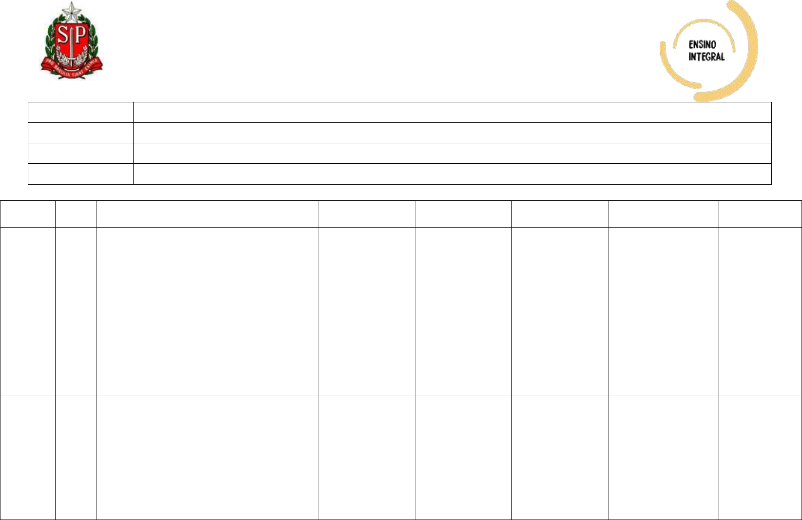 <p>E.E. PEI PROFESSOR MARIO BOMBASSEI FILHO</p><p>Plano de Aula Mensal – Formação Geral Básica – 2024</p><p>Ano/série 6º Ano</p><p>Turno Integral</p><p>Período 2 a 30 de Setembro</p><p>Bimestre 3º Bimestre</p><p>Disciplina/</p><p>Professor</p><p>DATA Habilidades Conteúdo/Objeto</p><p>Conhecimento</p><p>Recursos Didáticos Metodologia/</p><p>Estratégias</p><p>Avaliação Referências</p><p>Paulo -</p><p>Inglês</p><p>2/9 (EF06LI06) Planejar apresentação sobre a</p><p>família, a comunidade e a escola,</p><p>compartilhando-a oralmente com o grupo.</p><p>(EF06LI14) Organizar ideias, selecionando-as</p><p>em função da estrutura e do objetivo do texto.</p><p>(EF06LI16) Construir repertório relativo às</p><p>expressões usadas para o convívio social e o</p><p>uso da língua inglesa em sala de aula.</p><p>(EF06LI17) Construir repertório lexical</p><p>relativo a temas familiares (escola,</p><p>família, rotina diária, atividades de</p><p>lazer, esportes, entre outros).</p><p>(EF06LI19) Utilizar o presente do indicativo para</p><p>identificar pessoas (verbo to be) e descrever</p><p>rotinas diárias.</p><p>Estruturas: prática</p><p>he/she/it + to be +</p><p>adjective.</p><p>Escrita.</p><p>Lousa,</p><p>TV;</p><p>Notebook, Netbook.</p><p>Chromebook, Tablet;</p><p>Xerox;</p><p>Mapas mentais;</p><p>Projetor;</p><p>Caixa de som.</p><p>Anotações no</p><p>caderno;</p><p>Resolução de</p><p>exercícios, tanto</p><p>individuais quanto</p><p>em grupos;</p><p>Gamificação;</p><p>Sala de aula</p><p>invertida.</p><p>Participação e</p><p>comportamento do</p><p>estudante em sala de</p><p>aula;</p><p>Exercício escrito e oral,</p><p>tanto individual quanto</p><p>em grupo;</p><p>Avaliação Diagnóstica;</p><p>Protagonismo Juvenil;</p><p>Atividades de</p><p>Sondagens.</p><p>Repositório</p><p>CMSP Web;</p><p>Livros didáticos;</p><p>Currículo em</p><p>Ação;</p><p>Vídeo/áudio da</p><p>temática;</p><p>AULA 9- How to</p><p>plan a</p><p>presentation</p><p>(part 1) (v2)</p><p>Paulo -</p><p>Inglês</p><p>9/9 (EF06LI14) Organizar ideias, selecionando-as</p><p>em função da estrutura e do objetivo do texto.</p><p>(EF06LI15) Produzir textos escritos em língua</p><p>inglesa (histórias em quadrinhos, cartazes,</p><p>chats, blogues, agendas, fotolegendas, entre</p><p>outros), sobre si mesmo, sua família, seus</p><p>amigos, gostos, preferências e rotinas, sua</p><p>comunidade e seu contexto escolar.</p><p>(EF06LI17) Construir repertório lexical relativo a</p><p>temas familiares (escola, família, rotina diária,</p><p>atividades de lazer, esportes, entre outros).</p><p>Estruturas:</p><p>Introducing</p><p>someone special</p><p>(my best friend´s</p><p>name is ___/ He</p><p>is___).</p><p>Escrita.</p><p>Lousa,</p><p>TV;</p><p>Notebook, Netbook.</p><p>Chromebook, Tablet;</p><p>Xerox;</p><p>Mapas mentais;</p><p>Projetor;</p><p>Caixa de som.</p><p>Anotações no</p><p>caderno;</p><p>Resolução de</p><p>exercícios, tanto</p><p>individuais quanto</p><p>em grupos;</p><p>Gamificação;</p><p>Sala de aula</p><p>invertida.</p><p>Participação e</p><p>comportamento do</p><p>estudante em sala de</p><p>aula;</p><p>Exercício escrito e oral,</p><p>tanto individual quanto</p><p>em grupo;</p><p>Avaliação Diagnóstica;</p><p>Protagonismo Juvenil;</p><p>Atividades de</p><p>Sondagens.</p><p>Repositório</p><p>CMSP Web;</p><p>Livros didáticos;</p><p>Currículo em</p><p>Ação;</p><p>Vídeo/áudio da</p><p>temática;</p><p>AULA 10- How</p><p>to plan a</p><p>presentation</p><p>(part 2) (v2)</p><p>Paulo –</p><p>Inglês</p><p>16/9 (EF06LI15) Produzir textos escritos em língua</p><p>inglesa (histórias em quadrinhos, cartazes,</p><p>chats, blogues, agendas, fotolegendas, entre</p><p>outros), sobre si mesmo, sua família, seus</p><p>amigos, gostos, preferências e rotinas, sua</p><p>comunidade e seu contexto escolar.</p><p>(EF06LI17) Construir repertório lexical relativo a</p><p>temas familiares (escola, família, rotina diária,</p><p>atividades de lazer, esportes, entre outros).</p><p>Vocabulário: family</p><p>members, personal</p><p>information, action</p><p>verbs.</p><p>Estruturas:</p><p>Introducing</p><p>someone special</p><p>(my best friend´s</p><p>name is ___/ He</p><p>is___).</p><p>Escrita e Oralidade.</p><p>Lousa,</p><p>TV;</p><p>Notebook, Netbook.</p><p>Chromebook, Tablet;</p><p>Xerox;</p><p>Mapas mentais;</p><p>Projetor;</p><p>Caixa de som.</p><p>Anotações no</p><p>caderno;</p><p>Resolução de</p><p>exercícios, tanto</p><p>individuais quanto</p><p>em grupos;</p><p>Gamificação;</p><p>Sala de aula</p><p>invertida.</p><p>Participação e</p><p>comportamento do</p><p>estudante em sala de</p><p>aula;</p><p>Exercício escrito e oral,</p><p>tanto individual quanto</p><p>em grupo;</p><p>Avaliação Diagnóstica;</p><p>Protagonismo Juvenil;</p><p>Atividades de</p><p>Sondagens.</p><p>Repositório</p><p>CMSP Web;</p><p>Livros didáticos;</p><p>Currículo em</p><p>Ação;</p><p>Vídeo/áudio da</p><p>temática;</p><p>AULA 11-</p><p>Getting ready</p><p>(v2)</p><p>Paulo -</p><p>Inglês</p><p>23/9 (EF06LI05) Aplicar os conhecimentos da língua</p><p>inglesa para falar de si e de outras pessoas,</p><p>explicitando informações pessoais e</p><p>características relacionadas a gostos,</p><p>preferências e rotinas.</p><p>(EF06LI18) Reconhecer semelhanças e</p><p>diferenças na pronúncia de palavras da língua</p><p>inglesa e da língua materna e/ou outras línguas</p><p>conhecidas.</p><p>Vocabulário:</p><p>informações</p><p>pessoais.</p><p>Oralidade.</p><p>Lousa,</p><p>TV;</p><p>Notebook, Netbook.</p><p>Chromebook, Tablet;</p><p>Xerox;</p><p>Mapas mentais;</p><p>Projetor;</p><p>Caixa de som.</p><p>Anotações no</p><p>caderno;</p><p>Resolução de</p><p>exercícios, tanto</p><p>individuais quanto</p><p>em grupos;</p><p>Gamificação;</p><p>Sala de aula</p><p>invertida.</p><p>Participação e</p><p>comportamento do</p><p>estudante em sala de</p><p>aula;</p><p>Exercício escrito e oral,</p><p>tanto 