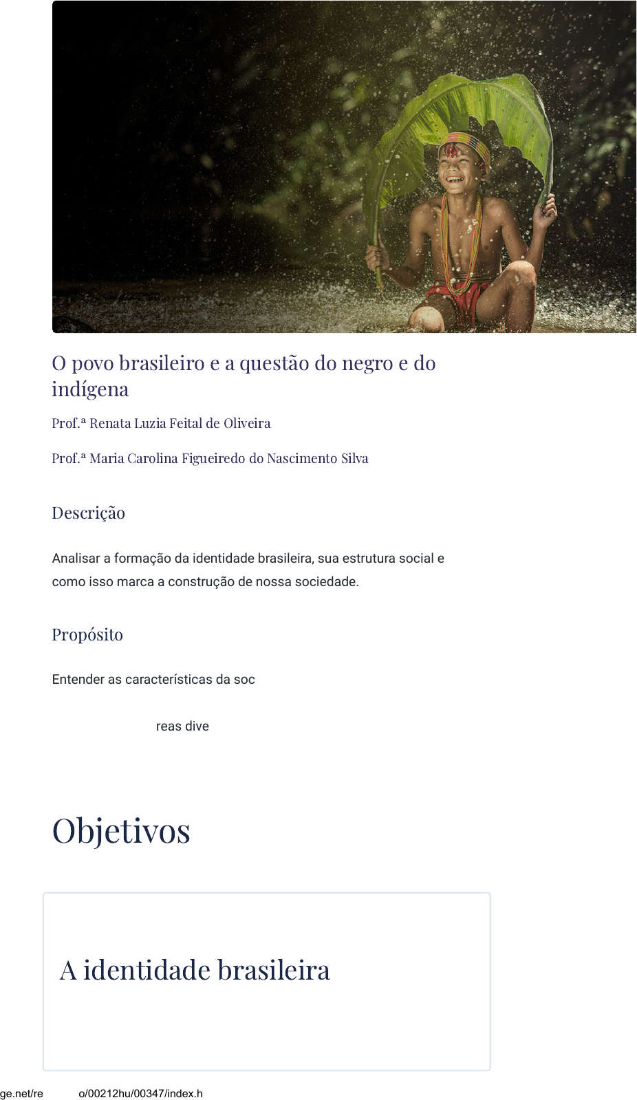 <p>O povo brasileiro e a questão do negro e do</p><p>indígena</p><p>Prof.ª Renata Luzia Feital de Oliveira</p><p>Prof.ª Maria Carolina Figueiredo do Nascimento Silva</p><p>Descrição</p><p>Analisar a formação da identidade brasileira, sua estrutura social e</p><p>como isso marca a construção de nossa sociedade.</p><p>Propósito</p><p>Entender as características da sociedade brasileira, bem como suas</p><p>potencialidades e demandas, é fundamental para o desenvolvimento de</p><p>profissionais de áreas diversas, pois esse conhecimento possibilita que</p><p>desempenhem seus papéis de forma responsável e engajada.</p><p>Objetivos</p><p>Módulo 1</p><p>A identidade brasileira</p><p>Identificar aspectos da construção da identidade brasileira.</p><p>08/09/2024, 15:32 O povo brasileiro e a questão do negro e do indígena</p><p>https://stecine.azureedge.net/repositorio/00212hu/00347/index.html?brand=wyden# 1/71</p><p>Módulo 2</p><p>Miscigenação e a explicação do</p><p>Brasil</p><p>Reconhecer as características étnicas da população brasileira.</p><p>Módulo 3</p><p>As relações étnico-raciais no</p><p>Brasil e suas distinções</p><p>Distinguir criticamente as relações étnico-raciais no Brasil.</p><p>Introdução</p><p>Estudar o povo brasileiro e a construção de suas identidades</p><p>envolve reconhecer a diversidade interna, as relações de poder e</p><p>as influências da globalização e do mundo atual. Essa</p><p>perspectiva mais ampla nos permite compreender as múltiplas</p><p>formas de pertencimento e os diferentes contextos sociais,</p><p>culturais e políticos que moldam as identidades dentro da</p><p>sociedade brasileira.</p><p>Esse assunto aparece na vida profissional de muitas formas. Por</p><p>exemplo, quando precisamos lidar com pessoas e histórias</p><p>diferentes, em entrevistas que ressaltam o valor de sua formação</p><p>cultural e em avaliações de concursos e no Exame Nacional de</p><p>Desempenho de Estudantes (Enade), em que esse debate faz</p><p>parte do conteúdo de formação geral.</p><p></p><p>08/09/2024, 15:32 O povo brasileiro e a questão do negro e do indígena</p><p>https://stecine.azureedge.net/repositorio/00212hu/00347/index.html?brand=wyden# 2/71</p><p>Material para download</p><p>Clique no botão abaixo para fazer o download do</p><p>conteúdo completo em formato PDF.</p><p>Download material</p><p>1 - A identidade brasileira</p><p>Ao �nal deste módulo, você será capaz de identi�car aspectos da</p><p>construção da identidade brasileira.</p><p>A formação da identidade</p><p>brasileira</p><p>08/09/2024, 15:32 O povo brasileiro e a questão do negro e do indígena</p><p>https://stecine.azureedge.net/repositorio/00212hu/00347/index.html?brand=wyden# 3/71</p><p>javascript:CriaPDF()</p><p>O povo brasileiro e a</p><p>questão dos negros e dos</p><p>indígenas</p><p>Assista, neste vídeo, ao professor Rodrigo Rainha mostra que a</p><p>identidade nacional brasileira tem forte marco no século XIX.</p><p>Quantas vezes ouvimos alguém dizer: “O povo brasileiro é muito</p><p>simpático, sempre alegre, disposto a ajudar”; “Cordial e festeiro como</p><p>ninguém, ele adora praia, futebol e samba”; “No Brasil, preconceito não</p><p>há! Todos os povos convivem muito bem, é uma comunhão de cores e</p><p>classes sociais”. Ou ainda: “Terra escolhida por Deus, aqui não há</p><p>desastres naturais e todo mundo convive bem e feliz”.</p><p>Diferentes pessoas ilustrando um exemplo de diversidade étnica.</p><p>Mas será essa a realidade brasileira? Talvez geograficamente estejamos</p><p>livres de alguns acidentes naturais comuns em outros países, mas as</p><p>características citadas anteriormente não retratam nossa identidade</p><p>nacional. Vale salientar que tais características fazem parte de uma</p><p>construção social reducionista a respeito da identidade brasileira.</p><p>O conceito de identidade nacional é recorrente em concursos e</p><p>avaliações nacionais. Acompanhe algumas dicas!</p><p></p><p>08/09/2024, 15:32 O povo brasileiro e a questão do negro e do indígena</p><p>https://stecine.azureedge.net/repositorio/00212hu/00347/index.html?brand=wyden# 4/71</p><p>Confira uma questão!</p><p>Identidade brasileira</p><p>O reconhecimento da</p><p>diversidade interna, seja em</p><p>espaços pequenos ou grandes,</p><p>mas sabendo que existem elos</p><p>que nos unem.</p><p>Poder</p><p>As identidades são marcadas</p><p>por poderes e privilégios em</p><p>vários graus e espaços do Brasil.</p><p>Pertencimento</p><p>Uma chave para entender</p><p>identidade é perceber que o</p><p>sujeito, a pessoa, sente-se</p><p>pertencente a um ou mais</p><p>grupos em algum grau.</p><p>08/09/2024, 15:32 O povo brasileiro e a questão do negro e do indígena</p><p>https://stecine.azureedge.net/repositorio/00212hu/00347/index.html?brand=wyden# 5/71</p><p>(Instituto AOCP – Betim – 2020)</p><p>A sociedade brasileira é formada pelo encontro de diferentes culturas. A</p><p>partir das discussões sobre a formação da cultura e identidade nacional,</p><p>assinale a alternativa correta.</p><p>A. A sociologia defende a ideia de que a discriminação é natural na</p><p>sociedade, pois cada um dos indivíduos tem o direito de gostar ou</p><p>não de outra pessoa.</p><p>B. O relativismo cultural é uma postura analítica que considera os</p><p>mitos e as narrativas folclóricas como elementos culturais</p><p>subdesenvolvidos e primitivos.</p><p>C. A sociologia afirma que os “índios de verdade” não utilizam roupas,</p><p>nem tecnologias ocidentais. Nessa perspectiva, ao adotar os</p><p>padrões civilizados de comportamentos, eles perdem sua condição</p><p>de indígena e direito às terras florestais.</p><p>D. No Brasil, o encontro entre as religiosidades dos povos africanos,</p><p>indígenas e brancos europeus não alterou as características nativas</p><p>desses povos. Por isso, não é possível afirmar a existência de 