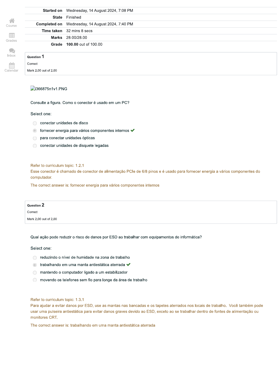 <p>Started on Wednesday, 14 August 2024, 7:08 PM State Finished Course Completed on Wednesday, 14 August 2024, 7:40 PM Time taken 32 mins 8 secs Marks 28.00/28.00 Grades Grade 100.00 out of 100.00 Inbox Question 1 Correct Calendar Mark 2.00 out of 2.00 i366875n1v1.PN Consulte a figura. Como o conector é usado em um PC? Select one: conectar unidades de disco fornecer energia para vários componentes internos para conectar unidades ópticas conectar unidades de disquete legadas Refer to curriculum topic: 1.2.1 Esse conector é chamado de conector de alimentação PCle de 6/8 pinos e é usado para fornecer energia a vários componentes do computador. The correct answer is: fornecer energia para vários componentes internos Question 2 Correct Mark 2.00 out of 2.00 Qual ação pode reduzir o risco de danos por ESD ao trabalhar com equipamentos de informática? Select one: reduzindo o nível de humidade na zona de trabalho trabalhando em uma manta antiestática aterrada mantendo o computador ligado a um estabilizador movendo os telefones sem fio para longe da área de trabalho Refer to curriculum topic: 1.3.1 Para ajudar a evitar danos por ESD, use as mantas nas bancadas e os tapetes aterrados nos locais de trabalho. Você também pode usar uma pulseira antiestática para evitar danos graves devido ao ESD, exceto ao se trabalhar dentro de fontes de alimentação ou monitores CRT. The correct answer is: trabalhando em uma manta antiestática aterrada</p><p>Question 3 Correct Mark 2.00 out of 2.00 Um administrador de rede tem atualmente três servidores e precisa adicionar um quarto, mas não tem espaço suficiente para um monitor e um teclado adicional. Qual dispositivo permite que o administrador conecte todos os servidores em um único monitor e teclado? Select one: hub PS/2 monitor touchscreen UPS switch USB switch KVM Refer to curriculum topic: 1.2.9 Um switch KVM (Keyboard, video and mouse) é um dispositivo de hardware que pode ser usado para controlar mais de um computador usando um único teclado, monitor e mouse. Switches KVM fornecem acesso eficiente para vários servidores usando um único teclado, monitor e mouse. The correct answer is: switch KVM Question 4 Correct Mark 2.00 out of 2.00 Qual fator de forma da placa-mãe tem o menor espaço para uso em dispositivos Thin Client? Select one: Mini-ATX ATX Micro-ATX ITX Refer to curriculum topic: 1.2.2 fator de forma da placa-mãe mini-ATX é o menor fator de forma (17cm X 17cm ou 6,7 polegadas X 6,7 polegadas) e é usado em clientes finos e decodificadores. The correct answer is: Mini-ATX</p><p>Question 5 Correct Mark 2.00 out of 2.00 Qual porta permite a transmissão de vídeo de alta definição usando o protocolo DisplayPort? Select one: Thunderbolt RCA DVI VGA Refer to curriculum topic: 1.2.8 A porta Thunderbolt permite a transmissão de vídeo de alta definição usando o protocolo DisplayPort. The correct answer is: Thunderbolt Question 6 Correct Mark 2.00 out of 2.00 Qual tipo de unidade de disco contém um HDD magnético com o serviço de memória flash integrado como um cache não volátil? Select one: SCSI SSD NVMe SSHD Refer to curriculum topic: 1.2.6 As unidades híbridas de estado sólido (SSHD) combinam um HDD magnético com o serviço de memória flash integrada como um cache não volátil. mas custa menos do SSD. The correct answer is: SSHD Question 7 Correct Mark 2.00 out of 2.00 Quais são os dois componentes do PC que se comunicam com a CPU pelo chipset southbridge? (Escolha duas.) Select one or more: RAM disco rígido Adaptador Ethernet gigabit de 64-bits placa de vídeo Refer to curriculum topic: 1.2.2 chipset northbridge permite que os componentes mais rápidos, como a RAM e a placa de vídeo, sejam interface com a CPU na velocidade do barramento frontal. Todos os outros componentes, como a BIOS, o disco rígido e os slots de expansão se comunicam com a CPU pelo chipset southbridge. The correct answers are: disco rígido, Adaptador Ethernet gigabit de 64-bits</p><p>Question 8 Correct Mark 2.00 out of 2.00 Como os componentes internos de um computador são protegidos contra ESD? Select one: ao desconectar o computador após o uso usando gabinetes de computador compostos de plástico ou de alumínio aterrando os componentes internos via conexão ao gabinete usando vários ventiladores para quente pelo gabinete Refer to curriculum topic: 1.1.2 Descarga eletrostática (ESD) pode ocorrer quando há acúmulo de carga elétrica (eletricidade estática) em uma superfície que entra em contato com outra. Isso pode ser mitigado ao aterrar os componentes internos do computador para o gabinete. The correct answer is: aterrando os componentes internos via conexão ao gabinete Question 9 Correct Mark 2.00 out of 2.00 Qual slot de expansão é usado por um dispositivo compatível com NVMe? Select one: PCI USB-C SATA PCle Refer to curriculum topic: 1.2.6 A especificação non-volátil Memory Express (NVMe) fornece uma interface padrão entre a unidade SSD compatível, o barramento PCle e os sistemas operacionais. The correct answer is: PCle Question 10 Correct Mark 2.00 out of 2.00 i366879n1v1.PNG Consulte a figura. Que tipo de conectado é exibido? Select one: Adaptador USB para PS/2 Molex para adaptador SATA Conversor de HDMI para VGA Adaptador DVI para HDMI Refer to curriculum topic: 1.2.8<br item exibido é um conversor de HDMI para VGA usado para converter sinais digitais em sinais analógicos. The correct answer is: Conversor de HDMI para VGA</p><p>Question 11 Correct Mark 2.00 out of 2.00 Que tipo de dispositivo de entrada pode identificar usuários com base em sua voz? Select one: dispositivo de identificação biométrica digitalizador switch KVM scanner Refer to curriculum topic: 1.2.9 Um dispositivo de identificação biométrica é um dispositivo de entrada que pode identificar um usuário com base em uma característica física única, como uma impressão digital ou voz. Um digitalizador é usado com uma caneta sty