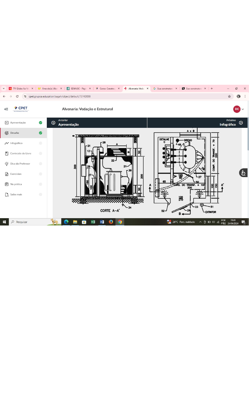 <p>Sua construtora vai participar de uma concorrência para a construção de uma subestação abrigada (baixa tensão), uma pequena edificação com as seguintes características arquitetônicas:</p><p>Dimensões = 4,10 m x 3,20 m.</p><p>Pé-direito = 3,00 m.</p><p>Viga cintamento = 10 cm x 20 cm.</p><p>Laje de cobertura = 8 cm.</p><p>Logicamente, a concessionária de energia, no projeto arquitetônico, estabelece a espessura das paredes (20 cm), mas você, pensando em utilizar alvenaria autoportante, com tijolo furado comum (resistência de 1,0 MPa, mínimo recomendado pela NBR 7171, bloco classe 10), vai conferir a espessura mínima necessária.</p><p>Parede mais solicitada: as duas com 4,10 m de comprimento (ver figura).</p><p>■ Carga do telhado: não tem.</p><p>■ Carga acidental: adotar o peso de uma pessoa, para manutenção ou limpeza: 100 kg/m2.</p><p>■ Carga de revestimento: não tem.</p><p>■ Peso próprio da laje: 2500 kg/m3 x 0,08 m (espessura da laje: 8 cm): 200 kg/m2.</p><p>■ Carregamento da laje (Q): 200 kg/m2 + 100 kg/m2: 300 kg/m2.</p><p>■ Área de influência da laje sobre a parede mais carregada (ver figura): 4 m2.</p><p>■ Reação da laje: Rl = (Q x A) / L: R = (300 kg/m2 x 4 m2) / 4,10 m: Rl = 292 kg/m.</p><p>■ Reação da viga: Rv = (b x h) x (2.500 kg/m3): Rv = (0,1 m x 0,2 m) * (2.500 kg/m3): Rv = 50 kg/m.</p><p>■ Peso próprio da parede (20 cm): para tijolo 6 furos com parede revestida nos dois lados: bloco vazado = 280 kg/m2.</p><p>■ Reação da parede: Rp = peso próprio x (pé-direito - altura viga cintamento): Rp = 280 kg/m2 x (3 m - 0,2 m): Rp = 784 kg/m.</p><p>■ Tensão admissível da alvenaria: 1,0 MPa = 101971,6 kg/m2.</p><p>■ Espessura necessária para parede: e = (somatório das reações) / (tensão admissível da alvenaria): e = (Rl + Rv + Rp) / tensão adm.: e = (292 + 50 + 784) / 101971,6: e = (1.126 kg/m) / 101971,6 kg/m2: e = 0,011 m: ou 1,1 cm.</p><p>RESPOSTA: considerando apenas a carga vertical (de compressão), sem o uso de coeficientes de segurança (majoração de cargas), 1,1 cm de espessura na parede seria suficiente para esta edificação de pequeno porte. Observe que o peso específico do concreto armado é de 2.500kg/m3</p><p>Analise as seguintes informações sobre as construções A e B:</p><p>A: tem estrutura formada por um pórtico espacial em perfis metálicos.</p><p>B: tem paredes concretadas internamente, no alinhamento de furos verticais, em pontos estratégicos, com instalação de armadura.</p><p>Pode-se concluir que:</p><p>Questão 1Escolha uma opção:</p><p>a.</p><p>B é uma obra em alvenaria de vedação.</p><p>b.</p><p>A e B são obras em alvenaria de vedação.</p><p>c.</p><p>A é uma obra em alvenaria estrutural.</p><p>d.</p><p>A é uma obra para alvenaria de vedação, e B é para alvenaria estrutural.</p><p>Alvenaria convencional fecha vãos entre elementos de um pórtico estrutural. Reforços estruturais internos, concreto mais armadura, podem ser feitos na alvenaria estrutural, que geralmente são executadas com blocos de furos verticais.</p><p>e.</p><p>A e B são obras em alvenaria estrutural.</p><p>Feedback</p><p>A resposta correta é: A é uma obra para alvenaria de vedação, e B é para alvenaria estrutural.</p><p>Questão 2</p><p>Correto</p><p>Atingiu 2,0 de 2,0</p><p>Marcar questão</p><p>Texto da questão</p><p>O uso do sistema construtivo em alvenaria estrutural se mostra muito adequado para a produção de conjuntos habitacionais no Brasil, país com alto déficit de moradias. A que essa realidade se deve?</p><p>Questão 2Escolha uma opção:</p><p>a.</p><p>Rapidez de execução, facilidade construtiva e custo final menor.</p><p>Com equipe devidamente treinada.</p><p>b.</p><p>Segurança estrutural e aparência final.</p><p>c.</p><p>Rapidez na execução e aparência final.</p><p>d.</p><p>Rapidez na execução e estanqueidade da obra.</p><p>e.</p><p>Custo final menor e segurança estrutural.</p><p>Feedback</p><p>A resposta correta é: Rapidez de execução, facilidade construtiva e custo final menor.</p><p>Questão 3</p><p>Correto</p><p>Atingiu 2,0 de 2,0</p><p>Marcar questão</p><p>Texto da questão</p><p>Nos edifícios em alvenaria estrutural, considere a opção CORRETA (possível):</p><p>Questão 3Escolha uma opção:</p><p>a.</p><p>As lajes não necessitam de nenhum escoramento durante a execução.</p><p>b.</p><p>As paredes portantes podem ser removidas sem necessidade de cuidados especiais.</p><p>c.</p><p>Uma das principais vantagens é a redução no uso de concreto e armadura, porém aumenta-se o gasto com o uso de madeira para as formas.</p><p>d.</p><p>Em projetos de alvenaria estrutural, não existem vigas e pilares de concreto armado ou perfis metálicos.</p><p>Existem pontos de reforço e amarração, com pequena seção transversal, e funções diferentes das dos pilares convencionais.</p><p>e.</p><p>Uma das funções do grauteamento é proporcionar a separação "armadura x alvenaria".</p><p>Feedback</p><p>A resposta correta é: Em projetos de alvenaria estrutural, não existem vigas e pilares de concreto armado ou perfis metálicos.</p><p>Questão 4</p><p>Correto</p><p>Atingiu 2,0 de 2,0</p><p>Marcar questão</p><p>Texto da questão</p><p>Em relação à resistência dos blocos cerâmicos para alvenaria em geral, qual opção apresenta os blocos em ordem crescente de resistência?</p><p>Questão 4Escolha uma opção:</p><p>a.</p><p>Vedação maciça, vedação furada na horizontal e estrutural furada na vertical.</p><p>b.</p><p>Estrutural furada na vertical, vedação maciça e vedação furada na horizontal.</p><p>c.</p><p>Vedação furada na horizontal, vedação maciça e estrutural furada na vertical.</p><p>Do menos resistente, vedação furado na horizontal, para o mais resistente, estrutural furado na vertical.</p><p>d.</p><p>Vedação furada na horizontal, estrutural furada na vertical e vedação furada na vertical.</p><p>e.</p><p>Vedação furada na vertical, 