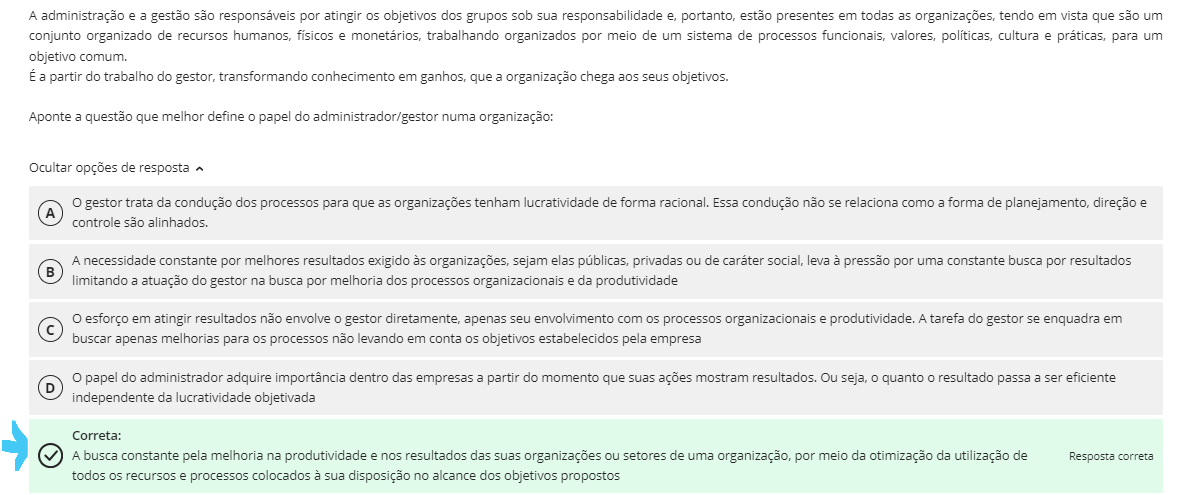 <p>A administração e a gestão são responsáveis por atingir os objetivos dos grupos sob sua responsabilidade e. portanto, estão presentes em todas as organizações, tendo em vista que são um conjunto organizado de recursos humanos, físicos e monetários, trabalhando organizados por meio de um sistema de processos funcionais, valores, políticas, cultura e práticas, para um objetivo comum. É a partir do trabalho do gestor, transformando conhecimento em ganhos, que a organização chega aos seus objetivos. Aponte a questão que melhor define papel do administrador/gestor numa organização: Ocultar opções de resposta ^ gestor trata da condução dos processos para que as organizações tenham lucratividade de forma racional. Essa condução não se relaciona como a forma de planejamento, direção e A controle são A necessidade constante por melhores resultados exigido às sejam elas públicas, privadas ou de caráter social, leva à pressão por uma constante busca por resultados B limitando a atuação do gestor na busca por melhoria dos processos organizacionais e da produtividade esforço em atingir resultados não envolve gestor diretamente, apenas seu envolvimento com os processos organizacionais e produtividade. A tarefa do gestor se enquadra em buscar apenas melhorias para os processos não levando em conta os objetivos estabelecidos pela empresa o papel do administrador adquire importância dentro das empresas a partir do momento que suas ações mostram resultados. Ou seja, quanto resultado passa a ser eficiente D independente da lucratividade objetivada Correta: A busca constante pela melhoria na produtividade e nos resultados das suas organizações ou setores de uma organização, por meio da otimização da utilização de Resposta correta todos os recursos e processos colocados à sua disposição no alcance dos objetivos propostos</p>