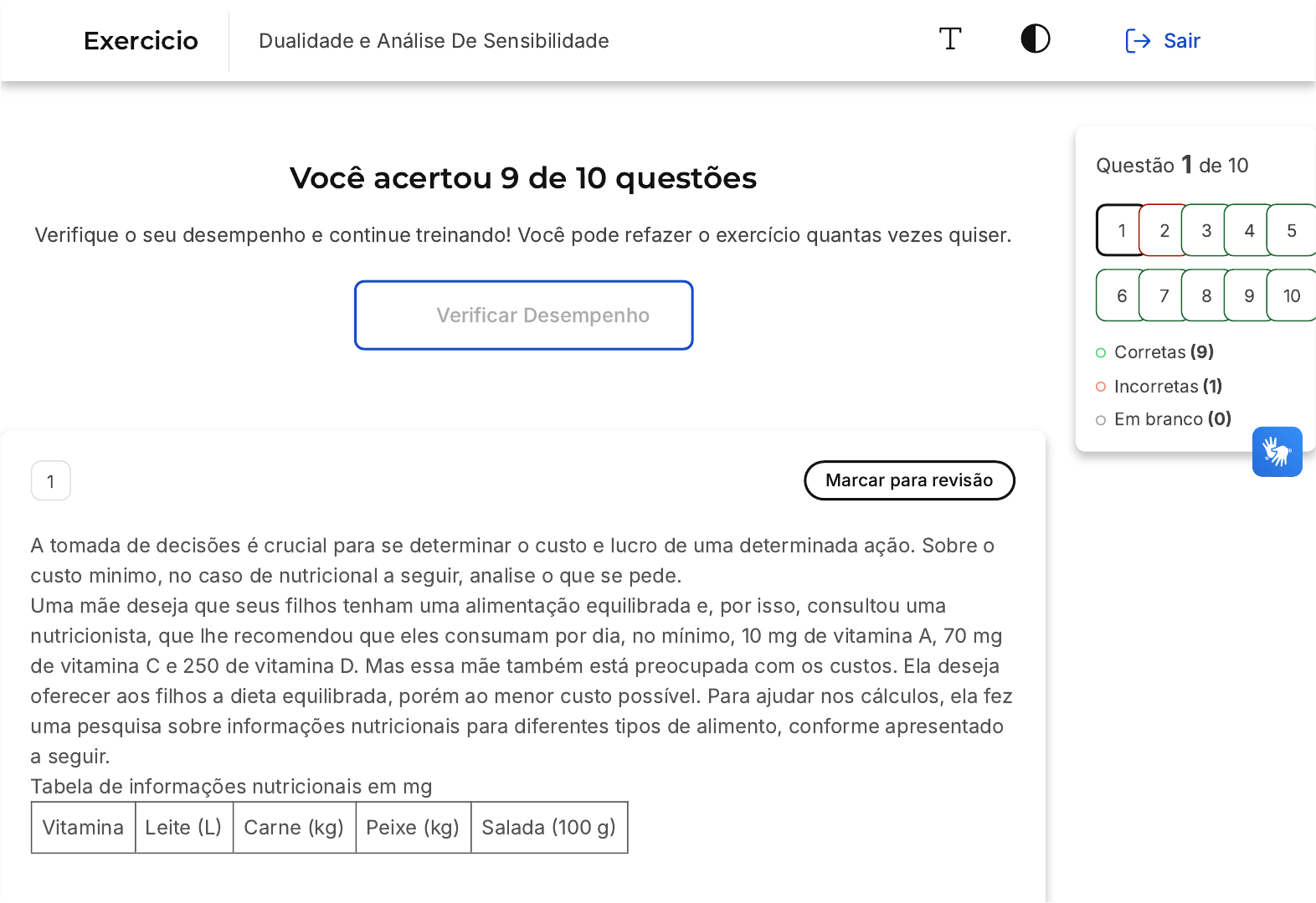 <p>Você acertou 9 de 10 questões</p><p>Verifique o seu desempenho e continue treinando! Você pode refazer o exercício quantas vezes quiser.</p><p>Verificar Desempenho</p><p>1 Marcar para revisão</p><p>A tomada de decisões é crucial para se determinar o custo e lucro de uma determinada ação. Sobre o</p><p>custo minimo, no caso de nutricional a seguir, analise o que se pede.</p><p>Uma mãe deseja que seus filhos tenham uma alimentação equilibrada e, por isso, consultou uma</p><p>nutricionista, que lhe recomendou que eles consumam por dia, no mínimo, 10 mg de vitamina A, 70 mg</p><p>de vitamina C e 250 de vitamina D. Mas essa mãe também está preocupada com os custos. Ela deseja</p><p>oferecer aos filhos a dieta equilibrada, porém ao menor custo possível. Para ajudar nos cálculos, ela fez</p><p>uma pesquisa sobre informações nutricionais para diferentes tipos de alimento, conforme apresentado</p><p>a seguir.</p><p>Tabela de informações nutricionais em mg</p><p>Vitamina Leite �L� Carne (kg) Peixe (kg) Salada �100 g�</p><p>Questão 1 de 10</p><p>Corretas �9�</p><p>Incorretas �1�</p><p>Em branco �0�</p><p>1 2 3 4 5</p><p>6 7 8 9 10</p><p>Exercicio Dualidade e Análise De Sensibilidade Sair</p><p>A</p><p>B</p><p>A 2 2 10 20</p><p>C 50 20 10 30</p><p>D 80 70 10 80</p><p>A mãe também foi ao supermercado e verificou que um litro de leite custa</p><p>20,00, um quilo de peixe custa</p><p>3,00. O modelo matemático para o</p><p>planejamento da alimentação das crianças, buscando minimizar o custo, é dado por:</p><p>Min Z � 2x + 20x + 25x + 3x</p><p>s. a.:</p><p>2x + 2x + 10x + 20x ≥ 10</p><p>50x + 20x + 10x + 30x ≥ 70</p><p>80x + 70x + 10x + 80x ≥ 250</p><p>x , x , x , x ≥ 0</p><p>Sendo: x = litros de leite a serem consumidos por dia pelas crianças</p><p>x = quilos de carne a serem consumidos por dia pelas crianças</p><p>x = quilos de peixe a serem consumidos por dia pelas crianças</p><p>x = 100 g de salada a serem consumidos por dia pelas crianças</p><p>O custo mínimo que a mãe vai ter é de $ 6,46. Sobre o problema, é correto afirmar que:</p><p>2, 00,umquilodecarnecusta</p><p>25, 00, equeparapreparar100gdesaladaelagastaria</p><p>1 2 3 4</p><p>1 2 3 4</p><p>1 2 3 4</p><p>1 2 3 4</p><p>1 2 3 4</p><p>1</p><p>2</p><p>3</p><p>4</p><p>Se o custo do kg de carne passasse a ser de $ 15,00/unidade, carne passaria a ser adquirida</p><p>para a alimentação familiar.</p><p>Se o custo do kg de carne passasse a ser de $ 10,00/unidade, carne passaria a ser adquirida</p><p>para a alimentação familiar.</p><p>C</p><p>D</p><p>E</p><p>Mesmo que o custo do kg de carne passasse a ser de $ 5,00/unidade, carne não passaria a</p><p>ser adquirida para a alimentação familiar.</p><p>Se o custo do kg de peixe passasse a ser de $ 20,00/unidade, peixe passaria a ser adquirido</p><p>para a alimentação familiar.</p><p>Se o custo do kg de peixe passasse a ser de $ 15,00/unidade, peixe passaria a ser adquirido</p><p>para a alimentação familiar.</p><p>Resposta correta</p><p>Parabéns, você selecionou a alternativa correta. Confira o gabarito comentado!</p><p>Gabarito Comentado</p><p>A solução abaixo representa a solução ótima no Solver com o quilo da carne custando R$ 5,00,</p><p>dessa forma, podemos ver que não há compra e carne mesmo com essa alteração:</p><p>2 Marcar para revisão</p><p>Uma mãe deseja que seus filhos tenham uma alimentação equilibrada e, por isso, consultou uma</p><p>nutricionista, que lhe recomendou que eles consumam por dia, no mínimo, 10 mg de vitamina A, 70 mg</p><p>de vitamina C e 250 de vitamina D.</p><p>Mas essa mãe também está preocupada com os custos. Ela deseja oferecer aos filhos a dieta</p><p>equilibrada, porém ao menor custo possível. Para ajudar nos cálculos, ela fez uma pesquisa sobre</p><p>informações nutricionais para diferentes tipos de alimento, conforme apresentado a seguir.</p><p>Tabela de informações nutricionais em mg</p><p>Vitamina Leite �L� Carne (kg) Peixe (kg) Salada �100 g�</p><p>A 2 2 10 20</p><p>A</p><p>B</p><p>C 50 20 10 30</p><p>D 80 70 10 80</p><p>A mãe também foi ao supermercado e verificou que um litro de leite custa $ 2,00, um quilo de carne</p><p>custa $ 20,00, um quilo de peixe custa $ 25,00, e que para preparar 100 g de salada ela gastaria $ 3,00.</p><p>O modelo matemático para o planejamento da alimentação das crianças, buscando minimizar o custo, é</p><p>dado por:</p><p>Min Z � 2�1 � 20�2 � 25�3 � 3�4</p><p>s. a.:</p><p>2�1 � 2�2 � 10�3 � 20�4 ≥ 10</p><p>50�1 � 20�2 � 10�3 � 30�4 ≥ 70</p><p>80�1 � 70�2 � 10�3 � 80�4 ≥ 250</p><p>x1, x2, x3, x4 ≥ 0</p><p>Sendo: x1 = litros de leite a serem consumidos por dia pelas crianças</p><p>x2 = quilos de carne a serem consumidos por dia pelas crianças</p><p>x3 = quilos de peixe a serem consumidos por dia pelas crianças</p><p>x4 � 100 g de salada a serem consumidos por dia pelas crianças</p><p>Em relação ao dual para o problema, é correto afirmar que:</p><p>As restrições do dual são do tipo ≥.</p><p>As restrições do dual são do tipo =.</p><p>C</p><p>D</p><p>E</p><p>As restrições do dual são do tipo ≤.</p><p>Não há restrição de sinal no dual do problema.</p><p>Não existem restrições para o dual do problema.</p><p>Resposta incorreta</p><p>Opa! A alternativa correta é a letra A. Confira o gabarito comentado!</p><p>Gabarito Comentado</p><p>Como as variáveis de decisão do primal são de não negatividade, as restrições do dual são todas</p><p>de ≥.</p><p>3 Marcar para revisão</p><p>A seguir, será apresentado um estudo de caso que propõem uma oportunidade de otimização de</p><p>recursos financeiros enquanto promovem um estilo de vida saudável. Analise o estudo de caso</p><p>nutricionista e assinale o que se pede.</p><p>Uma mãe deseja que seus filhos tenham uma alimentação equilibrada e, por isso, consultou uma</p><p>nutricio