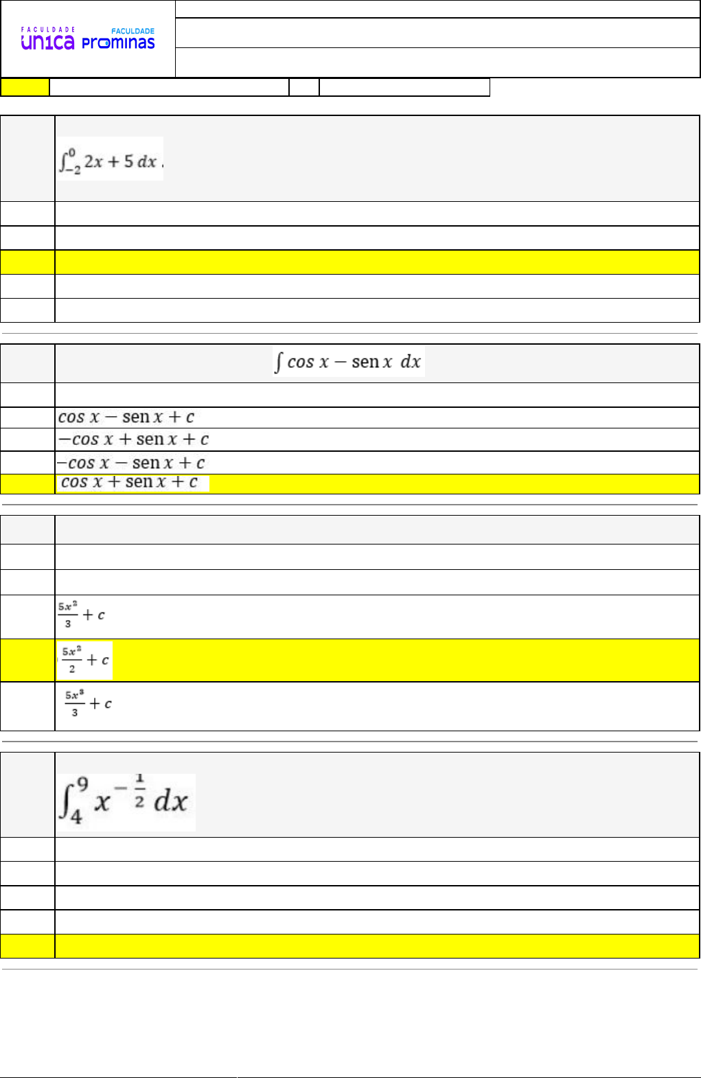 <p>14/04/2024 10:36:54 1/3</p><p>REVISÃO DE SIMULADO</p><p>Nome:</p><p>DIEGO VELOSO SOARES</p><p>Disciplina:</p><p>Cálculo II</p><p>Respostas corretas são marcadas em amarelo X Respostas marcardas por você.</p><p>Questão</p><p>001 Por meio o teorema Fundamental do Cálculo (parte 2) pode-se calcular o valor de</p><p>Dessa forma, o valor encontrado é :</p><p>A) 4</p><p>B) 5</p><p>X C) 6</p><p>D) 7</p><p>E) 3</p><p>Questão</p><p>002 Calculando a antiderivada de encontraremos</p><p>A) 1</p><p>X B)</p><p>C)</p><p>D)</p><p>E)</p><p>Questão</p><p>003 Calculando a antiderivada de ∫ 5x dx encontraremos</p><p>A) 5x3 + c</p><p>B) 5x2 + c</p><p>C)</p><p>X D)</p><p>E)</p><p>Questão</p><p>004 Por meio o Teorema Fundamental do Cálculo (parte 2) pode-se calcular o valor de</p><p>. Desss forma, o valor encontrado é :</p><p>A) 1</p><p>B) 0</p><p>X C) 3</p><p>D) 4</p><p>E) 2</p><p>14/04/2024 10:36:54 2/3</p><p>Questão</p><p>005 Por meio o Teorema Fundamental do Cálculo (parte 2) pode-se calcular o valor de</p><p>.</p><p>Dessa forma, o valor encontrado é</p><p>X A) 1</p><p>B) 4</p><p>C) 2</p><p>D) 5</p><p>E) 3</p><p>Questão</p><p>006 Calculando a antiderivada de ∫ x8 dx encontraremos</p><p>A)</p><p>B) x8+c</p><p>X C)</p><p>D) x9 + c</p><p>E)</p><p>Questão</p><p>007</p><p>Calculando a antiderivada de encontramos :</p><p>A)</p><p>B)</p><p>X C)</p><p>D)</p><p>E)</p><p>Questão</p><p>008 Por meio o Teorema Fundamental do Cálculo (parte 2) pode-se calcular o valor de</p><p>.</p><p>Dessa forma, o valor encontrado é</p><p>A) 1</p><p>B) 1/2</p><p>X C) 5/2</p><p>D) 3/2</p><p>E) 2</p><p>14/04/2024 10:36:54 3/3</p>