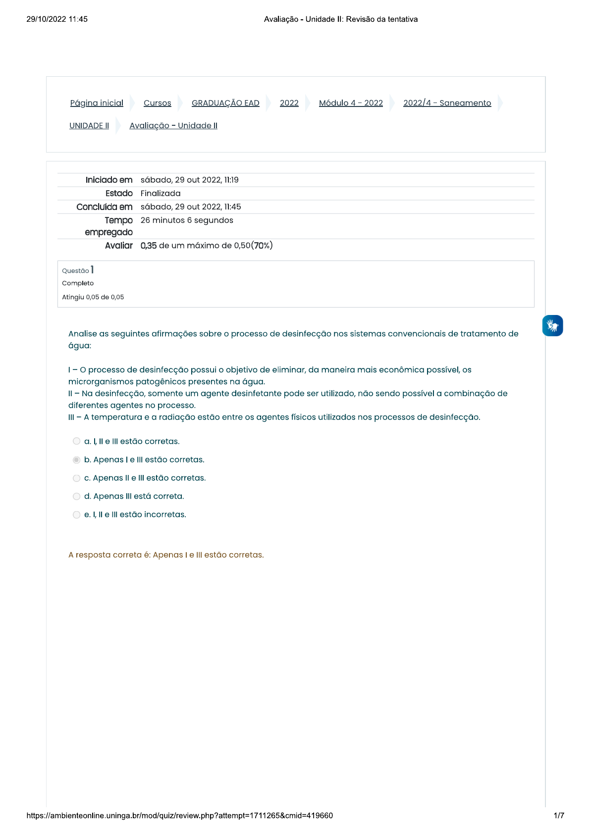 <p>29/10/2022 11:45 Avaliação - Unidade II: Revisão da tentativa Página inicial Cursos GRADUAÇÃO EAD 2022 Módulo 4 - 2022 2022/4 - Saneamento UNIDADE Avaliação - Unidade Iniciado em sábado, 29 out 2022, 11:19 Estado Finalizada Concluída em sábado, 29 out 2022, 11:45 Tempo 26 minutos 6 segundos empregado 0,35 de um máximo de 0,50(70%) Questão 1 Completo Atingiu 0,05 de 0,05 Analise as seguintes afirmações sobre o processo de desinfecção nos sistemas convencionais de tratamento de água: - o processo de desinfecção possui o objetivo de eliminar, da maneira mais econômica possível, os microrganismos patogênicos presentes na água. - - Na desinfecção, somente um agente desinfetante pode ser utilizado, não sendo possível a combinação de diferentes agentes no processo. III - - A temperatura e a radiação estão entre os agentes físicos utilizados nos processos de desinfecção. a. I, e III estão corretas. b. Apenas e III estão corretas. C. Apenas e III estão corretas. d. Apenas III está correta. e. I, e III estão incorretas. A resposta correta é: Apenas e III estão corretas. 1/7</p><p>29/10/2022 11:45 Avaliação - Unidade II: Revisão da tentativa Questão 2 Completo Atingiu 0,05 de 0,05 As perdas nos sistemas de abastecimento de água podem ser classificadas em dois grupos: a. Perdas reais e perdas por vazamento. b. Perdas físicas e perdas por evaporação. C. Perdas reais e perdas insignificantes. d. Perdas reais e perdas aparentes. e. Perdas físicas e perdas reais. A resposta correta é: Perdas reais e perdas aparentes Questão 3 Completo Atingiu 0,05 de 0,05 Com relação as etapas iniciais do dimensionamento dos sistemas de abastecimento de água, analise as seguintes afirmações e marque a alternativa que apresente a sequência correta para verdadeiro (v) ou falso (F): ( ) As vazões de dimensionamento de um SAA são calculadas por algoritmos que estipulam o diâmetro correto das tubulações. ( ) As vazões de dimensionamento de um SAA são calculadas levando em conta principalmente a ocorrência de enchentes. ( ) As vazões de dimensionamento levam em conta estudos sobre a população, o consumo de água e a presença de grandes consumidores como indústrias. ( ) As vazões de dimensionamento são obtidas nas etapas iniciais de projetos de sistemas de abastecimento de água. C. V, V, V, V. d. F, F, V, V. e. V, F, F F. A resposto correta é: https://ambienteonline.uninga.br/mod/quiz/review.php?attempt=1711265&cmid=419660 2/7</p><p>29/10/2022 11:45 Avaliação - Unidade II: Revisão da tentativa Questão 4 Completo Atingiu 0,05 de 0,05 Diferentes tecnologias e dispositivos são utilizados para o tratamento de água. Nesse sentido, as calhas Parshall, dispositivos hidráulicos mecânicos, vertedores retangulares, malhas difusoras e injetores são tecnologias utilizadas usualmente em qual das etapas de tratamento listadas a seguir? a. Desinfecção. b. Floculação. C. Coagulação. d. Filtração. e. Decantação. A resposta correta é: Coagulação. Questão 5 Completo Atingiu 0,05 de 0,05 Nas estimativas e cálculos de vazões de dimensionamento, são utilizadas diversas equações que, por sua vez, fazem uso de diferentes variáveis com suas respectivas importâncias. Mesmo para variáveis que tenham as mesmas unidades de representação e expressem informações semelhantes, a atenção nos detalhes é necessária para a compreensão e utilização correta no dimensionamento. Nesse sentido, a diferença entre consumo de água efetivo per capita e consumo de água per capita se deve: a. A consideração das perdas de água do sistema. b. Ao tipo do estudo de projeção de população utilizado. C. Apenas a uma melhoria de nomenclatura. d. A inserção dos consumidores de grande porte. e. Ao tipo do hidrômetro usado na medição. A resposta correta é: A consideração das perdas de água do sistema. 3/7</p><p>29/10/2022 11:45 Avaliação Unidade II: Revisão da tentativa Questão 6 Completo Atingiu 0,05 de 0,05 correto dimensionamento das tubulações e unidades do sistema é primordial e indispensável para a eficiência das etapas de planejamento e gerenciamento de um SAA. Neste aspecto, assinale a alternativa que NÃO corresponde a um fator de relevância para o dimensionamento: a. Existência de coleta de resíduos sólidos. b. Número estimado de habitantes. C. Consumo de água médio por habitante. d. Eventual presença de consumos de água específicos. e. Variações de demanda. A resposta correta é: Existência de coleta de resíduos sólidos. Questão 7 Completo Atingiu 0,00 de 0,05 Para um sistema de abastecimento de água convencional, que atenda uma população de 18.000 habitantes, calcule a vazão de dimensionamento da captação até a ETA do sistema, utilizando também os seguintes dados: -Consumo de água per capita: 180 L/hab.dia; -Consumo da ETA: 1,3. -Coeficiente do dia de maior consumo: 1,2. Com base nos cálculos, assinale a alternativa correta: C. 58,5 d. 62,5 e. 90,0 L/S. A resposta correta é: 58,5 4/7</p><p>29/10/2022 11:45 Avaliação Unidade II: Revisão da tentativa Questão 8 Completo Atingiu 0,00 de 0,05 Por ser um excelente solvente, a água normalmente possui inúmeras impurezas, afetando assim a sua qualidade. Logo, para que se possa consumir água de forma segura, o tratamento deste recurso é uma etapa Neste sentido, analise as seguintes afirmações sobre o tratamento convencional de água: - De acordo com a qualidade da água captada, as estações de tratamento dos sistemas de abastecimento de água podem adquirir diferentes combinações. - A coagulação é o segundo processo de tratamento inserido nos sistemas de uma ETA convencional. III - As tecnologias de floculação utilizadas dividem-se em geral entre os dispositivos de floculação mecanizados e os dispositivos hidráulicos de floculação. IV - A filtração, assim como a desinfecção, é um processo de separação da fase sólida e líquida