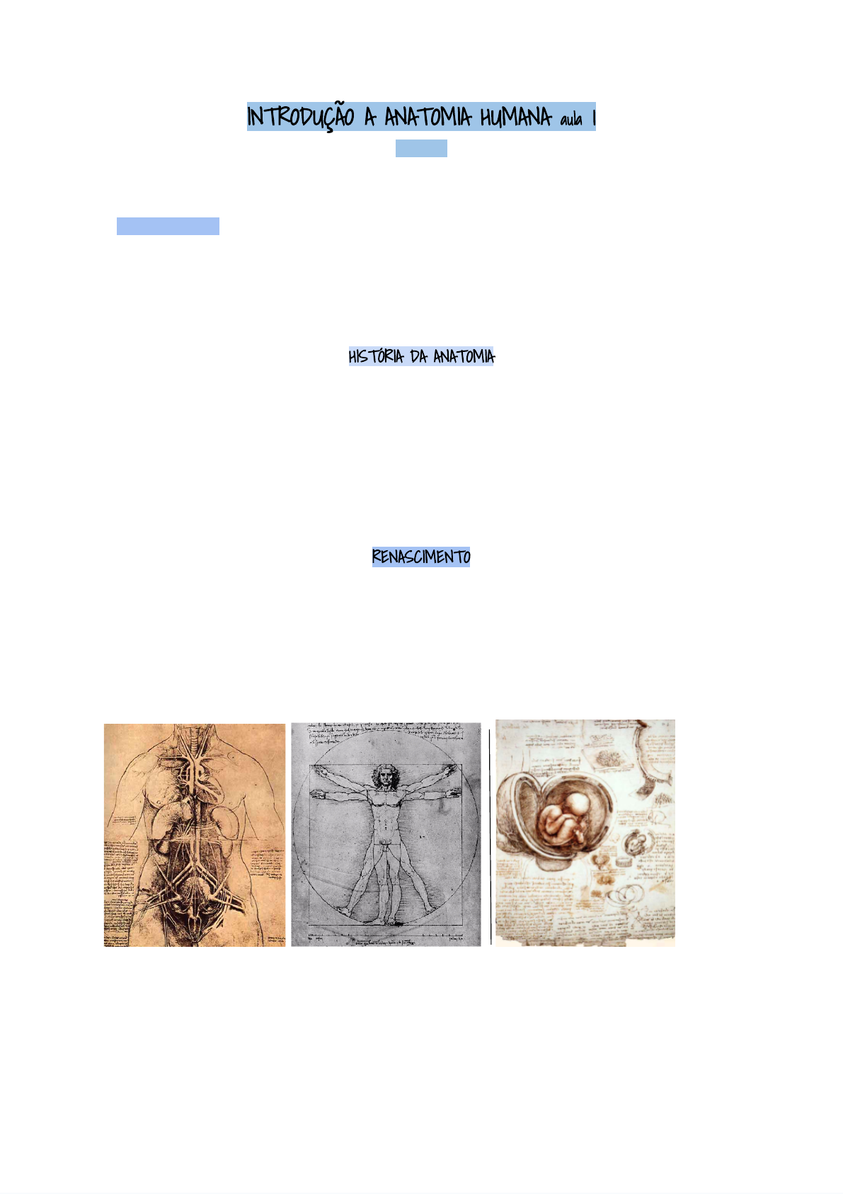 <p>INTRODUÇÃO A ANATOMIA HUMANA aula 1</p><p>resumo</p><p>A anatomia geral é o estudo da estrutura do corpo humano e das relações entre suas</p><p>partes. Como uma das ciências fundamentais da medicina e das ciências biológicas, a</p><p>anatomia fornece o conhecimento necessário para compreender a organização e o</p><p>funcionamento do corpo, essencial para áreas como a fisiologia, a patologia e a cirurgia.</p><p>HISTÓRIA DA ANATOMIA</p><p>Herófilo da calcedônia, desenvolveu um esquema de distribuição, formato e tamanho</p><p>dos órgãos, como fígado, o cérebro e os órgãos genitais.</p><p>Alessandro Achillini, descreveu os ossículos martelo e bigorna do ouvido, o condutor</p><p>submandibular, as válvulas cólicas, as veias do braço sistematizou duodeno, os ventrículos</p><p>cerebrais, descreveu a medula espinhal ao nível da primeira vértebra lombar.</p><p>RENASCIMENTO</p><p>Leonardo da Vinci(14521519), criou técnicas que evidenciaram não só arte, mas o</p><p>conhecimento anatômico, com intuito de demonstrar como o músculo auxiliavam no</p><p>desenvolvimento dos movimentos do corpo, da vinci substitui os músculos dos cadáveres e</p><p>utilizou os fios, assim quando os fios eram puxados, as distâncias entre os ossos era</p><p>encurtados e os movimentos se realizavam.</p><p>Os órgãos principais e sistemas Homem vitruviano Embrião dentro do útero.</p><p>vasculares e urina genital</p><p>de uma mulher.</p><p>Andreas Vesalius (1514-1564), foi o médico e escreveu, aos 28 anos, sua obra máxima</p><p>na qual expõe toda anatomia "De Humani Corporis Fabrica" (do edifício do corpo Humano),</p><p>obra que constitui o início da medicina moderna.</p><p>Tópicos Principais da Anatomia Geral</p><p>Níveis de Organização Corporal:</p><p>- Nível Químico: Inclui átomos e moléculas que</p><p>formam as células, as menores unidades funcionais</p><p>do corpo.</p><p>- Nível Celular: Células são as unidades</p><p>estruturais e funcionais básicas da vida.</p><p>- Nível Tecidual: Tecido é um conjunto de</p><p>células semelhantes que desempenham uma função</p><p>específica. Existem quatro tipos principais de</p><p>tecidos: epitelial, conjuntivo, muscular e nervoso.</p><p>- Nível Orgânico: Órgãos são estruturas</p><p>compostas por dois ou mais tipos de tecidos que</p><p>realizam funções específicas.</p><p>- Nível Sistêmico: Sistemas são grupos de órgãos que trabalham em conjunto para</p><p>executar funções complexas. Ex: sistema digestivo, sistema nervoso.</p><p>- Nível do Organismo: O organismo inteiro, onde todos os sistemas interagem para</p><p>manter a vida e a saúde.</p><p>Posição Anatômica:</p><p>A posição anatômica é uma referência padrão usada</p><p>para descrever localizações e direções no corpo</p><p>humano. Nessa posição, a pessoa está de pé, com os</p><p>pés juntos, os braços ao lado do corpo e as palmas</p><p>das mãos voltadas para frente.</p><p>- Termos Direcionais: São usados para descrever</p><p>a localização de estruturas anatômicas em relação a</p><p>outras. Ex: anterior (frontal), posterior (traseiro), medial</p><p>(próximo à linha média), lateral (mais distante da linha</p><p>média), proximal (mais próximo do ponto de origem),</p><p>distal (mais distante do ponto de origem).</p><p>Planos Anatômicos:</p><p>- Plano Sagital: Divide o corpo em lados</p><p>direito e esquerdo.</p><p>- Plano Coronal (Frontal): Divide o</p><p>corpo em partes anterior (frente) e posterior</p><p>(costas).</p><p>- Plano Transversal (Horizontal):</p><p>Divide o corpo em partes superior (acima) e</p><p>inferior (abaixo).</p><p>Cavidades Corporais:</p><p>- Cavidade Dorsal: Inclui a cavidade</p><p>craniana (contendo o cérebro) e a</p><p>cavidade vertebral (contendo a medula</p><p>espinhal).</p><p>- Cavidade Ventral: Inclui a</p><p>cavidade torácica (contendo coração e</p><p>pulmões) e a cavidade abdominopélvica</p><p>(contendo órgãos digestivos, urinários e</p><p>reprodutivos).</p><p>Divisão Regional do Corpo:</p><p>- O corpo é dividido em várias</p><p>regiões anatômicas para facilitar o</p><p>estudo e a localização de</p><p>estruturas:</p><p>- Cabeça e Pescoço: Inclui o</p><p>crânio, face, pescoço e estruturas</p><p>relacionadas.</p><p>- Tronco: Compreende o tórax,</p><p>abdômen e pelve.</p><p>- Membros Superiores: Inclui</p><p>ombros, braços, antebraços,</p><p>pulsos e mãos.</p><p>- Membros Inferiores: Compreende quadris, coxas, pernas, tornozelos e pés.</p><p>Sistemas Corporais:</p><p>O corpo humano é organizado</p><p>em vários sistemas que</p><p>desempenham funções</p><p>específicas:</p><p>- Sistema Esquelético:</p><p>Fornece suporte, proteção e</p><p>estrutura ao corpo.</p><p>- Sistema Muscular:</p><p>Permite movimento, postura e</p><p>produção de calor.</p><p>- Sistema Nervoso:</p><p>Controla e coordena as</p><p>funções do corpo e responde</p><p>aos estímulos.</p><p>- Sistema Circulatório:</p><p>transporta nutrientes, gases e</p><p>resíduos pelo corpo.</p><p>- Sistema Respiratório: troca gases entre o corpo e o ambiente.</p><p>- Sistema Digestivo: Processa alimentos e absorve nutrientes.</p><p>- Sistema Endócrino: Regula funções corporais por meio de hormônios.</p><p>- Sistema Linfático: Defende o corpo contra infecções e mantém o equilíbrio dos fluidos.</p><p>- Sistema Urinário: Remove resíduos e mantém o equilíbrio dos fluidos e eletrólitos.</p><p>- Sistema Reprodutivo: Produz gametas e hormônios para a reprodução.</p><p>Histologia:</p><p>A histologia é o estudo dos tecidos do</p><p>corpo e suas funções. O corpo humano é</p><p>composto por quatro tipos principais de</p><p>tecidos:</p><p>- Tecido Epitelial: Cobre superfícies</p><p>internas e externas do corpo, atuando como</p><p>barreira e envolvido na absorção, secreção e</p><p>proteção.</p><p>- Tecido Conjuntivo: Dá suporte e</p><p>estrutura ao corpo, ligando e sustentando</p><p>outros tecido