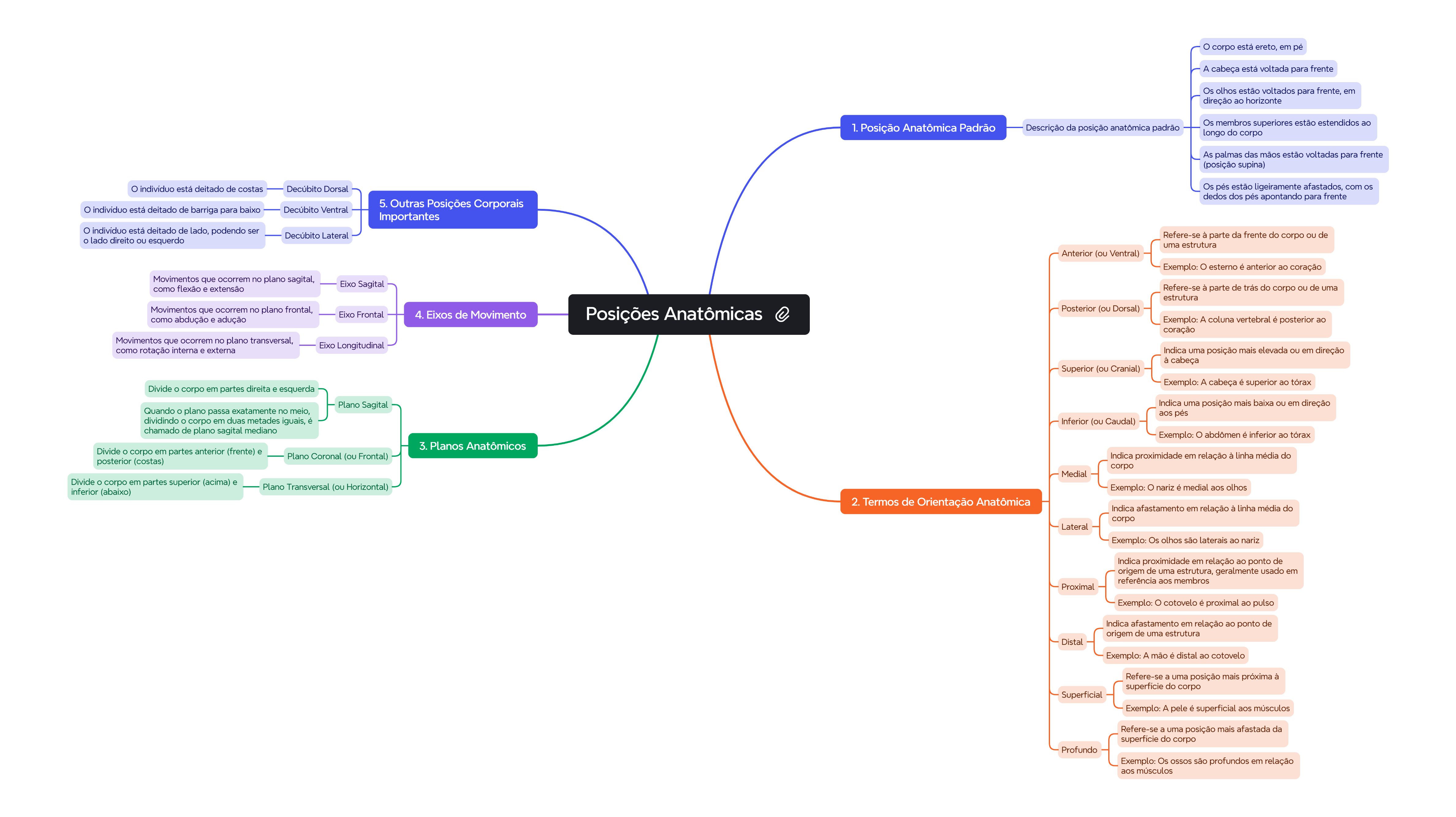 <p>Posições Anatômicas �</p><p>1. Posição Anatômica Padrão Descrição da posição anatômica padrão</p><p>O corpo está ereto, em pé</p><p>A cabeça está voltada para frente</p><p>Os olhos estão voltados para frente, em</p><p>direção ao horizonte</p><p>Os membros superiores estão estendidos</p><p>ao longo do corpo</p><p>As palmas das mãos estão voltadas para frente</p><p>(posição supina)</p><p>Os pés estão ligeiramente afastados, com os</p><p>dedos dos pés apontando para frente</p><p>2. Termos de Orientação Anatômica</p><p>Anterior (ou Ventral)</p><p>Refere-se à parte da frente do corpo ou de</p><p>uma estrutura</p><p>Exemplo: O esterno é anterior ao coração</p><p>Posterior (ou Dorsal)</p><p>Refere-se à parte de trás do corpo ou de uma</p><p>estrutura</p><p>Exemplo: A coluna vertebral é posterior ao</p><p>coração</p><p>Superior (ou Cranial)</p><p>Indica uma posição mais elevada ou em di-</p><p>reção à cabeça</p><p>Exemplo: A cabeça é superior ao tórax</p><p>Inferior (ou Caudal)</p><p>Indica uma posição mais baixa ou em di-</p><p>reção aos pés</p><p>Exemplo: O abdômen é inferior ao tórax</p><p>Medial</p><p>Indica proximidade em relação à linha média</p><p>do corpo</p><p>Exemplo: O nariz é medial aos olhos</p><p>Lateral</p><p>Indica afastamento em relação à linha média</p><p>do corpo</p><p>Exemplo: Os olhos são laterais ao nariz</p><p>Proximal</p><p>Indica proximidade em relação ao ponto de</p><p>origem de uma estrutura, geralmente usado</p><p>em referência aos membros</p><p>Exemplo: O cotovelo é proximal ao pulso</p><p>Distal</p><p>Indica afastamento em relação ao ponto de</p><p>origem de uma estrutura</p><p>Exemplo: A mão é distal ao cotovelo</p><p>Superficial</p><p>Refere-se a uma posição mais próxima à</p><p>superfície do corpo</p><p>Exemplo: A pele é superficial aos músculos</p><p>Profundo</p><p>Refere-se a uma posição mais afastada da</p><p>superfície do corpo</p><p>Exemplo: Os ossos são profundos em relação</p><p>aos músculos</p><p>3. Planos Anatômicos</p><p>Plano Sagital</p><p>Divide o corpo em partes direita e esquerda</p><p>Quando o plano passa exatamente no meio,</p><p>dividindo o corpo em duas metades iguais,</p><p>é chamado de plano sagital mediano</p><p>Plano Coronal (ou Frontal)Divide o corpo em partes anterior (frente) e</p><p>posterior (costas)</p><p>Plano Transversal (ou Horizontal)Divide o corpo em partes superior (acima) e</p><p>inferior (abaixo)</p><p>4. Eixos de Movimento</p><p>Eixo SagitalMovimentos que ocorrem no plano sagi-</p><p>tal, como flexão e extensão</p><p>Eixo FrontalMovimentos que ocorrem no plano</p><p>frontal, como abdução e adução</p><p>Eixo LongitudinalMovimentos que ocorrem no plano transver-</p><p>sal, como rotação interna e externa</p><p>5. Outras Posições Corporais</p><p>Importantes</p><p>Decúbito DorsalO indivíduo está deitado de costas</p><p>Decúbito VentralO indivíduo está deitado de barriga para baixo</p><p>Decúbito LateralO indivíduo está deitado de lado, podendo ser</p><p>o lado direito ou esquerdo</p>