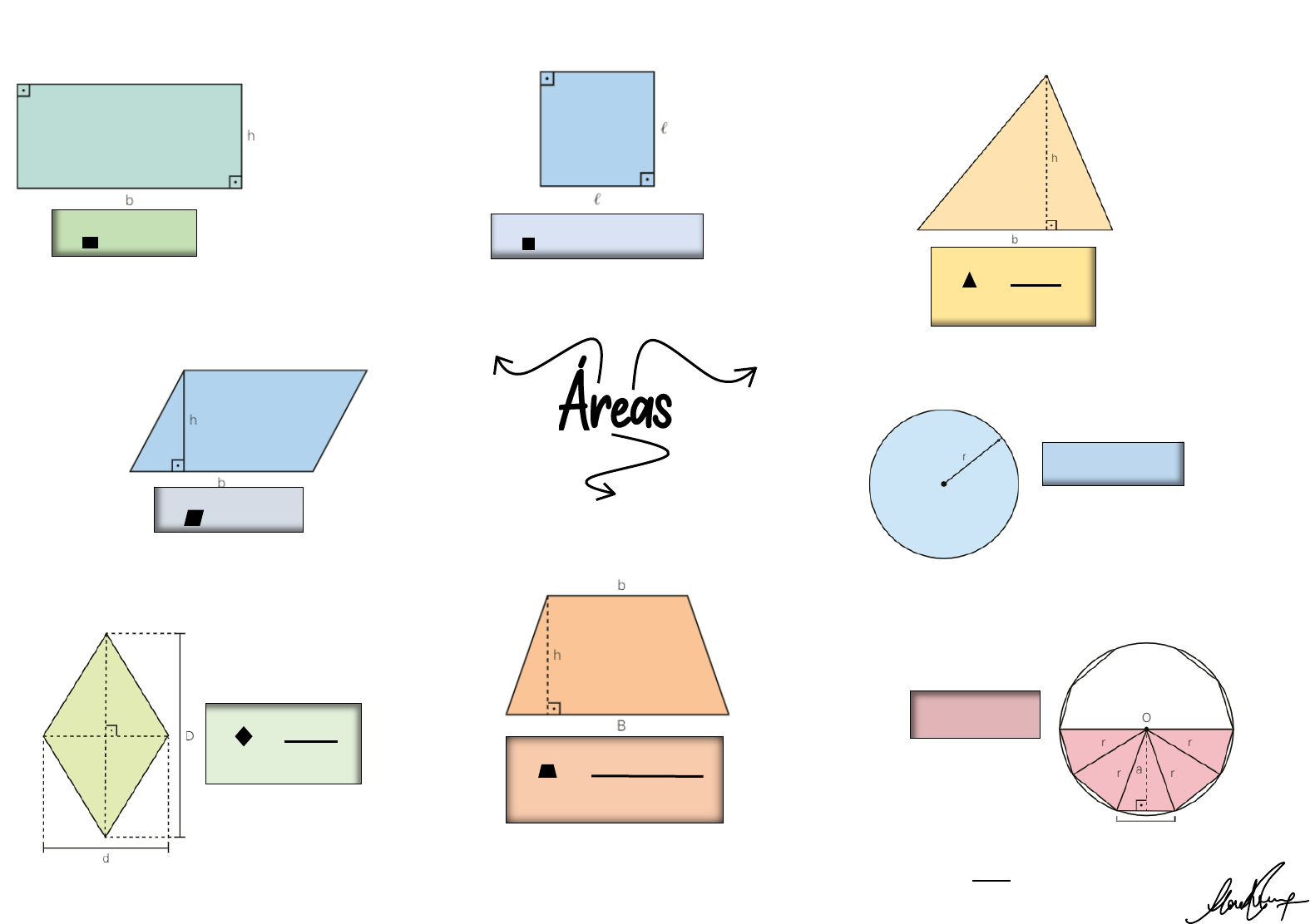 <p>Área do Retângulo</p><p>A = b . h</p><p>Área do Quadrado</p><p>A = L . L = L²</p><p>Área do Triângulo</p><p>A = b . h</p><p>2</p><p>Área do Paralelogramo</p><p>A = b . h</p><p>Área do Losango</p><p>A = D . d</p><p>2</p><p>Área do Trapézio</p><p>A = (B + b) . h</p><p>2</p><p>Área de um círculo</p><p>A = π . r²</p><p>Área de um polígono regular</p><p>a ⇒ apótema do polígono</p><p>p = n . L</p><p>2</p><p>A = p . a</p>