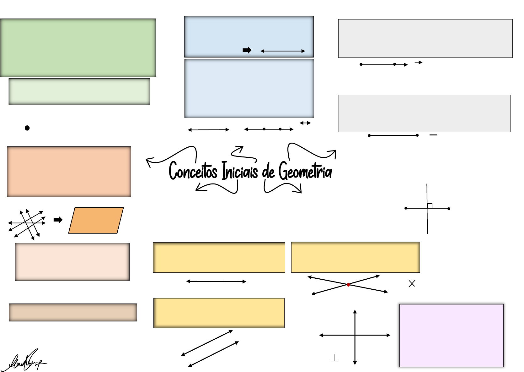 <p>Ponto</p><p>Nomenclatura de um ponto:</p><p>letras maiúsculas do nosso alfabeto.</p><p>Ex.: P</p><p>Reta</p><p>Formada pela reunião de</p><p>infinitos pontos.</p><p>.............</p><p>Nomenclatura de uma reta:</p><p>letras minúsculas do nosso</p><p>alfabeto ou indicando dois de</p><p>seus pontos com uma seta</p><p>dupla acima.</p><p>Ex.:</p><p>Semirreta</p><p>:</p><p>Segmento de Reta:</p><p>AB</p><p>AB</p><p>Mediatriz de um segmento é a reta que forma</p><p>90° com um segmento dado, passando pelo</p><p>seu ponto médio.</p><p>Plano</p><p>É a figura geométrica formada</p><p>pela reunião de infinitas retas,</p><p>organizadas em todas as</p><p>direções possíveis.</p><p>Nomenclatura de um plano:</p><p>letras minúsculas do</p><p>alfabeto grego.</p><p>Espaço</p><p>É o conjunto de todos os planos.</p><p>Posições Relativas entre</p><p>Retas no Plano</p><p>Retas Coincidentes: Quando elas se</p><p>encontram em mais de um ponto.</p><p>Retas Concorrentes: Quando elas se</p><p>encontram em um único ponto.</p><p>Obs: Quando duas retas</p><p>concorrentes formam</p><p>entre si um ângulo de</p><p>90°, dizemos que elas são</p><p>perpendiculares.</p><p>Retas Paralelas: Quando elas nunca</p><p>se encontram.</p><p>É um objeto que não possui definição,</p><p>dimensão e forma e serve como</p><p>unidade fundamental da geometria. É a</p><p>partir dele que são formadas as demais</p><p>figuras geométricas.</p><p>Possuem um ponto inicial que chamamos de</p><p>origem, onde a semirreta começa, mas não</p><p>possui um ponto final, ela não tem fim.</p><p>É a parte da reta compreendida entre dois</p><p>pontos. Possui ponto inicial e ponto final, tem</p><p>começo e tem fim.</p><p>A B</p><p>A B</p><p>A B</p><p>r AB</p><p>s</p><p>r s P</p><p>r s</p><p>r s</p><p>r ≡ s</p><p>r // s</p>