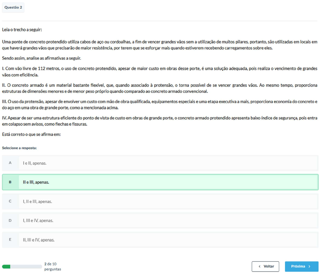 <p>Questão 2 Leia o trecho a seguir: Uma ponte de concreto protendido utiliza cabos de aço ou cordoalhas, a fim de vencer grandes vãos sem a utilização de muitos pilares, portanto, são utilizadas em locais em que haverá grandes vãos que precisarão de maior resistência, por terem que se esforçar mais quando estiverem recebendo carregamentos sobre eles. Sendo assim, analise as afirmativas a seguir. I. Com vão livre de 112 metros, o uso de concreto protendido, apesar de maior custo em obras desse porte, é uma solução adequada, pois realiza vencimento de grandes vãos com eficiência. II. concreto armado é um material bastante flexível, que, quando associado à protensão, o torna possível de se vencer grandes vãos. Ao mesmo tempo, proporciona estruturas de dimensões menores e de menor peso próprio quando comparado ao concreto armado convencional. III. o uso da protensão, apesar de envolver um custo com mão de obra qualificada, equipamentos especiais e uma etapa executiva a mais, proporciona economia do concreto e do aço em uma obra de grande porte, como a mencionada acima. IV. Apesar de ser uma estrutura eficiente do ponto de vista de custo em obras de grande porte, o concreto armado protendido apresenta baixo índice de segurança, pois entra em colapso sem avisos, como flechas e fissuras. Está correto o que se afirma em: Selecione a resposta: A e II, apenas. B II e III, apenas. C I. II e III. apenas. D I, III e IV, apenas. E II, III e IV, apenas. 2 de 10 < Voltar Próxima > perguntas</p>