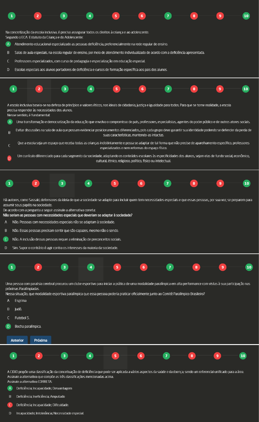 <p>1 2 3 4 5 6 7 8 9 10 Na concretização da escola inclusiva. é preciso assegurar todos os direitos à criança e ao Segundo o ECA Estatuto da Criança e do A Atendimento educacional especializado as pessoas deficiência preferencialmente na rede regular de B Salas de aula especiais, na escola regular de ensino por meio de atendimento individualizado de acordo com a deficiência apresentada Professores especializados, com curso de pedagogia e especialização em educação especial D Escolas especiais aos alunos por tadores de deficiência e cursos de formação específica aos pais dos alunos. 1 2 3 4 5 6 7 9 10 A escola inclusiva baseia-se na defesa de princípios e valores éticos, nos ideais de cidadania, e igualdade para Para que se torne a escola precisa responder às necessidades dos alunos. Nesse sentido, é fundamental A Uma transformação e democratização da educação que envolva compromisso de pais, professores, especialistas, agentes do poder público e de outros atores sociais Evitar discussões na sala de aula que possam evidenciar posicionamentos diferenciados, pois cada grupo deve garantir sua identidade podendo se defender da perda de B suas características. mantendo-as intactas Que a escola seja um espaço que receba todas as crianças indistintamente e possa se adaptar de tal forma que não precise de aparelhamento específico professores C especializados e nem reformas do espaço físico. Um currículo diferenciado para cada segmento da sociedade, adaptando os conteúdos escolares às especificidades dos alunos, sejam elas de fundo social, econômico, D cultural, físico ou intelectual 1 2 3 5 6 7 10 Há autores, como Sassaki defensores da ideia de que a sociedade se adapte para incluir quem tem necessidades especiais e que essas pessoas, por sua se preparem para assumir seus papéis na sociedade De acordo com a pergunta a seguir assinale a alternativa correta: Não seriam as pessoas com necessidades especiais que deveriam se adaptar à sociedade? A Pessoas com necessidades especiais não se adaptam à sociedade B Não Essas pessoas precisam sentir que são capazes mesmo não sendo. C Não A inclusão dessas pessoas requer a eliminação de preconceitos sociais D Sim Supor contrário é agir contra os interesses da maioria da 1 2 3 5 6 7 10 Uma pessoa com paralisia cerebral procurou um clube esportivo para iniciar a prática de uma modalidade paralímpica em alta performance com vistas à sua participação nas próximas Paralímpiadas Nessa situação, que modalidade esportiva paralímpica que essa pessoa poderia praticar oficialmente junto ao Comitê Paralímpico Brasileiro? A Esgrima B Futebol D Bocha paralímpica Anterior Próxima 1 2 3 5 6 7 10 A CIDID propõe uma classificação da conceituação de deficiência que pode ser aplicada a vários aspectos da saúde e da doença, sendo um referencial unificado para a área Assinale a alternativa que compõe as três classificações mencionadas acima. Assinale a alternativa CORRETA: A Deficiência: Desvantagem B Deficiência: Ineficiência: Amputado Deficiência: Dificuldade D Intolerância: Necessidade especial.</p>