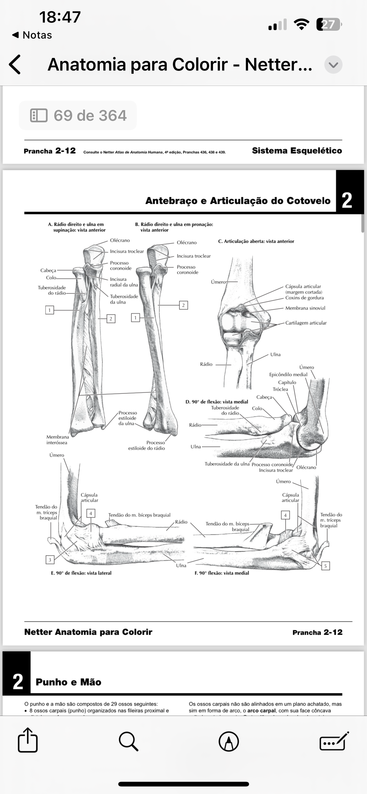 <p>18:47 27 Notas Anatomia para Colorir - Netter : 69 de 364 Prancha 2-12 Consulte o Netter Atlas de Anatomia Humana, edição, Pranchas 436, 438 e 439. Sistema Esquelético Antebraço e Articulação do Cotovelo 2 A. Rádio direito ulna em B. Rádio direito e ulna em pronação: supinação: vista anterior vista anterior Olécrano Olécrano C. Articulação aberta: vista anterior Incisura troclear Incisura troclear Processo coronoide Processo Cabeça coronoide Colo Incisura Úmero Tuberosidade radial da ulna articular do rádio (margem cortada) Tuberosidade Coxins de gordura da ulna 2 1 Membrana sinovial 2 1 Cartilagem articular Ulna Rádio Úmero Epicôndilo medial Capítulo Troclea Cabeça D. de flexão: vista medial Tuberosidade Colo Processo do rádio estiloide da ulna Rádio Membrana interóssea Processo estiloide do rádio Ulna Úmero Tuberosidade da ulna Processo coronoide, Olécrano Incisura troclear Úmero Capsula Capsula articular articular Tendão do m. triceps 4 braquial Tendão do m. biceps braquial 4 Tendão do Rádio m. triceps Tendão do m. biceps braquial braquial 3 Ulna 5 E. de flexão: vista lateral F. flexão: vista medial Netter Anatomia para Colorir Prancha 2-12 2 Punho e Mão o punho e a mão são compostos de 29 ossos seguintes: Os ossos carpais não são alinhados em um plano achatado, mas 8 ossos carpais (punho) organizados nas fileiras proximal e sim em forma de arco, arco carpal, com sua face côncava</p>