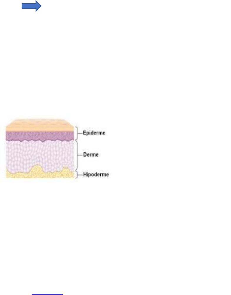 <p>Tecido tegumentar- pele e anexos</p><p>O sistema tegumentar é formado pela pele e por</p><p>seus anexos.</p><p>FUNÇÕES:</p><p>1. Ele atua para evitar a perda de água,</p><p>2. impedir a entrada de micro-organismos,</p><p>3. garantir a proteção contra a radiação ultravioleta,</p><p>4. proporcionar a percepção sensorial,</p><p>5. além de estar relacionado com a termorregulação e a</p><p>secreção de substâncias como suor e sebo.</p><p>1. EPIDERME</p><p>A epiderme é formada por cinco camadas:</p><p>1. Camada basal: caracteriza-se por ser rica em células-tronco, por</p><p>isso é também chamada de camada germinativa. É essa camada a</p><p>principal responsável pela renovação da epiderme. Nela,</p><p>encontramos ainda os melanócitos, células produtoras</p><p>de melanina, um pigmento responsável por dar cor à pele e aos</p><p>pelos.</p><p>2. Camada espinhosa: caracteriza-se pela presença de</p><p>desmossomos, que garantem a união das células dessa camada.</p><p>Devido à presença dessas estruturas, observa-se um aspecto</p><p>espinhoso.</p><p>3. Camada granulosa: tem apenas de três a cinco fileiras de células</p><p>achatadas e possui grânulos de querato-hialina.</p><p>https://www.biologianet.com/histologia-animal/melanina.htm</p><p>4. Camada lúcida: camada evidente e espessa que é formada por</p><p>células achatadas e translúcidas. Não possuem núcleo e o</p><p>citoplasma é rico em queratina.</p><p>Não pare agora... Tem mais depois da publicidade ;)</p><p>5. Camada córnea: Formada por células mortas, anucleadas,</p><p>achatadas e ricas em queratina. Sua espessura é variável.</p><p>Camadas da epiderme</p><p>DERME</p><p>A derme, como dito anteriormente,</p><p>2. é formada por tecido conjuntivo e está entre a</p><p>epiderme e a hipoderme.</p><p>3. Ela está conectada à epiderme por meio de projeções</p><p>que partem da derme para a epiderme, denominadas</p><p>de papilas dérmicas, e da epiderme para derme,</p><p>chamadas de cristas epidérmicas.</p><p>4. Podemos dividir a derme em duas camadas:</p><p>derme papilar Onde estão as papilas dérmicas,</p><p>derme reticular que constitui a parte mais espessa</p><p>da derme e é formada por tecido conjuntivo denso não</p><p>modelado.</p><p>https://www.biologianet.com/anatomia-fisiologia-animal/sistema-tegumentar.htm</p><p>É na derme que estão localizados os vasos sanguíneos e linfáticos,</p><p>nervos, terminações nervosas sensoriais, folículos pilosos e</p><p>glândulas.</p><p>Glândulas</p><p>As glândulas são estruturas responsáveis por produzir</p><p>secreções. Na pele, podemos destacar duas glândulas:</p><p>as sudoríparas e as sebáceas.</p><p>As glândulas sudoríparas são responsáveis por secretar o suor, uma</p><p>solução aquosa que atua na regulação da temperatura. Seu papel na</p><p>regulação está no fato de que, ao evaporar, leva ao resfriamento</p><p>corporal.</p><p>As glândulas sebáceas, por sua vez, produzem o sebo, que garante a</p><p>lubrificação da pele e do pelo.</p><p>HIPODERME</p><p>1. A hipoderme, também conhecida como tecido subcutâneo, é</p><p>uma camada de tecido conjuntivo e adiposo que se localiza</p><p>abaixo da derme, sendo uma das partes do sistema</p><p>tegumentar. A hipoderme tem várias funções importantes,</p><p>como:</p><p>2. Reserva energética,</p><p>3. Proteção contra choques mecânicos,</p><p>4. Isolamento térmico.</p><p>células da pele e suas funções:</p><p>1. Queratinócitos: Produzem queratina, protegendo a pele contra danos</p><p>físicos e infecções.</p><p>2. Melanócitos: Produzem melanina, que dá cor à pele e protege contra raios</p><p>UV.</p><p>https://www.biologianet.com/anatomia-fisiologia-animal/suor.htm</p><p>3. Células de Langerhans: Atuam no sistema imunológico, capturando e</p><p>apresentando antígenos aos linfócitos.</p><p>4. Células de Merkel: Detectam toques leves, contribuindo para a sensação</p><p>tátil.</p><p>5. Fibroblastos: Produzem colágeno e elastina, conferindo elasticidade e</p><p>firmeza à pele.</p><p>6. Células Adiposas (Adipócitos): Armazenam gordura, fornecendo</p><p>isolamento térmico e proteção.</p><p>7. Macrófagos: Fagocitam patógenos e células mortas, ajudando na</p><p>cicatrização e na resposta imune.</p><p>8. Mastócitos: Liberam histamina, desempenhando papel crucial em reações</p><p>alérgicas e defesa contra parasitas.</p><p>9. Plasmócitos: Produzem anticorpos para neutralizar patógenos, essenciais</p><p>na imunidade adaptativa.</p><p>formação da melanina:</p><p>Melanócitos</p><p>• Função: Células localizadas na camada basal da epiderme que produzem</p><p>melanina, o pigmento responsável pela cor da pele, cabelo e olhos.</p><p>• Ativação: Estimulados por radiação UV e hormônios como α-MSH.</p><p>Melanossomas</p><p>• Definição: Organelas dentro dos melanócitos onde a melanina é</p><p>sintetizada e armazenada.</p><p>• Transferência: São transferidos dos melanócitos para os queratinócitos,</p><p>distribuindo a melanina na pele.</p><p>Tirosina</p><p>• Definição: Um aminoácido que serve como o precursor da melanina.</p><p>• Importância: É a substância inicial que a tirosinase converte durante a</p><p>melanogênese.</p><p>Tirosinase</p><p>• Função: Enzima essencial no processo de melanogênese.</p><p>• Ação: Catalisa a conversão da tirosina em L-DOPA e, em seguida, em</p><p>dopaquinona, que são passos iniciais na produção de melanina.</p><p>L-DOPA</p><p>• Definição: Um intermediário na síntese de melanina, derivado da tirosina.</p><p>• Papel: É convertido pela tirosinase em dopaquinona, que é um precursor</p><p>direto na formação de melanina.</p><p>A. Explique o que acontece com os albinos, produzem ou</p><p>não melanócitos e por que não produzem pigmento?</p><p>R= Sim produzem, Isso ocorre porque, embora os</p><p>melanócitos estejam presentes e possam formar</p><p>melanossomas, a deficiência na tiro