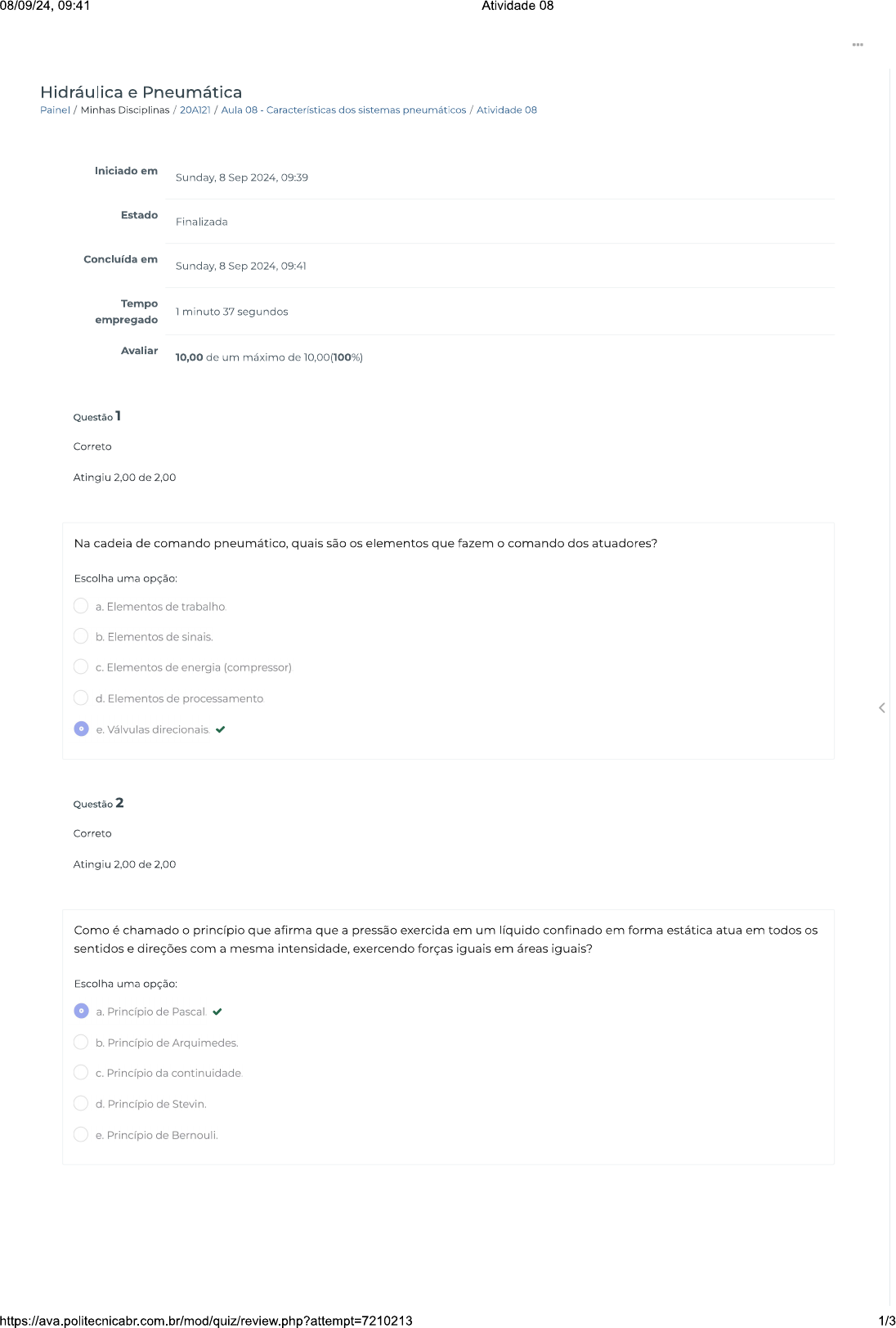 <p>08/09/24, 09:41 Atividade 08 Hidráulica e Pneumática Painel / Minhas Disciplinas / 20A121 / Aula 08 - Características dos sistemas pneumáticos / Atividade 08 Iniciado em Sunday, 8 Sep 2024, 09:39 Estado Finalizada Concluída em Sunday, 8 Sep 2024, 09:41 Tempo 1 minuto 37 segundos empregado Avaliar 10,00 de um máximo de 10,00(100%) Questão 1 Correto Atingiu 2,00 de 2,00 Na cadeia de comando pneumático, quais são os elementos que fazem comando dos atuadores? Escolha uma opção: a. Elementos de trabalho. b. Elementos de sinais. C. Elementos de energia (compressor). d. Elementos de processamento. e. Válvulas direcionais. Questão 2 Correto Atingiu 2,00 de 2,00 Como é chamado princípio que afirma que a pressão exercida em um líquido confinado em forma estática atua em todos os sentidos e direções com a mesma intensidade, exercendo forças iguais em áreas iguais? Escolha uma opção: o Princípio de Pascal. b. Princípio de Arquimedes. C. Princípio da continuidade. d. Princípio de Stevin. e. Princípio de Bernouli. 1/3</p><p>08/09/24, 09:41 Atividade 08 Correto Atingiu 2,00 de 2,00 Em uma transformação isométrica (volume constante), temos que Na temperatura ambiente de 27 °C e pressão atmosférica de 1 bar (100 Kpa), se a pressão se elevar para 2 bar qual a temperatura final em °C? Escolha uma opção: a. 180 b.300 C. 127 d. 227 o e. 327 Questão 4 Correto Atingiu 2,00 de 2,00 Considere um cilindro pneumático de diâmetro 10 cm a uma pressão de 8 Sabendo que a força é o produto da pressão pela área, qual é a força que esse cilindro pneumático pode exercer? Escolha uma opção: a. 6283,2 b. 80 C. 78,5 d. 628,32 e. 800 kg. Questão 5 Correto Atingiu 2,00 de 2,00 A panela de pressão opera a um volume constante. Qual é o nome dessa transformação? Escolha uma opção: a. b. C. d. Isobárica. Entre em Contato Links Úteis 2/3</p>