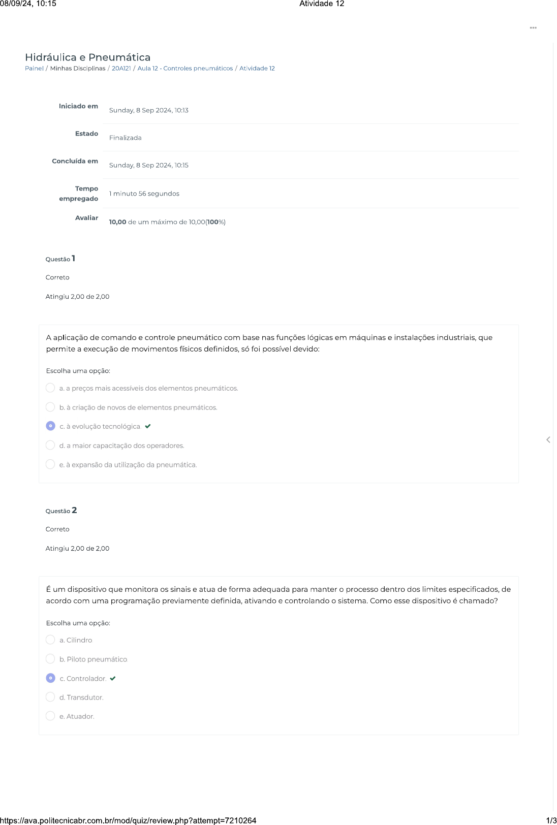 <p>08/09/24, 10:15 Atividade 12 Hidráulica e Pneumática Painel / Minhas Disciplinas / 20A121 / Aula 12 - Controles pneumáticos / Atividade 12 Iniciado em Sunday, 8 Sep 2024, 10:13 Estado Finalizada Concluída em Sunday, 8 Sep 2024, 10:15 Tempo 1 minuto 56 segundos empregado Avaliar 10,00 de um máximo de 10,00(100%) Questão 1 Correto Atingiu 2,00 de 2,00 A aplicação de comando e controle pneumático com base nas funções lógicas em máquinas e instalações industriais, que permite a execução de movimentos físicos definidos, só foi possível devido: Escolha uma opção: a. a preços mais acessíveis dos elementos pneumáticos. b. à criação de novos de elementos pneumáticos. o C. à evolução < d. a maior capacitação dos operadores. e. à expansão da utilização da pneumática. Questão 2 Correto Atingiu 2,00 de 2,00 É um dispositivo que monitora os sinais e atua de forma adequada para manter processo dentro dos limites especificados, de acordo com uma programação previamente definida, ativando e controlando sistema. Como esse dispositivo é chamado? Escolha uma opção: a. Cilindro. b. Piloto pneumático. C. Controlador. d. Transdutor. e. Atuador. 1/3</p><p>08/09/24, 10:15 Atividade 12 Correto Atingiu 2,00 de 2,00 Em um sistema pneumático, em alguns casos, é necessário que ocorra a diminuição da quantidade de que passa pela tubulação. Essa situação ocorre constantemente para regular a velocidade dos atuadores ou formar condições de temporização pneumática. Para isso, utiliza-se qual tipo de válvula? Escolha uma opção: a. Válvula de bloqueio. b. Válvula de pressão. C. Válvula de fluxo. d. Válvula Válvula de isolamento. Questão 4 Correto Atingiu 2,00 de 2,00 As primeiras aplicações do ar comprimido ocorreram em equipamentos de mineração e até mesmo em instrumentos musicais. A utilização dos sistemas pneumáticos na indústria começou em meados do século XIX. Por volta de 1920, começou a ser utilizado como ar de controle na automatização e racionalização dos processos de trabalho, passando a ser amplamente aplicado a partir de 1950. Como era realizado controle dos primeiros sistemas pneumáticos? Escolha uma opção: a. Hidraulicamente. b. C. d. e. Questão 5 Correto Atingiu 2,00 de 2,00 As válvulas pneumáticas são componentes pneumáticos utilizados para controlar e manipular a direção, pressão ou vazão de ar comprimido. Nesse contexto, assinale a alternativa referente às válvulas controladoras de pressão. Escolha uma opção: a. É responsável por abrir ou fechar as válvulas pneumáticas, em função da pressão. b. Trata-se de um tipo de válvula caracterizada por duas entradas, cuja função é isolar sistema em um trecho específico. São válvulas que permitem a passagem de ar apenas para um dos lados, bloqueando a direção contrária. d. São utilizadas para medir a pressão de gases e líquidos. o e. Esse tipo de válvula tem como função manter constante a pressão de trabalho, independentemente do consumo de e da pressão da rede. 2/3</p>