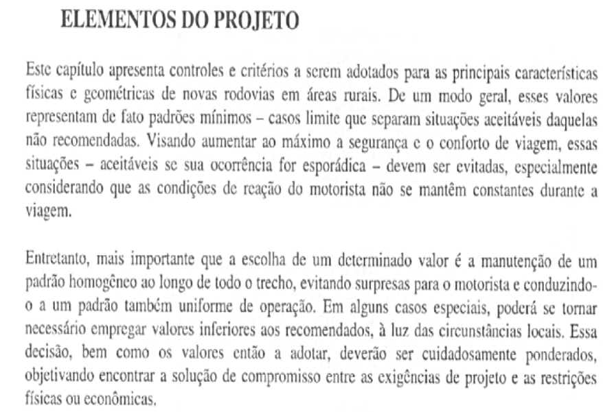 <p>PROJETO GEOMÉTRICO DE RODOVIAS</p><p>A concepção de um projeto geométrico de rodovia é baseada em critérios a serem adotados</p><p>para as principais características físicas e geométricas das vias, sempre respeitando a máxima</p><p>segurança e o conforto do usuário no deslocamento. No caso de ocorrência esporádica, devem</p><p>ser evitadas.</p><p>Velocidade de projeto ou velocidade diretriz é aquela usada na elaboração de projeto de</p><p>rodovias, pois ela nos dá as principais características da via, ou seja, nos dá a curvatura, a</p><p>superelevação e distâncias de visibilidade, para que os veículos tenham uma boa e segura</p><p>condição de trafegar. Dessa forma, sabe-se que a velocidade deve ser adequada à topografia da</p><p>região e à classe da estrada que está sendo projetada.</p><p>Para fins de organização de entidades responsáveis da administração da via, bem como pela</p><p>segurança dos usuários, existe a necessidade de uma classificação da velocidade de projeto da</p><p>rodovia.</p><p>Vamos praticar</p><p>Considerando os conhecimentos adquiridos pelo estudo do Capítulo 2 – Projeto Geométrico de</p><p>Rodovias –, elabore em uma lauda um estudo de caso de uma rodovia, descrevendo sua</p><p>velocidade diretriz, classificação técnica, características gerais e de relevo, critérios de</p><p>classificação técnica, extensão e cidades de ligação. Entregar em meio digital (.pdf) ilustrando</p><p>local com imagem do Google Earth, Maps e/ou Viewer ®.</p><p>Disponibilize seu arquivo no fórum da seção “Compartilhe”.</p><p>Disponível em</p><p>https://www.google.com.br/maps/place/CE-253,+Ceará - A1-3.9803372,-39.5217962</p><p>docsity-manual-de-projeto-geometrico-de-rodovias-rurais-dner-parte-2</p><p>https://www.google.com.br/maps/place/CE-253,+Ceará</p>