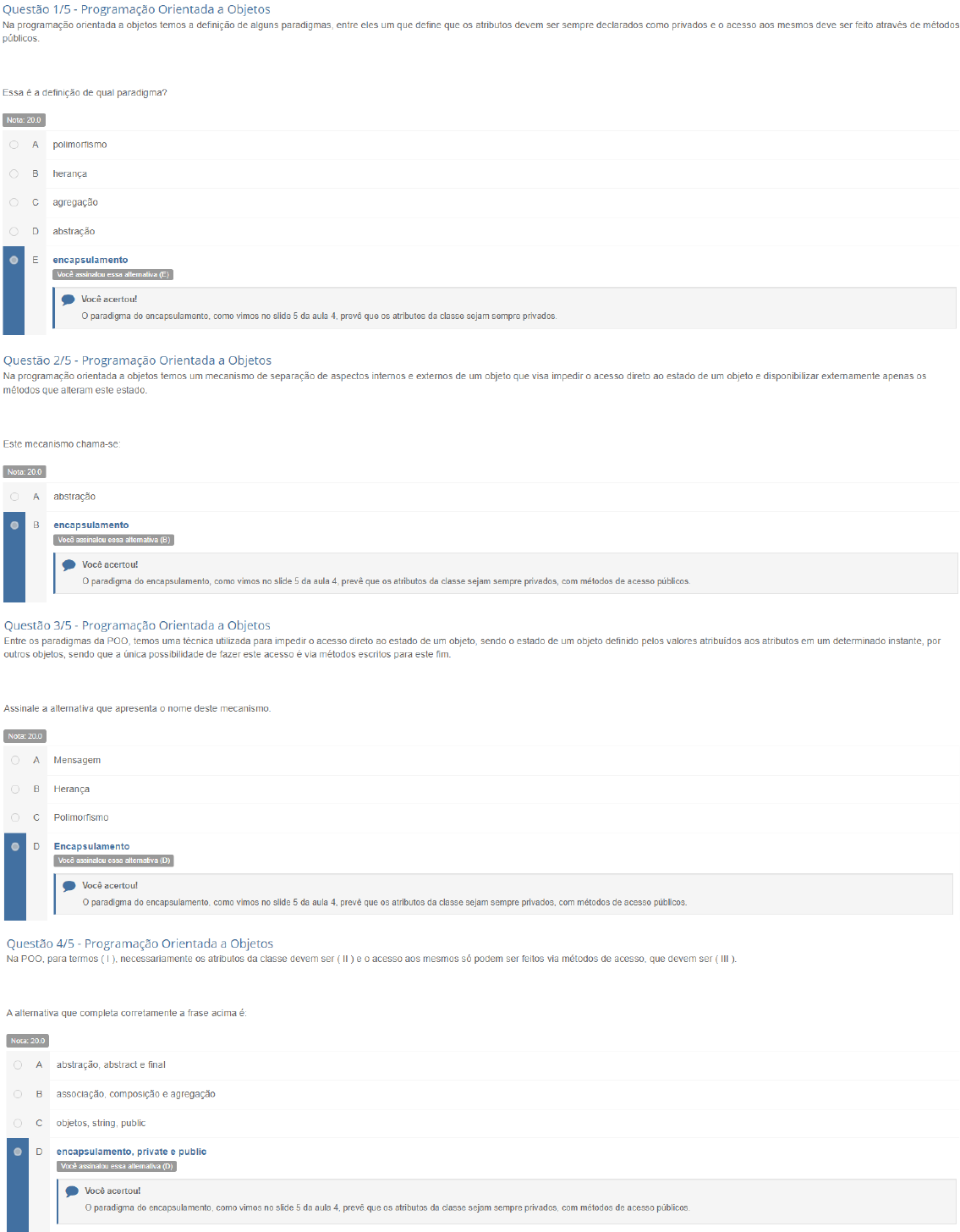 <p>Questão 1/5 - Programação Orientada a Objetos Na programação orientada a objetos temos a definição de alguns paradigmas, entre eles um que define que os atributos devem ser sempre declarados como privados e o acesso aos mesmos deve ser feito através de métodos Essa é a definição de qual paradigma? Nota: 20.0 A polimorfismo B herança C agregação D abstração E encapsulamento Você assinalou essa alternativa (E Você acertou! o paradigma do encapsulamento, como vimos no slide 5 da aula 4. prevê que os atributos da classe sejam sempre privados. Questão 2/5 - Programação Orientada a Objetos Na programação orientada a objetos temos um mecanismo de separação de aspectos internos e externos de um objeto que visa impedir o acesso direto ao estado de um objeto e disponibilizar externamente apenas os métodos que alteram este Este mecanismo Nota: A abstração B encapsulamento Você assinalou essa alternativa (B) Você acertou! o paradigma do como vimos no slide 5 da aula 4. prevê que os atributos da classe sejam sempre privados, com métodos de acesso Questão 3/5 Programação Orientada a Objetos Entre os paradigmas da temos uma técnica utilizada para impedir acesso direto ao estado de um objeto, sendo estado de um objeto definido pelos valores atribuídos aos atributos em um determinado por outros objetos, sendo que a possibilidade de fazer este acesso é via métodos escritos para este fim. Assinale a alternativa que apresenta o nome deste Nota A Mensagem B Herança C Polimorfismo D Encapsulamento Você assinalou essa alternativa (D) Você acertou! o paradigma do encapsulamento. como vimos no slide 5 da aula 4. prevê que os atributos da classe sejam sempre privados, com métodos de acesso Questão 4/5 - Programação Orientada a Objetos Na para termos necessariamente os atributos da classe devem ser e acesso aos mesmos só podem ser feitos via métodos de acesso que devem ser (III). A alternativa que completa corretamente a frase acima é: Nota: A abstract e final B composição e agregação objetos, public D encapsulamento, private e public Você assinalou essa alternativa (D Você acertou! o paradigma do encapsulamento, como vimos no slide 5 da aula 4. prevê que os atributos da classe sejam sempre privados, com métodos de acesso</p><p>Questão 5/5 Programação Orientada a Objetos A linguagem Java é, atualmente, uma das linguagens que implementa paradigma da programação orientada a objetos mais utilizada, particularmente pela possibilidade de portabilidade de código entre plataformas. Sobre a visibilidade de classes, métodos e atributos, aplicados à linguagem Java, seleciona a opção correta: Nota A uma classe pública, no Java, só pode ser acessada por outras classes que estejam dentro do mesmo pacote. B na linguagem Java, quando uma classe é declarada privada, todos os atributos e métodos da mesma também serão privados, independente do modificador aplicado. C quando não adicionamos um modificador de acesso a uma classe Java, ela é visível apenas dentro do pacote onde ela está declarada. Você assinalou essa alternativa (C) Você acertou! Conforme visto na parte prática da aula, se não incluirmos um modificador de acesso à assinatura de uma classe, ela se torna visível apenas no pacote que a definiu. Isso é chamado de modificador de pacote.</p>