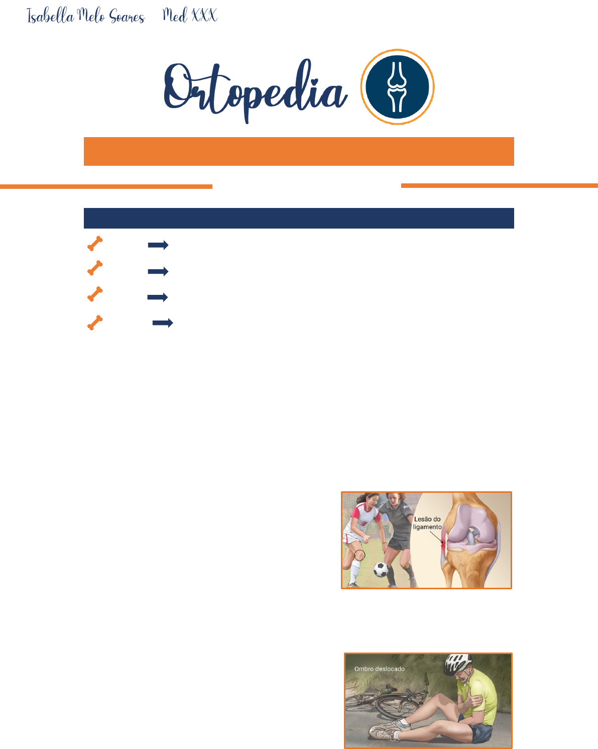 <p>–</p><p>INTRODUÇÃO À ORTOPEDIA</p><p>CONCEITOS BÁSICOS EM ORTOPEDIA</p><p>FRATURA ≠ LUXAÇÃO ≠ ENTORSE ≠ CONTUSÃO</p><p>FRATURA PERDA DA SOLUÇÃO DE CONTINUIDADE ÓSSEA</p><p>LUXAÇÃO PERDA DA CONGRUÊNCIA ARTICULAR</p><p>ENTORSE DISTENSÃO ARTICULAR</p><p>CONTUSÃO TRAUMA QUE NÃO CAUSA LESÕES ESTRUTURAIS DEFINITIVAS</p><p>A CONTUSÃO ocorre quando há trauma sem causar lesões estruturais aos ossos, articulações e pele. Popularmente, é conhecido</p><p>como “pancada”. Apesar de causar lesões não definitivas, gera edema, vermelhidão, limitação de movimentos e dor em graus</p><p>variáveis a depender da força do trauma. O tratamento consiste em crioterapia (gelo), repouso, elevação do membro para evitar</p><p>o inchaço e administração de analgésicos e anti-inflamatórios.</p><p>A ENTORSE consiste em LESÃO DOS LIGAMENTOS nas regiões articulares por traumas torcionais, pois ocorre um giro em torno</p><p>da articulação, com isso, há uma distensão da articulação, principalmente da cápsula ligamentar, ocasionando presença de líquido</p><p>e edema local. Popularmente, é conhecida como tração.</p><p>• Como é uma lesão de ligamentos articulares, o paciente</p><p>apresenta dificuldade de mobilizar a articulação, além sinais</p><p>flogísticos, como edema e vermelhidão. As entorses leves são</p><p>tratadas com repouso, imobilização, gelo e medicações</p><p>analgésicas e anti-inflamatórias. Já as lesões mais graves,</p><p>podem requerer imobilização, fisioterapia e em alguns casos,</p><p>cirurgia.</p><p>Na LUXAÇÃO, o encaixe da articulação é perdido porque um dos ossos se desarticula do outro, movendo-se em outra direção. Os</p><p>principais sintomas são dor, limitação de mobilização, sinais flogísticos locais,</p><p>como edema e vermelhidão e deformidade em razão do desvio ósseo.</p><p>• Esses desvios podem lesar estruturas neurológicas e vasculares.</p><p>Pode ocorrer em qualquer articulação do corpo, mas</p><p>frequentemente ocorre no ombro, cotovelo, joelho e quadril.</p><p>–</p><p>Na FRATURA, ocorre qualquer perda de continuidade óssea, sendo completa ou não, ou seja, o osso se quebra. Existem vários</p><p>tipos de fratura, como as fraturas expostas (solução de continuidade entre o osso e o meio externo), fraturas patológicas (câncer,</p><p>osteoporose) e fraturas por estresse (osso fratura sem nenhum tipo de trauma, como nos levantadores de peso).</p><p>• Na suspeita de fratura, o ideal é fazer uma imobilização</p><p>imediata. No caso de fraturas leves, o tratamento pode ser</p><p>feito com gesso, imobilizadores e órteses. Já as fraturas mais</p><p>graves podem precisar de cirurgia.</p><p>Geralmente, as fraturas surgem através de TRAUMAS DE ALTA ENERGIA.</p><p>• O osso, em condições normais, tem habilidade de suportar cargas e absorver essa energia. Quando ocorre um grande</p><p>nível de energia superior ao que o osso consegue suportar, gera fratura. Aquelas fraturas associadas a TRAUMAS DE</p><p>BAIXA ENERGIA, devem levantar suspeita de FRATUAS PATOLÓGICAS, ou seja, associadas a doenças ósseas, como</p><p>osteoporose e tumores.</p><p>TIPOS DE FRATURA</p><p>Existem diversos tipos de classificação para as fraturas. Elas podem ser classificadas quanto ao traço, quanto ao comprometimento</p><p>articular e quanto ao comprometimento de partes moles.</p><p>QUANTO AO TRAÇO</p><p>SIMPLES</p><p>• Quando há apenas um traço, sendo uma lesão única que transfixa todo o osso.</p><p>SEGMENTAR OU EM CUNHA</p><p>• Quando há dois traços de fratura formando uma cunha.</p><p>COMINUTIVA</p><p>• Quando se observam múltiplos traços de fratura, com o</p><p>osso fraturado em vários segmentos.</p><p>QUANTO AO TIPO DE ENERGIA</p><p>TRANSVERSO</p><p>• Causada por forças angulares em que o ângulo é quase reto em relação ao eixo longitudinal do osso.</p><p>Ou seja, é uma fratura direta.</p><p>OBLÍQUO</p><p>SIMPLES</p><p>COMINUTIVA</p><p>SEGMENTAR</p><p>TRANSVERSA</p><p>OBLÍQUA</p><p>–</p><p>• Causada por forças angulares em que o ângulo é oblíquo ao eixo longitudinal do corpo.</p><p>ESPIRAL</p><p>• Causada por torção, ou seja, mecanismo rotatório.</p><p>CUNHA OU ASA DE BORBOLETA</p><p>TIPOS DE DESVIOS</p><p>JOELHO EM VALGO</p><p>A articulação do joelho DESVIA PARA DENTRO, com relação à linha central do membro, aproximando</p><p>um joelho do outro.</p><p>• O vértice da curva aponta para a linha média.</p><p>JOELHO EM VARO</p><p>A articulação do joelho DESVIA PARA FORA, com relação à linha central do membro, afastando um</p><p>joelho do outro.</p><p>• O vértice da curva afasta-se da linha média.</p><p>URGÊNCIAS EM ORTOPEDIA</p><p>LUXAÇÃO</p><p>Como há PERDA DE CONGRUÊNCIA ARTICULAR, a luxação predispõe o membro a uma urgência.</p><p>ARTRITE SÉPTICA</p><p>FRATURAS EXPOSTAS</p><p>ESPIRAL</p><p>–</p><p>LESÃO EM LIVRO ABERTO EM PACIENTE INSTÁVEL</p><p>A lesão em livro aberto é a ABERTURA DA SÍNFISE PÚBICA por fratura do anel</p><p>pélvico. Essa abertura triplica a quantidade de sangue que a bacia acomoda, por</p><p>isso, deve-se iniciar reposição volêmica e iniciar o fechamento da pelve, pode</p><p>se iniciar com lençol ou cinta pélvica a nível dos trocanteres e posterior fixação</p><p>externa no centro cirúrgico.</p><p>TIPOS DE IMOBILIZAÇÕES</p><p>Existem diversos tipos de imobilização que podem ser utilizados no tratamento das fraturas.</p><p>CONTENÇÃO EXTERNA</p><p>• GESSO</p><p>➢ Colocado em torno do membro onde houve a fratura.</p><p>• TALA GESSADA</p><p>➢ Colocada apenas uma face do local da fratura, não envolve totalmente o membro.</p><p>• ÓRTESES</p><p>➢ Colocada para corrigir a deficiência de uma função do membro.</p><p>➢ Ex: Pé caído por lesão do nervo fibular</p><p>FIXAÇÃO CIRÚRGICA INTERNA</p><p>• Utiliza-se de PLACAS e PARAFUSOS, que realizam a fixação óssea.</p><p>➢ São inse