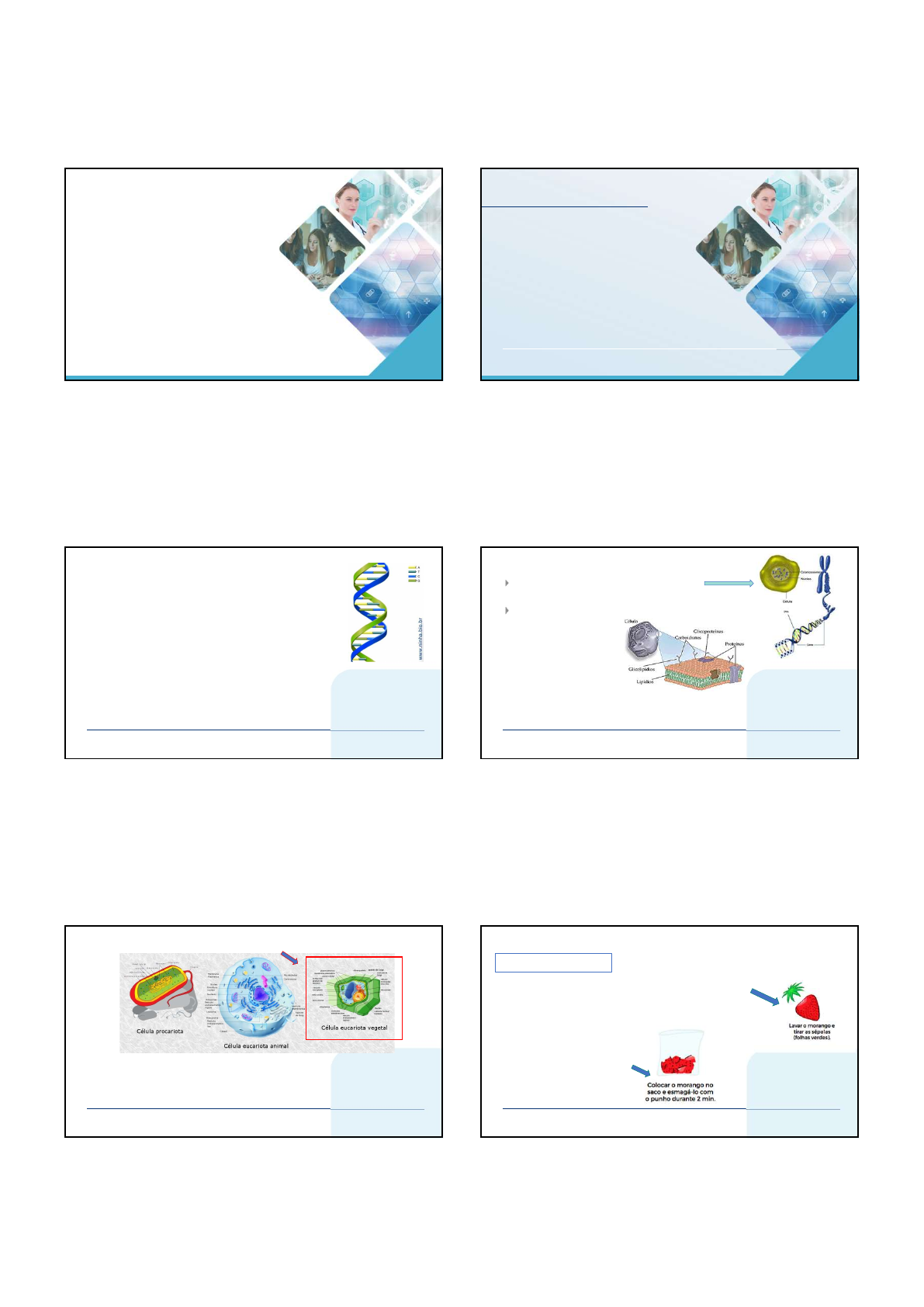 <p>Genética</p><p>Médica</p><p>Extração e Sequenciamento de DNA</p><p>Prof. Dr. Douglas Caldeira Giangarelli</p><p>Objetivos</p><p>• Compreender o processo básico da</p><p>técnica de extração de DNA de</p><p>material vegetal in natura;</p><p>• Conhecer o processo pós-extração</p><p>de DNA</p><p>• Entender a técnica de PCR</p><p>• Conhecer a lógica do processo de</p><p>sequenciamento de DNA.</p><p> Ácido desoxirribonucleico - DNA</p><p>O que é o DNA?</p><p>• Ácido Desoxirribonucleico</p><p>• Pentose + fosfato + bases nitrogenados</p><p> Unidade básica informacional do DNA é o gene.</p><p> Tamanho do genoma dos organismos é relativo</p><p>a sua complexidade.</p><p>• Vírus = 5 - 10 pares de bases</p><p>• E. Coli = 4.640 pb</p><p>• Humano = 2.900.000 pb</p><p> Ácido desoxirribonucleico - DNA</p><p>Onde se localizam as macromoléculas do DNA?</p><p> Núcleo das células eucariontes</p><p>Qual a composição das membranas celulares</p><p>Fonte: https://bit.ly/2E7G1cU</p><p>Lipoproteica e Fluida</p><p>• Bicamada fosfolipídica</p><p>• Glicoproteína + Glicolipídios</p><p>• Colesterol</p><p>Proteínas de membrana</p><p>• Integrais – intrínsecas</p><p>• Periféricas - extrínsecas</p><p>Glicocálice</p><p>• Glicoproteínas + glicolipídios –</p><p>• Reconhecimento celular</p><p>Fonte: https://bit.ly/2BNJexW</p><p> Tipos Celulares</p><p>• Morango</p><p>1) Primeiramente, os alunos deverão escolher 3 morangos, higieniza-los, retirar as folhas,</p><p>deixando somente o pseudofruto.</p><p> Procedimentos e instruções - 01</p><p>2) Colocar o frasco do álcool absoluto na geladeira, ou se</p><p>possível, armazená-lo no freezer.</p><p>3) Colocar os morangos dentro</p><p>de um saco plástico limpo para</p><p>macerá-los com as mãos até</p><p>que resultem em uma pasta</p><p>homogênea.</p><p>Fonte: https://bit.ly/2GGztWa</p><p>Fonte: https://bit.ly/2GGztWa</p><p> Procedimento 01</p><p>Laminário Digital</p><p>Vídeo 01:</p><p>Protocolo de Extração de</p><p>DNA vegetal</p><p> Procedimentos e instruções - 01</p><p>Procedimento 1: Extração de DNA vegetal (morango)</p><p>4) Transferir a pasta homogênea resultante da</p><p>maceração dos morangos para um Becker.</p><p>5) Becker = misturar 150 mL de água destilada + uma colher de sopa de detergente</p><p>líquido neutro + uma colher de chá de sal de cozinha</p><p> Homogeneizar em baixa velocidade para não obter espuma.</p><p>Fonte: https://bit.ly/2GGztWa</p><p>Fonte: https://bit.ly/2GGztWa</p><p> Solução de lise</p><p>Laminário Digital</p><p>Vídeo 02:</p><p>Protocolo de Extração de</p><p>DNA vegetal</p><p> Procedimentos e instruções - 01</p><p> Solução de lise</p><p> Maceração = aumenta a superfície de contato com a solução de lise</p><p> Função de rompimento da membrana plasmática e outras membranas.</p><p> O detergente permite a desestruturação das moléculas de lipídios das membranas</p><p>biológicas.</p><p> O sal proporciona o ambiente favorável para a extração de</p><p>DNA, neutralizando a carga negativa dos grupos fosfatos</p><p>dessa molécula.</p><p> Morangos possuem muito DNA: 8 cópias de cada conjunto de cromossomos</p><p> Macios e fáceis de homogeneizar</p><p> Procedimentos e instruções - 01</p><p>Procedimento 1: Extração de DNA vegetal (morango)</p><p>6) Adicionar 50 ml da solução tampão no Becker com a</p><p>pasta de morango e homogeneizar vagarosamente.</p><p>7) Incubar a solução por 30 minutos, durante esse período</p><p>homogeneizar lentamente a solução.</p><p>Fonte: https://bit.ly/2GGztWa</p><p>Fonte: https://bit.ly/2GGztWa</p><p>Laminário Digital</p><p>Vídeo 03:</p><p>Protocolo de Extração de</p><p>DNA vegetal</p><p> Procedimentos e instruções - 01</p><p>Procedimento 1: Extração de DNA vegetal (morango)</p><p>8) Após a incubação, filtrar a solução em um novo</p><p>Becker.</p><p>9) Inserir em um tubo de ensaio 15 mL da</p><p>solução filtrada.</p><p>10) Adicionar lentamente pela</p><p>parede do tubo de ensaio, 25 mL</p><p>de etanol (gelado), sem misturar</p><p>o álcool com a solução.</p><p>Fonte: https://bit.ly/2GGztWa</p><p>Fonte: https://bit.ly/2GGztWa</p><p>Fonte: https://bit.ly/2GGztWa</p><p> Procedimentos e instruções - 01</p><p>Procedimento 1: Extração de DNA vegetal (morango)</p><p> Precipitação do DNA</p><p> Álcool gelado diminui a solubilidade do DNA com a ajuda do sal adicionado</p><p>inicialmente.</p><p> O DNA, menos solúvel em álcool, formará um aglomerado que precipitará</p><p>junto com outras moléculas.</p><p> Adicionar o álcool gelado em velocidade lenta</p><p>auxilia na eficiência de precipitação do DNA.</p><p> Procedimentos e instruções - 01</p><p>Procedimento 1: Extração de DNA vegetal (morango)</p><p>11) Aguardar a precipitação do DNA</p><p>12) Observar o material</p><p>13) Passo opcional.</p><p>Usar um palito para enrolar as moléculas de DNA. Gire o palito na</p><p>interface entre a solução e o álcool.</p><p>Fonte: https://bit.ly/2GGztWaFonte: https://bit.ly/2GGztWa</p><p>Fonte: https://bit.ly/2GGztWa</p><p>Laminário Digital</p><p>Vídeo 04:</p><p>Protocolo de Extração de</p><p>DNA vegetal</p><p> Procedimentos e instruções - 01</p><p> Observe o DNA precipitado</p><p>como uma nuvem</p><p>esbranquiçada no fundo da fase</p><p>alcoólica</p><p> A pectina ficará no topo da fase</p><p>alcoólica</p><p> Diferenciação do DNA e da Pectina</p><p>Fonte: Rodrigues et al. 2008. Disponível em: http://botanicaonline.com.br/geral/arquivos/bmaterial6.pdf.</p><p>Acessado 26 Fev. 2019</p><p> Procedimentos e instruções - 01</p><p> Diferenciação do DNA e da Pectina</p><p>Fonte: Rodrigues et al. 2008. Disponível em:</p><p>http://botanicaonline.com.br/geral/arquivos/bmaterial</p><p>6.pdf. Acessado 26 Fev. 2019</p><p> Pode-se observar bolhas na camada de</p><p>pectina.</p><p> Pectina apresenta consistência de geleia</p><p>quando retirada com um bastão de vidro,</p><p>pipeta P