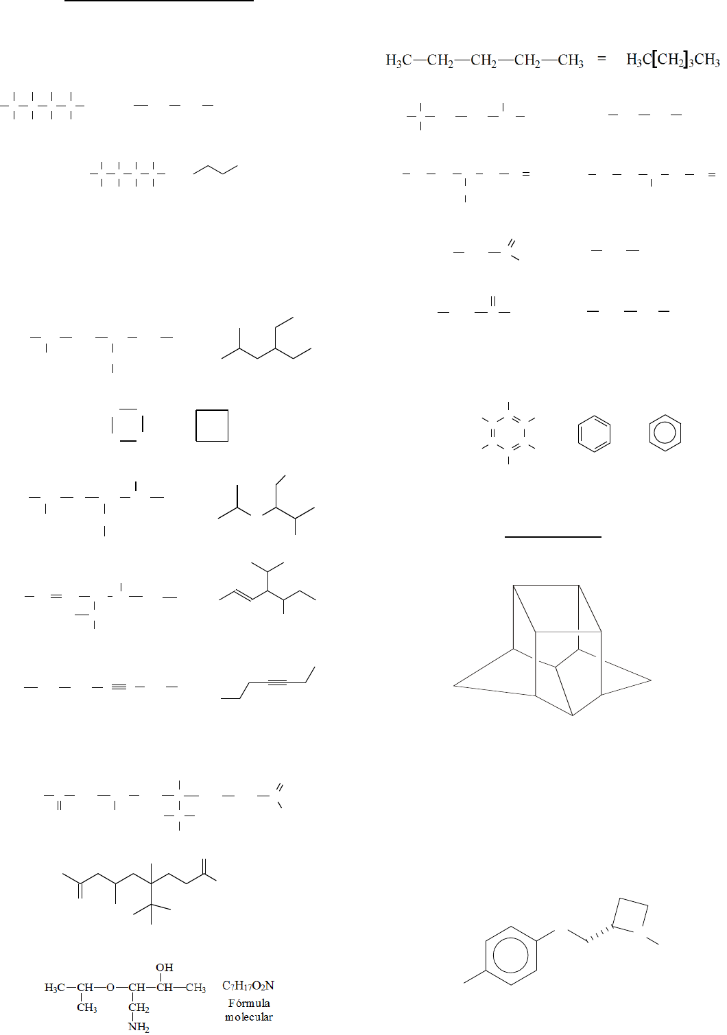 <p>A representação de fórmulas estruturais</p><p>Os químicos orgânicos usam várias maneiras para escrever as</p><p>fórmulas estruturais dos compostos orgânicos. Os tipos mais comuns de</p><p>representação são: fórmula de traço, fórmula condensada e fórmula de linha.</p><p>Na fórmula de linha assumimos que o número de átomos</p><p>hidrogênio, necessário para satisfazer as valências do átomo de carbono, estão</p><p>presentes mas não os escrevemos.Outros átomos são escritos. Cada ponto de</p><p>intersecção se duas ou mais linhas e o final de uma linha representam um</p><p>átomo de carbono, a não ser que algum outro átomo esteja sendo incluído.</p><p>Os carbonos da tripla ligação e os seus vizinhos devem ser</p><p>representados em linha reta devido à geometria linear desse tipo de carbono.</p><p>A fórmula molecular indica o número total de cada átomo na</p><p>molécula.</p><p>As fórmulas condensadas podem ser simplificadas pelo uso de</p><p>parênteses, colchetes, omissão de algumas ligações ou condensações de</p><p>ramificações.</p><p>A simplificação abaixo é muito utilizada nas fórmulas estruturais.</p><p>No momento o importante e saber interpretar a simbologia do círculo que</p><p>substitui três duplas alternadas no hexágono.</p><p>Os compostos que possuem essa estrutura são denominados de</p><p>aromáticos e serão estudados posteriormente.</p><p>Exercícios propostos</p><p>01 - (UNIUBE MG) Observe a fórmula estrutural simplificada do composto</p><p>abaixo:</p><p>1 2</p><p>Com relação a este composto policíclico, todas as alternativas estão corretas,</p><p>EXCETO:</p><p>a)Contém átomos de carbono terciários.</p><p>b)Sua fórmula molecular é C12H14.</p><p>c)Os átomos de carbono de números 1 e 2 apresentam geometria trigonal</p><p>plana.</p><p>d)Não contém átomos de carbono primários.</p><p>02 - (UFLA MG) A molécula representada abaixo, desenvolvida</p><p>recentemente, é um potente analgésico. Os números de átomos de hidrogênio</p><p>e de carbono existentes nessa estrutura molecular são, respectivamente:</p><p>Cl</p><p>O</p><p>N</p><p>H</p><p>a)16 e 9 b)12 e 10 c)7 e 9 d)8 e 10</p><p>CH</p><p>H</p><p>H</p><p>C</p><p>H</p><p>H</p><p>C</p><p>H</p><p>H</p><p>C</p><p>H</p><p>H</p><p>H H3C CH2 CH2 CH3 H3CCH2CH2CH3</p><p>Fórmula de traço</p><p>Fórmulas condensadas</p><p>ou</p><p>CH</p><p>H</p><p>H</p><p>C</p><p>H</p><p>H</p><p>C</p><p>H</p><p>H</p><p>C</p><p>H</p><p>H</p><p>H</p><p>Fórmula de traço</p><p>Fórmula</p><p>de linha</p><p>H3C CH CH2 CH</p><p>CH3 CH2</p><p>CH3</p><p>CH2 CH3 =</p><p>H2C CH2</p><p>H2C CH2</p><p>=</p><p>H3C CH O CH</p><p>CH3 CH2</p><p>NH2</p><p>CH CH3</p><p>OH</p><p>O</p><p>NH2</p><p>OH</p><p>=</p><p>H3C CH CH CH</p><p>CH</p><p>CH</p><p>CH3</p><p>Br</p><p>H3C</p><p>CH2 CH3</p><p>Br</p><p>=</p><p>H3C CH2 CH2 C C CH2 CH3</p><p>=</p><p>H3C C</p><p>O</p><p>CH2 CH</p><p>CH3</p><p>CH2 C</p><p>CH3</p><p>C</p><p>CH3</p><p>CH3H3C</p><p>CH2 CH2 C</p><p>O</p><p>OH</p><p>O</p><p>O</p><p>OH</p><p>=</p><p>=H3C C</p><p>CH3</p><p>CH3</p><p>CH2 CH2 CH</p><p>CH3</p><p>CH3 (CH3)3C CH2 CH2 CH(CH3)2</p><p>H3C CH2 CH2 CH</p><p>CH2</p><p>CH3</p><p>CH2 CH CH2 H3C CH2 CH2 CH</p><p>C2H5</p><p>CH2 CH CH2=</p><p>=H3C CH2 C</p><p>O</p><p>OH</p><p>H3C CH2 COOH</p><p>=H3C CH2 C</p><p>O</p><p>CH3 H3C CH2 CO CH3</p><p>C</p><p>C C</p><p>C C</p><p>C</p><p>H</p><p>H</p><p>H</p><p>H</p><p>H</p><p>H</p><p>= =</p><p>03 - (UFU MG) O anuleno é um hidrocarboneto aromático que apresenta a</p><p>seguinte fórmula estrutural simplificada:</p><p>Sobre este composto pode-se afirmar que</p><p>a)tem fórmula molecular C18H20 , 9 ligações pi (π) e ângulos de 109° entre as</p><p>ligações carbono-carbono.</p><p>b)tem fórmula molecular C18H18 , 9 ligações pi (π) e ângulos de 120° entre as</p><p>ligações carbono-carbono.</p><p>c)tem fórmula molecular C18H16 , 9 elétrons pi (π) e ângulos de 109° entre as</p><p>ligações carbono-carbono.</p><p>d)tem fórmula molecular C18H20 , 9 elétrons pi (π) e ângulos de 120° entre as</p><p>ligações carbono-carbono.</p><p>04 - (USJT SP) As auxinas correspondem a um grupo de substâncias que</p><p>agem no crescimento das plantas e controlam muitas outras atividades</p><p>fisiológicas. Foram os primeiros hormônios descobertos nos vegetais. A</p><p>auxina natural do vegetal é o ácido indolacético (AIA), um composto orgânico</p><p>simples, com a seguinte fórmula estrutural.</p><p>N</p><p>H</p><p>CH2 COOH</p><p>Qual é a sua fórmula molecular?</p><p>a)C10H11O2N b)C10H11NO c)C10H9NO2</p><p>d)C11H8ON e)C10H10ON</p><p>05 - (UNIFOR CE) O ácido araquedônico tem a fórmula</p><p>COOH</p><p>CH3</p><p>Em uma molécula desse ácido os números de átomos de carbono e hidrogênio</p><p>são, respectivamente,</p><p>a)20 e 32 b)20 e 30 c)20 e 20 d)19 e 30 e)18 e 32</p><p>06 - (ENEM)O ácido acetilsalicílico (AAS) é uma substância utilizada como</p><p>fármaco analgésico no alívio das dores de cabeça. A figura abaixo é a</p><p>representação estrutural da molécula do AAS.</p><p>Considerando-se essa representação, é correto afirmar que a fórmula</p><p>molecular do AAS é</p><p>a) C7O2H7 COOH</p><p>b) C8O2H16COOH</p><p>c) C8O2H7COOH</p><p>d) C8O2H3COOH</p><p>e) C7O2H3COOH</p><p>07 - (UFAL) O colesterol é um esteróide abundante no corpo humano e está</p><p>presente em alimentos de origem animal. A maior parte do colesterol presente</p><p>no corpo é sintetizada pelo próprio organismo. O alto nível de colesterol no</p><p>sangue é prejudicial à saúde e tem sido associado a doenças cardiovasculares.</p><p>Dado a estrutura do colesterol,</p><p>CH3</p><p>HO</p><p>CH3</p><p>CH3</p><p>CH3</p><p>CH3</p><p>o número de átomos de carbono e hidrogênio presentes na estrutura são,</p><p>respectivamente,</p><p>a)27 e 46.</p><p>b)27 e 45.</p><p>c)26 e 45.</p><p>d)25 e 44.</p><p>e)25 e 43.</p><p>08 - (Centro Universitário de Franca SP) A fórmula molecular da vitamina</p><p>C é</p>