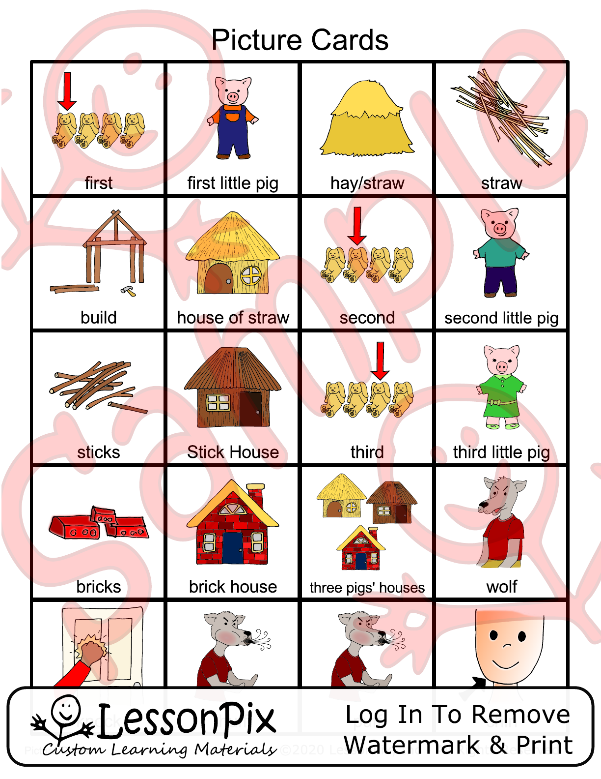 <p>Picture Cards first first little pig hay/straw straw build house of straw second second little pig sticks Stick House third third little pig bricks brick house three pigs' houses wolf LessonPix Log In To Remove Custom Learning Materials Watermark & Print</p>