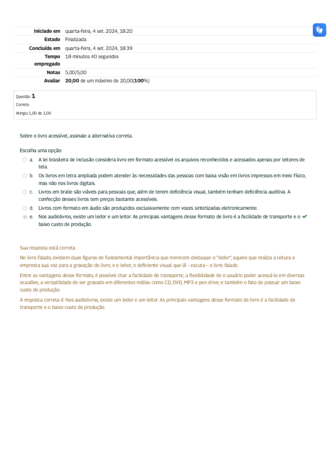 <p>Iniciado em quarta-feira, 4 set. 2024, 18:20</p><p>Estado Finalizada</p><p>Concluída em quarta-feira, 4 set. 2024, 18:39</p><p>Tempo</p><p>empregado</p><p>18 minutos 40 segundos</p><p>Notas 5,00/5,00</p><p>Avaliar 20,00 de um máximo de 20,00(100%)</p><p>Questão 1</p><p>Correto</p><p>Atingiu 1,00 de 1,00</p><p>Sobre o livro acessível, assinale a alternativa correta.</p><p>Escolha uma opção:</p><p>a. A lei brasileira de inclusão considera livro em formato acessível os arquivos reconhecidos e acessados apenas por leitores de</p><p>tela.</p><p>b. Os livros em letra ampliada podem atender às necessidades das pessoas com baixa visão em livros impressos em meio físico,</p><p>mas não nos livros digitais.</p><p>c. Livros em braile são viáveis para pessoas que, além de terem de�ciência visual, também tenham de�ciência auditiva. A</p><p>confecção desses livros tem preços bastante acessíveis.</p><p>d. Livros com formato em áudio são produzidos exclusivamente com vozes sintetizadas eletronicamente.</p><p>e. Nos audiolivros, existe um ledor e um leitor. As principais vantagens desse formato de livro é a facilidade de transporte e o</p><p>baixo custo de produção.</p><p></p><p>Sua resposta está correta.</p><p>No livro falado, existem duas �guras de fundamental importância que merecem destaque: o “ledor”, aquele que realiza a leitura e</p><p>empresta sua voz para a gravação do livro; e o leitor, o de�ciente visual que lê – escuta – o livro falado.</p><p>Entre as vantagens desse formato, é possível citar a facilidade de transporte; a �exibilidade de o usuário poder acessá-lo em diversas</p><p>ocasiões; a versatilidade de ser gravado em diferentes mídias como CD, DVD, MP3 e pen drive; e também o fato de possuir um baixo</p><p>custo de produção.</p><p>A resposta correta é: Nos audiolivros, existe um ledor e um leitor. As principais vantagens desse formato de livro é a facilidade de</p><p>transporte e o baixo custo de produção.</p><p>Questão 2</p><p>Correto</p><p>Atingiu 1,00 de 1,00</p><p>Questão 3</p><p>Correto</p><p>Atingiu 1,00 de 1,00</p><p>Sobre a utilização do recurso da audiodescrição em livros, marque a alternativa mais adequada:</p><p>Escolha uma opção:</p><p>a. A utilização da audiodescrição em livros impede o acesso à leitura por pessoas sem de�ciência.</p><p>b. A utilização da audiodescrição em livros facilita a leitura por pessoas analfabetas, mas prejudica a leitura por pessoas</p><p>alfabetizadas.</p><p>c. O recurso da audiodescrição permite que pessoas com de�ciência visual ouçam o livro ao mesmo tempo em que as</p><p>pessoas que enxergam fazem a leitura do livro físico.</p><p></p><p>d. A audiodescrição impede a leitura simultânea por pessoas com de�ciência e sem de�ciência, alfabetizadas ou analfabetas.</p><p>e. A audiodescrição na literatura é voltada exclusivamente para pessoas com de�ciência visual, não sendo útil às pessoas</p><p>analfabetas, por exemplo.</p><p>Sua resposta está correta.</p><p>O recurso da audiodescrição permite que pessoas com de�ciência visual ouçam o livro ao mesmo tempo em que as pessoas que</p><p>enxergam fazem a leitura do livro físico. A audiodescrição possibilita ainda a leitura por pessoas analfabetas.</p><p>A resposta correta é: O recurso da audiodescrição permite que pessoas com de�ciência visual ouçam o livro ao mesmo tempo em que</p><p>as pessoas que enxergam fazem a leitura do livro físico.</p><p>As tirinhas são narrativas visuais com poucos quadros cuja principal característica é o humor. Sobre a descrição de tirinhas, marque a</p><p>alternativa mais adequada:</p><p>Escolha uma opção:</p><p>a. A descrição de tirinhas não precisa levar em consideração as características físicas dos personagens, mesmo quando eles são</p><p>estereotipados.</p><p>b. Antes de descrever os quadros, recomenda-se mencionar quem são os personagens e quais são suas características. Além</p><p>disso, é importante falar sobre o cenário e sobre o tempo.</p><p></p><p>c. Os balões onde aparecem as falas dos personagens não são relevantes para o trabalho de descrição, pois a informação mais</p><p>importante é o texto da fala.</p><p>d. Os elementos grá�cos, como pontos de interrogação, exclamação, gotas de suor, raios e núvens, quando descritos, prejudicam</p><p>a interpretação das pessoas com de�ciência visual.</p><p>e. A descrição de tirinhas não precisa ser feita quadro a quadro, pois a quantidade de detalhes prejudica a compreensão do todo</p><p>pelas pessoas com de�ciência visual.</p><p>Sua resposta está correta.</p><p>Uma das recomendações feitas pela audiodescritora Lívia Motta é que, antes da descrição de cada quadrinho, seja mencionado quem</p><p>são e quantos são os personagens, caracterizando-os. Além disso, é recomendável falar sobre o cenário e o tempo (dia, noite, inverno,</p><p>verão), para só depois fazer a descrição de cada quadrinho.</p><p>A resposta correta é: Antes de descrever os quadros, recomenda-se mencionar quem são os personagens e quais são suas</p><p>características. Além disso, é importante falar sobre o cenário e sobre o tempo.</p><p>Questão 4</p><p>Correto</p><p>Atingiu 1,00 de 1,00</p><p>Sobre a descrição de propagandas e publicidades divulgadas em banners, cards e �yers, assinale a alternativa mais adequada:</p><p>Escolha uma opção:</p><p>a. Como o banner é uma imagem simples, com poucas ilustrações e com informações muito objetivas, não é necessário ter</p><p>descrição para que o conteúdo seja acessível aos so�wares de leitura de tela.</p><p>b. O card é uma forma de publicidade que possui uma foto e um conjunto pequeno de informações, dispensando a descrição por</p><p>ser acessível a qualquer so�ware de leitura de tela.</p><p>c. O �yer possui muitos elementos visuais e informações, de modo que a descrição deve ser feita ap