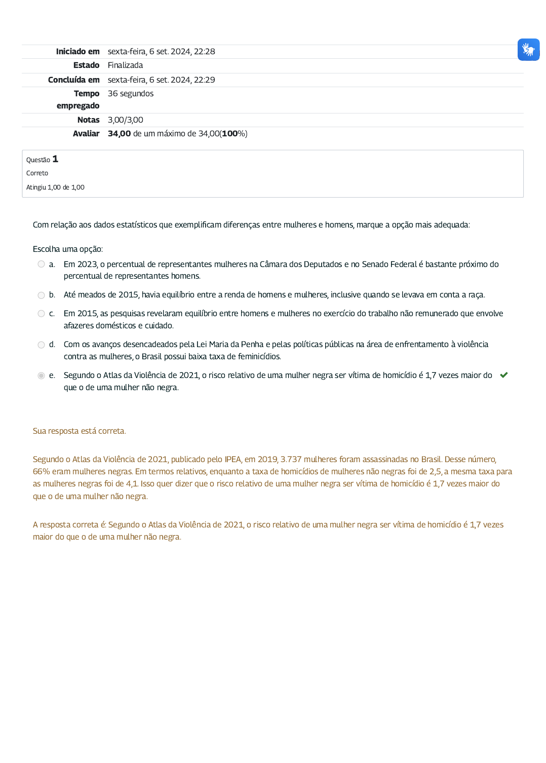 <p>Iniciado em sexta-feira, 6 set. 2024, 22:28</p><p>Estado Finalizada</p><p>Concluída em sexta-feira, 6 set. 2024, 22:29</p><p>Tempo</p><p>empregado</p><p>36 segundos</p><p>Notas 3,00/3,00</p><p>Avaliar 34,00 de um máximo de 34,00(100%)</p><p>Questão 1</p><p>Correto</p><p>Atingiu 1,00 de 1,00</p><p>Com relação aos dados estatísticos que exempli�cam diferenças entre mulheres e homens, marque a opção mais adequada:</p><p>Escolha uma opção:</p><p>a. Em 2023, o percentual de representantes mulheres na Câmara dos Deputados e no Senado Federal é bastante próximo do</p><p>percentual de representantes homens.</p><p>b. Até meados de 2015, havia equilíbrio entre a renda de homens e mulheres, inclusive quando se levava em conta a raça.</p><p>c. Em 2015, as pesquisas revelaram equilíbrio entre homens e mulheres no exercício do trabalho não remunerado que envolve</p><p>afazeres domésticos e cuidado.</p><p>d. Com os avanços desencadeados pela Lei Maria da Penha e pelas políticas públicas na área de enfrentamento à violência</p><p>contra as mulheres, o Brasil possui baixa taxa de feminicídios.</p><p>e. Segundo o Atlas da Violência de 2021, o risco relativo de uma mulher negra ser vítima de homicídio é 1,7 vezes maior do</p><p>que o de uma mulher não negra.</p><p></p><p>Sua resposta está correta.</p><p>Segundo o Atlas da Violência de 2021, publicado pelo IPEA, em 2019, 3.737 mulheres foram assassinadas no Brasil. Desse número,</p><p>66% eram mulheres negras. Em termos relativos, enquanto a taxa de homicídios de mulheres não negras foi de 2,5, a mesma taxa para</p><p>as mulheres negras foi de 4,1. Isso quer dizer que o risco relativo de uma mulher negra ser vítima de homicídio é 1,7 vezes maior do</p><p>que o de uma mulher não negra.</p><p>A resposta correta é: Segundo o Atlas da Violência de 2021, o risco relativo de uma mulher negra ser vítima de homicídio é 1,7 vezes</p><p>maior do que o de uma mulher não negra.</p><p>Questão 2</p><p>Correto</p><p>Atingiu 1,00 de 1,00</p><p>Questão 3</p><p>Correto</p><p>Atingiu 1,00 de 1,00</p><p>Considerando os conceitos de poder simbólico e violência simbólica, marque a opção mais adequada:</p><p>Escolha uma opção:</p><p>a. O poder simbólico é o poder invisível exercido pela maioria sobre uma minoria.</p><p>b. A língua é um dos veículos pelos quais o poder simbólico e a violência simbólica podem ser exercidos. </p><p>c. A violência simbólica é uma violência sutil e não contribui para a violência física.</p><p>d. A violência simbólica de gênero não possui relação com formas mais explícitas de violência de gênero.</p><p>e. O poder simbólico é exercido conscientemente por todas as pessoas.</p><p>Sua resposta está correta.</p><p>A língua é um dos veículos por meio do qual o poder simbólico e, consequentemente, a violência simbólica podem ser exercidos. Trata-</p><p>se de um sistema poderosíssimo, pois a língua é nosso veículo de interface com o mundo. No manual da Unesco, que desde o �nal da</p><p>década de 1980 discute usos neutros em termos de gênero na língua, lê-se que “Há uma crescente conscientização de que a língua</p><p>não simplesmente re�ete nosso modo de pensar: ela também o molda”.</p><p>A resposta correta é: A língua é um dos veículos pelos quais o poder simbólico e a violência simbólica podem ser exercidos.</p><p>Considerando a linguagem inclusiva de gênero, marque a opção mais adequada:</p><p>Escolha uma opção:</p><p>a. Ao utilizar o gênero masculino de modo genérico, a língua não reproduz invisibilidades históricas e sociais relativas às</p><p>mulheres.</p><p>b. Usos excludentes da língua consideram que masculino e feminino existem sem qualquer relação de variação.</p><p>c. Usos sexistas da língua não contribuem para que modos mais visíveis de violência aconteçam.</p><p>d. A inclusão de gênero é uma opção de uso da língua que busca desconstruir ideias sexistas, como a premissa de que o</p><p>masculino é o sujeito neutro e universal.</p><p></p><p>e. O apagamento das mulheres da língua não é considerado exemplo de violência simbólica.</p><p>Sua resposta está correta.</p><p>A inclusão de gênero é uma opção de uso da língua em busca da desconstrução de ideias sexistas, como a premissa de que o masculino</p><p>é o sujeito neutro e universal.</p><p>A resposta correta é: A inclusão de gênero é uma opção de uso da língua que busca desconstruir ideias sexistas, como a premissa de</p><p>que o masculino é o sujeito neutro e universal.</p>