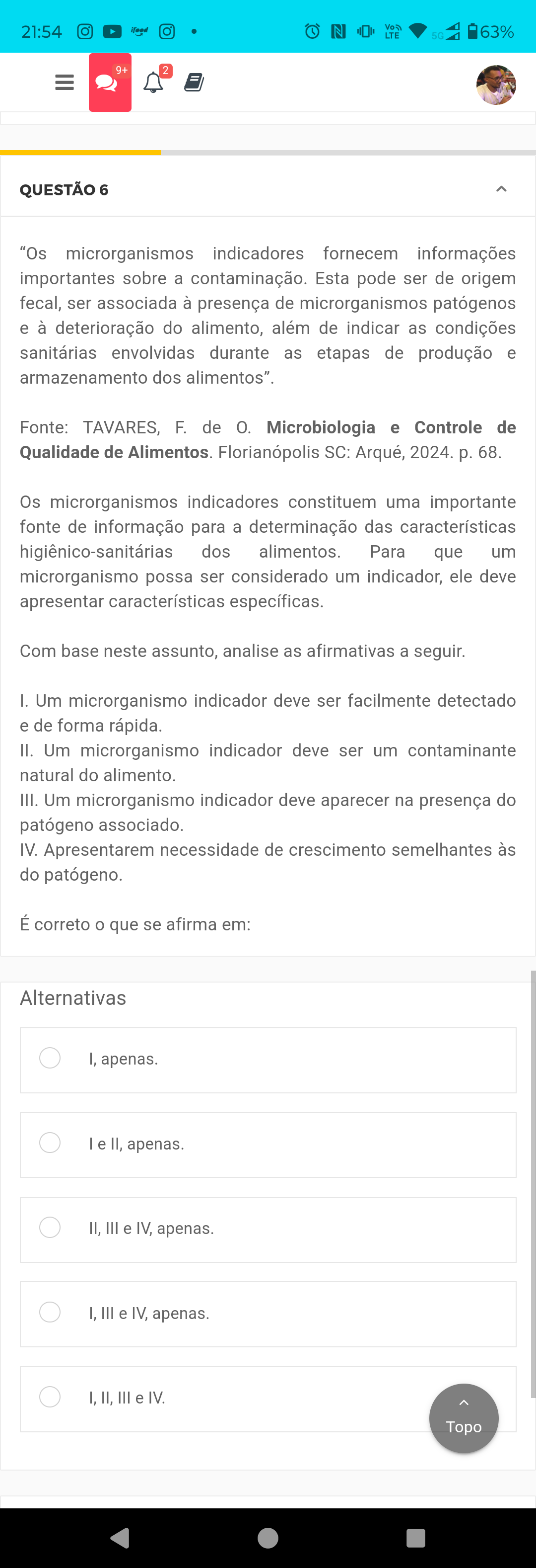 <p>21:54 N LTE 5G 63% 2 QUESTÃO 6 "Os microrganismos indicadores fornecem informações importantes sobre a contaminação. Esta pode ser de origem fecal, ser associada à presença de microrganismos patógenos e à deterioração do alimento, além de indicar as condições sanitárias envolvidas durante as etapas de produção e armazenamento dos alimentos". Fonte: TAVARES, F. de O. Microbiologia e Controle de Qualidade de Alimentos. Florianópolis SC: Arqué, 2024. p. 68. Os microrganismos indicadores constituem uma importante fonte de informação para a determinação das características higiênico-sanitárias dos alimentos. Para que um microrganismo possa ser considerado um indicador, ele deve apresentar características específicas. Com base neste assunto, analise as afirmativas a seguir. I. Um microrganismo indicador deve ser facilmente detectado e de forma rápida. II. Um microrganismo indicador deve ser um contaminante natural do alimento. III. Um microrganismo indicador deve aparecer na presença do patógeno associado. IV. Apresentarem necessidade de crescimento semelhantes às do patógeno. É correto o que se afirma em: Alternativas I, apenas. e II, apenas. II, III e IV, apenas. I, III e IV, apenas. I, II, III e IV. ^ Topo</p>