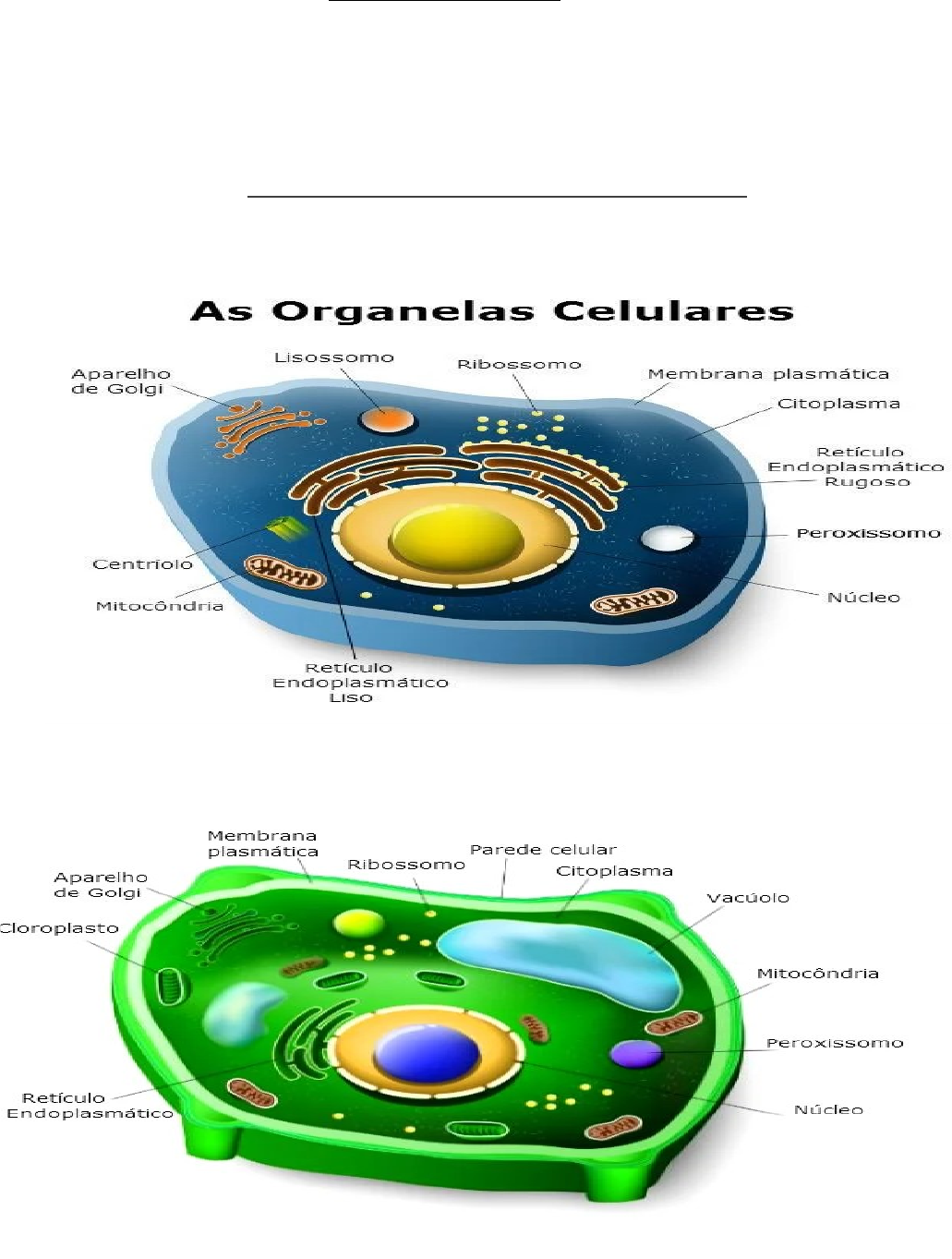 <p>ORGANELAS CELULARES</p><p>As organelas celulares são como pequenos órgãos que realizam as atividades celulares essenciais para as células. São estruturas compostas por membranas internas, com formas e funções diferentes, sendo as principais: os retículos endoplasmáticos lisos e rugosos, o aparelho de Golgi e as mitocôndrias. Nas células vegetais há também organelas específicas, os cloroplastos.</p><p>Organelas citoplasmáticas e suas funções.</p><p>É possível observar que algumas organelas ocorrem nas células vegetais que não nos animais e vice-versa. Isso acontece com os cloroplastos, presentes apenas nas células vegetais, e os centríolos, presentes nas células animais.</p><p>Organelas da célula vegetal</p><p>Uma característica importante das organelas é que são compostas por membranas internas (leia mais sobre elas no final) que lhe conferem formas e funções específicas.</p><p>Saiba mais sobre a célula animal e a célula vegetal.</p><p>Mitocôndrias</p><p>São organelas compostas por membrana dupla, sendo uma externa e uma interna que apresenta muitas dobras, as chamadas cristas mitocondriais.</p><p>As mitocôndrias são organelas especiais, com capacidade de se reproduzir, uma vez que contem moléculas de DNA circular, tal como as bactérias.</p><p>Sua função é realizar a respiração celular, que produz a maior parte da energia utilizada nas funções vitais. A primeira etapa acontece no citosol da célula e as duas últimas nas suas membranas internas.</p><p>Retículo Endoplasmático</p><p>São organelas com membranas dobradas, similares a sacos achatados. São dois os retículos, o retículo endoplasmático rugoso e o liso. No retículo endoplasmático rugoso existem ribossomos anexados à membrana, conferindo aspecto granuloso / rugoso.</p><p>Além disso sua membrana é contínua com a membrana externa do núcleo, o facilita a comunicação entre eles.</p><p>O retículo endoplasmático liso (REL) não tem ribossomos associados e por isso tem aparência lisa, é responsável pela produção de lipídios.</p><p>A função principal do retículo endoplasmático rugoso (RER) é realizar a síntese e ativação das proteína, além de transportar para outras partes da célula.</p><p>Aparelho de Golgi</p><p>Também chamado complexo de Golgi ou ainda complexo golgiense, é composto de discos achatados empilhados, formando bolsas membranosas. Suas funções são modificar, armazenar e exportar proteínas sintetizadas no RER. Algumas dessas proteínas são glicosiladas, ou seja, sofrem reação de adição de um açúcar no RE e no golgi o processo é completado.</p><p>Além disso, o aparelho de Golgi produz vesículas que brotam e se soltam originando os lisossomos primários. No momento em que esses lisossomos primários se fundem aos endossomas formam vacúolos digestórios ou lisossomos secundários.</p><p>Lisossomos</p><p>Os lisossomos são envolvidos apenas pela bicamada lipídica e no seu interior há enzimas digestivas. Sua função é digerir moléculas orgânicas como lipídios, carboidratos, proteínas e ácidos nucleicos (DNA e RNA). No interior dos lisossomos existem enzimas digestivas. As enzimas favorecem a aceleração da quebra de moléculas, transformando-as em pequenos porções, o que conhecemos como digestão. O interior dos lisossomos é ácido, pois é esse, o ambiente perfeito para ação dessas enzimas digestivas. As moléculas a serem digeridas são englobadas por endocitose e entram na célula envolvidas em vesículas formadas a partir da membrana chamados endossomas. Depois fundem-se com os lisossomos primários e são quebradas, originando partes menores, como os ácidos graxos. Essas moléculas pequenas saem do lisossomo e são aproveitadas no citosol da célula.</p><p>Peroxissomos</p><p>Os peroxissomos são pequenas organelas membranosas, que contêm no seu interior enzimas oxidases, e estão presentes em células animais e vegetais.</p><p>A principal função é oxidar os ácidos graxos para a síntese de colesterol e também para serem usados como matéria-prima na respiração celular.</p><p>Encontram-se, majoritariamente, nas células dos rins e do fígado. Lá, neutralizam os efeitos tóxicos de substâncias consumidas como, por exemplo, o álcool. Além disso, participam da produção de sais biliares.</p><p>Nas reações de oxidação é produzido o peróxido de hidrogênio e por isso o nome da organela.</p><p>Vacúolos</p><p>Os vacúolos são envolvidos por membrana e preenchidos com fluido diferente do citoplasma. São comuns em células animais e vegetais, contudo são maiores e mais volumosos nas células vegetais. Sua função é armazenar água e nutrientes, além de regular mecanismos de pressão osmótica.</p><p>O controle de entrada e saída de água (osmose) nos tecidos vegetais regula a rigidez das estruturas. Isso permite que, algumas plantas, como, por exemplo, as herbáceas, fiquem eretas. Outros organismos também possuem vacúolos, como as bactérias. Nelas, os vacúolos auxiliam na ingestão, digestão e eliminação de substâncias.</p><p>Plastos</p><p>São organelas presentes apenas em células vegetais e de algas. Podem ser de 3 tipos básicos:leucoplastos, cromoplastos e cloroplastos. Todos se originam a partir de pequenas vesículas presentes nas células embrionárias das plantas, os proplastos, que são incolores.</p><p>Quando maduros adquirem coloração característica, a depender do tipo de pigmento que armazenam. Os plastos podem se autoduplicar, pois possuem DNA próprio, além de serem capazes se transformar em outros tipos de plastos de acordo com a necessidade da célula.</p><p>Assim, por exemplo, um cromoplasto pode se tornar um cloroplasto ou um leucoplasto, ou vice-versa. Veja a seguir sobre cada um:</p><p>· Os leucoplastos não tem cor, armazenam amido (reserva energética) e estão presentes em alguns tipos de raízes e caules;</p><p>· Os cromoplastos são responsáveis pela co