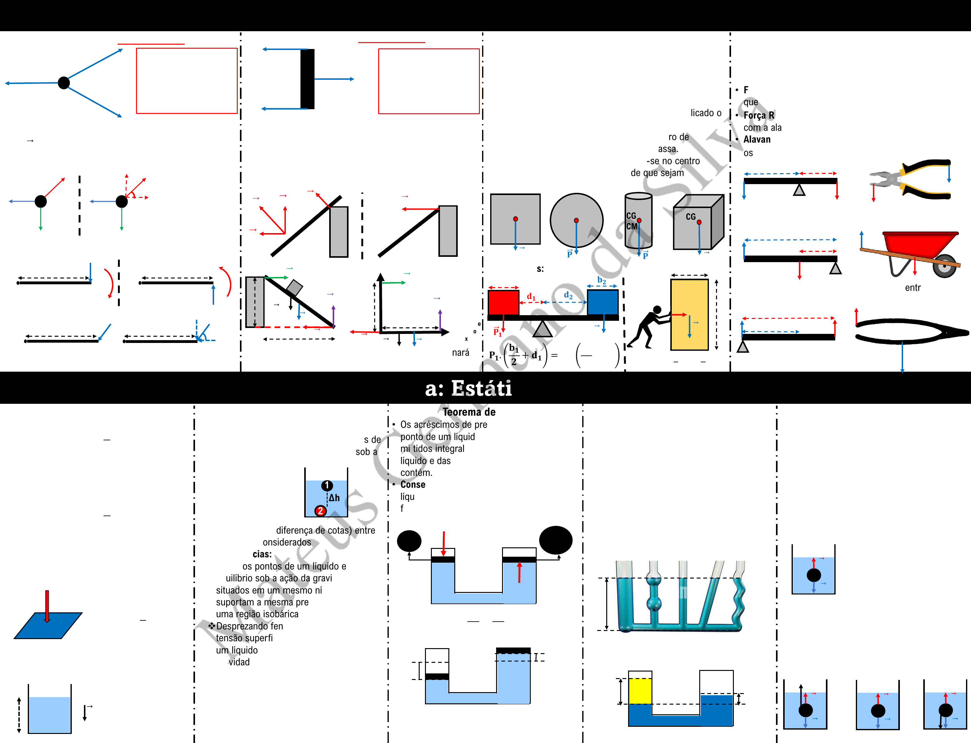 <p>Estática dos Sólidos</p><p>Introdução</p><p>• Massa específica/ densidade absoluta (μ):</p><p>μ =</p><p>m</p><p>V</p><p>❖m = massa de uma substância pura</p><p>❖V = volume de uma substância pura</p><p>❖Unidade: g/m³ = kg/L</p><p>❖Está relacionada a uma substância</p><p>• Densidade de um corpo (d):</p><p>d =</p><p>m</p><p>V</p><p>❖m = massa de uma substância pura</p><p>❖V = volume de uma substância pura</p><p>❖Unidade: g/m³ = kg/L</p><p>❖Está relacionada a um corpo</p><p>• O conceito de Pressão:</p><p>p =</p><p>F</p><p>A</p><p>❖Unidade: N/m²</p><p>1 atm ≅ 105 Pa ≅ 105 N/m2.</p><p>• Pressão exercida por uma coluna líquida:</p><p>p = μ. g. h</p><p>Teorema de Stevin – “Lei Fundamental</p><p>da Hidrostática”</p><p>• Diferença de pressões entre dois pontos de</p><p>um líquido homogêneo em equilíbrio sob a</p><p>ação da gravidade</p><p>p2 – p1 = d. g. Δh</p><p>❖Δh = desnível (diferença de cotas) entre</p><p>os pontos considerados</p><p>• Consequências:</p><p>❖Todos os pontos de um líquido em</p><p>equilíbrio sob a ação da gravidade,</p><p>situados em um mesmo nível horizontal,</p><p>suportam a mesma pressão, constituindo</p><p>uma região isobárica.</p><p>❖Desprezando fenômenos relativos à</p><p>tensão superficial, a superfície livre de</p><p>um líquido em equilíbrio sob a ação da</p><p>gravidade é plana e horizontal.</p><p>• Se um dos pontos considerados estiverem</p><p>em contato com a atmosfera:</p><p>p2 = patm + d. g. Δh</p><p>Pressão Atmosférica (po ou patm):</p><p>1 atm = 760 mmHg ≅ 105 Pa ≅ 105 N/m2</p><p>• Depende da altitude do local</p><p>Teorema de Pascal</p><p>• Os acréscimos de pressão sofridos por um</p><p>ponto de um líquido em equilíbrio são trans</p><p>mi tidos integralmente a todos os pontos do</p><p>líquido e das paredes do recipiente que o</p><p>contém.</p><p>• Consequência: todos os pontos de um</p><p>líquido em equilíbrio exposto à atmosfera</p><p>ficam submetidos à pressão atmosférica.</p><p>Prensa Hidráulica</p><p>𝐅𝟏</p><p>𝐀𝟏</p><p>=</p><p>𝐅𝟐</p><p>𝐀𝟐</p><p>h1. A1 = h2. A2</p><p>❖o trabalho realizado nos deslocamentos de</p><p>cada êmbolo é o mesmo</p><p>Teorema de Arquimedes</p><p>• Quando um corpo é imerso total ou</p><p>parcialmente em um fluido em equilíbrio sob</p><p>a ação da gravidade, ele recebe do fluido</p><p>uma força denominada empuxo. Tal força</p><p>tem sempre direção vertical, sentido de</p><p>baixo para cima e intensidade igual à do</p><p>peso do fluido deslocado pelo corpo.</p><p>E = μfluido.Vdo corpo submerso . g</p><p>• O volume deslocado é igual ao volume do</p><p>objeto que está submerso</p><p>Casos de Flutuação</p><p>• Corpo afundando: a densidade do corpo é</p><p>maior que a do fluido → P > E</p><p>• Corpo em equilíbrio: as densidades do</p><p>corpo e do fluido são iguais → P = E</p><p>• Corpo boiando: a densidade do corpo é</p><p>menor que a densidade do fluido → P < E</p><p>Equilíbrio do Corpo Extenso</p><p>• Equilíbrio de Translação: a resultante do sistema de</p><p>forças seja nula</p><p>• Equilíbrio de Rotação: a soma algébrica dos momentos</p><p>das forças do sistema, em relação a qualquer ponto,</p><p>seja nula</p><p>ΣMHorário = ΣMAnti−horário</p><p>• Obs:</p><p>• Atuação das Forças</p><p>❖Dica: Escolha como ponto fixo aquele que eliminará</p><p>mais forças desconhecidas</p><p>Equilíbrio do Ponto Material</p><p>• Condição: resultante das forças que nele atuam = 0.</p><p>Ԧ𝐅𝐑 = 𝟎 ൝</p><p>𝐅𝐨𝐫ç𝐚𝐬 𝐧𝐨 𝐞𝐢𝐱𝐨 𝐱: ΣFmesmo lado = ΣFlado oposto</p><p>𝐅𝐨𝐫ç𝐚𝐬 𝐧𝐨 𝐞𝐢𝐱𝐨 𝐲: ΣFmesmo lado = ΣFlado oposto</p><p>• Obs: Projeção de Forças</p><p>Torque ou Momento de uma Força</p><p>M = ± F. d</p><p>M = + F. d M = - F. d</p><p>M = F.d.sen θ</p><p>• Unidade no S.I.: Newton. Metro (N. m)</p><p>Centro de Gravidade e Centro de Massa</p><p>• Centro de Massa (CM) de um sistema físico = o ponto</p><p>onde se admite concentrada, para efeito de cálculos,</p><p>toda a sua massa</p><p>• Centro de Gravidade (CG) de um corpo ou de um</p><p>sistema de pontos materiais discretos = um</p><p>determinado ponto onde podemos considerar aplicado o</p><p>peso total do corpo ou do sistema.</p><p>❖Em campo gravitacional uniforme, o centro de</p><p>gravidade coincide com o centro de massa.</p><p>❖Em corpos homogêneos: encontra -se no centro</p><p>geométrico desses corpos, desde que sejam</p><p>homogêneos.</p><p>• Aplicações:</p><p>Alavancas</p><p>• São barras geralmente utilizadas para ampliar a</p><p>intensidade de forças. Para que possam operar, elas</p><p>necessitam de um ponto de apoio denominado fulcro.</p><p>• Força Potente ( Ԧ𝐅𝐏) = força exercida na alavanca por</p><p>quem a usa</p><p>• Força Resistente ( Ԧ𝐅𝐑) = força que se pretende vencer</p><p>com a alavanca.</p><p>• Alavanca interfixa: o fulcro (ponto de apoio) está entre</p><p>os pontos de aplicação de Ԧ𝐅𝐏 e Ԧ𝐅𝐑.</p><p>• Alavanca inter –resistente: Ԧ𝐅𝐑 está aplicada entre a Ԧ𝐅𝐏</p><p>e o fulcro.</p><p>• Alavanca interpotente: Ԧ𝐅𝐏 está aplicada entre o fulcro e</p><p>o ponto de aplicação da Ԧ𝐅𝐑.</p><p>Hidrostática: Estática dos Fluídos</p><p>dd</p><p>Ԧ𝐅</p><p>Ԧ𝐅</p><p>Corpo cujas</p><p>dimensões não</p><p>interferem no estudo</p><p>de determinado</p><p>fenômeno</p><p>Corpo cujas</p><p>dimensões interferem</p><p>no estudo de</p><p>determinado</p><p>fenômeno</p><p>d</p><p>Ԧ𝐅</p><p>d</p><p>Ԧ𝐅Ԧ𝐅𝐲</p><p>Ԧ𝐅𝐱</p><p>Ԧ𝐅𝟏</p><p>Ԧ𝐅𝟐</p><p>Ԧ𝐅𝟑</p><p>Ԧ𝐅𝟏</p><p>Ԧ𝐅𝟐</p><p>Ԧ𝐅𝟑</p><p>Ԧ𝐅𝟏</p><p>Ԧ𝐅𝟐</p><p>Ԧ𝐅𝟑</p><p>Ԧ𝐅𝟏</p><p>Ԧ𝐅𝟐</p><p>Ԧ𝐅𝟑</p><p>Ԧ𝐅𝟏𝐱</p><p>Ԧ𝐅𝟏𝐲</p><p>൝</p><p>𝐅𝟏