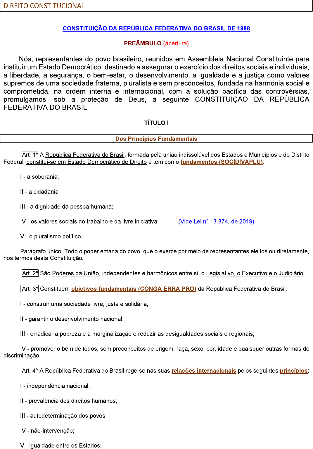 <p>DIREITO CONSTITUCIONAL CONSTITUIÇÃO DA FEDERATIVA DO BRASIL DE 1988 PREÂMBULO (abertura) Nós, representantes do povo brasileiro, reunidos em Assembleia Nacional Constituinte para instituir um Estado Democrático, destinado a assegurar o exercício dos direitos sociais e individuais, a liberdade, a segurança, o bem-estar, o desenvolvimento, a igualdade e a justiça como valores supremos de uma sociedade fraterna, pluralista e sem preconceitos, fundada na harmonia social e comprometida, na ordem interna e internacional, com a solução pacífica das controvérsias, promulgamos, sob a proteção de Deus, a seguinte CONSTITUIÇÃO DA FEDERATIVA DO BRASIL. TÍTULO Dos Princípios Fundamentais Art. 1° A República Federativa do Brasil, formada pela união indissolúvel dos Estados e Municípios e do Distrito Federal, constitui-se em Estado Democrático de Direito e tem como fundamentos (SOCIDIVAPLU): - a soberania; - a cidadania III - a dignidade da pessoa humana; IV os valores sociais do trabalho e da livre iniciativa; (Vide Lei n° 13.874, de 2019) V o pluralismo político. Parágrafo único. Todo o poder emana do povo, que o exerce por meio de representantes eleitos ou diretamente, nos termos desta Constituição. Art. 2° São Poderes da União, independentes e harmônicos entre si, o Legislativo, o Executivo e o Judiciário. Art. 3° Constituem objetivos fundamentais (CONGA ERRA PRO) da República Federativa do Brasil: construir uma sociedade livre, justa e solidária; garantir o desenvolvimento nacional; III erradicar a pobreza e a marginalização e reduzir as desigualdades sociais e regionais; IV promover o bem de todos, sem preconceitos de origem, raça, sexo, cor, idade e quaisquer outras formas de discriminação. Art. 4° A República Federativa do Brasil rege-se nas suas relações internacionais pelos seguintes princípios: independência nacional; prevalência dos direitos humanos; III autodeterminação dos povos; IV não-intervenção; V igualdade entre os Estados;</p>