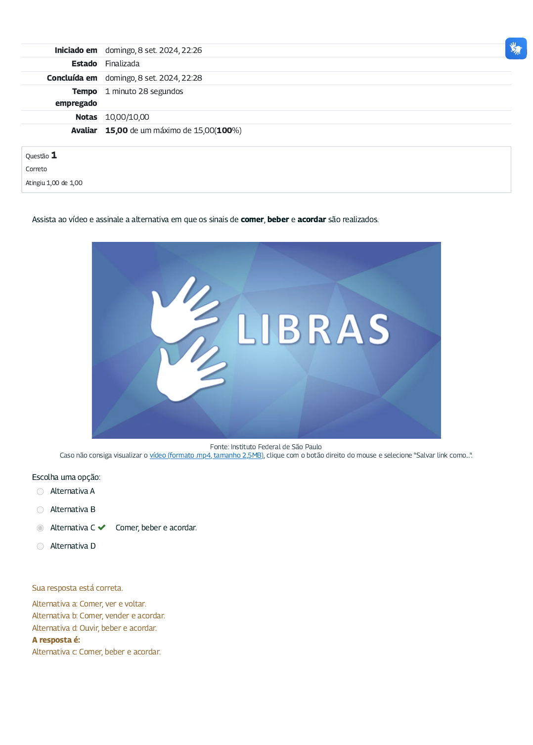 <p>Iniciado em domingo, 8 set. 2024, 22:26</p><p>Estado Finalizada</p><p>Concluída em domingo, 8 set. 2024, 22:28</p><p>Tempo</p><p>empregado</p><p>1 minuto 28 segundos</p><p>Notas 10,00/10,00</p><p>Avaliar 15,00 de um máximo de 15,00(100%)</p><p>Questão 1</p><p>Correto</p><p>Atingiu 1,00 de 1,00</p><p>Assista ao vídeo e assinale a alternativa em que os sinais de comer, beber e acordar são realizados.</p><p>Fonte: Instituto Federal de São Paulo</p><p>Caso não consiga visualizar o vídeo (formato .mp4, tamanho 2,5MB), clique com o botão direito do mouse e selecione "Salvar link como...".</p><p>Escolha uma opção:</p><p>Alternativa A</p><p>Alternativa B</p><p>Alternativa C Comer, beber e acordar.</p><p>Alternativa D</p><p>Sua resposta está correta.</p><p>Alternativa a: Comer, ver e voltar.</p><p>Alternativa b: Comer, vender e acordar.</p><p>Alternativa d: Ouvir, beber e acordar.</p><p>A resposta é:</p><p>Alternativa c: Comer, beber e acordar.</p><p>https://cdn.escolavirtual.gov.br/libras/v1/licoes/modulo06licao01.mp4</p><p>Questão 2</p><p>Correto</p><p>Atingiu 1,00 de 1,00</p><p>Assista ao vídeo e assinale a alternativa em que os sinais de chorar, rezar e casar são realizados.</p><p>Fonte: Instituto Federal de São Paulo</p><p>Caso não consiga visualizar o vídeo (formato .mp4, tamanho 3,9MB), clique com o botão direito do mouse e selecione "Salvar link como...".</p><p>Escolha uma opção:</p><p>Alternativa A</p><p>Alternativa B Chorar, rezar e casar.</p><p>Alternativa C</p><p>Alternativa D</p><p>Sua resposta está correta.</p><p>Alternativa a: Chorar, rezar e explicar.</p><p>Alternativa c: Chorar, rezar e ler.</p><p>Alternativa d: Chorar, ter e casar.</p><p>A resposta é:</p><p>Alternativa b: Chorar, rezar e casar.</p><p>https://cdn.escolavirtual.gov.br/libras/v1/licoes/modulo06licao02.mp4</p><p>Questão 3</p><p>Correto</p><p>Atingiu 1,00 de 1,00</p><p>Assista ao vídeo e assinale a alternativa em que o sinal de correr é realizado.</p><p>Fonte: Instituto Federal de São Paulo</p><p>Caso não consiga visualizar o vídeo (formato .mp4, tamanho 2,7MB), clique com o botão direito do mouse e selecione "Salvar link como...".</p><p>Escolha uma opção:</p><p>Alternativa A</p><p>Alternativa B Correr</p><p>Alternativa C</p><p>Alternativa D</p><p>Sua resposta está correta.</p><p>Alternativa a: Andar.</p><p>Alternativa c: Andar de bicicleta.</p><p>Alternativa d: Acordar.</p><p>A resposta é:</p><p>Alternativa b: Correr.</p><p>https://cdn.escolavirtual.gov.br/libras/v1/licoes/modulo06licao03.mp4</p><p>Questão 4</p><p>Correto</p><p>Atingiu 1,00 de 1,00</p><p>Assista ao vídeo e assinale a alternativa em que os sinais de ter/não ter são realizados.</p><p>Fonte: Instituto Federal de São Paulo</p><p>Caso não consiga visualizar o vídeo (formato .mp4, tamanho 3,7MB), clique com o botão direito do mouse e selecione "Salvar link como...".</p><p>Escolha uma opção:</p><p>Alternativa A Ter/não ter.</p><p>Alternativa B</p><p>Alternativa C</p><p>Alternativa D</p><p>Sua resposta está correta.</p><p>Alternativa b: Ver/não ver.</p><p>Alternativa c: Poder/não poder.</p><p>Alternativa d: Querer/não querer.</p><p>A resposta é:</p><p>Alternativa a: Ter/não ter.</p><p>https://cdn.escolavirtual.gov.br/libras/v1/licoes/modulo06licao04.mp4</p><p>Questão 5</p><p>Correto</p><p>Atingiu 1,00 de 1,00</p><p>Assista ao vídeo e assinale a alternativa em que os sinais de querer/não querer são realizados.</p><p>Fonte: Instituto Federal de São Paulo</p><p>Caso não consiga visualizar o vídeo (formato .mp4, tamanho 3,7MB), clique com o botão direito do mouse e selecione "Salvar link como...".</p><p>Escolha uma opção:</p><p>Alternativa A</p><p>Alternativa B</p><p>Alternativa C</p><p>Alternativa D Querer/não querer.</p><p>Sua resposta está correta.</p><p>Alternativa a: Ter/não ter.</p><p>Alternativa b: Poder/não poder.</p><p>Alternativa c: Ver/não ver.</p><p>A resposta é:</p><p>Alternativa d: Querer/não querer.</p><p>https://cdn.escolavirtual.gov.br/libras/v1/licoes/modulo06licao05.mp4</p><p>Questão 6</p><p>Correto</p><p>Atingiu 1,00 de 1,00</p><p>Assista ao vídeo e assinale a alternativa em que o sinal de professor é realizado.</p><p>Fonte: Instituto Federal de São Paulo</p><p>Caso não consiga visualizar o vídeo (formato .mp4, tamanho 3,7MB), clique com o botão direito do mouse e selecione "Salvar link como...".</p><p>Escolha uma opção:</p><p>Alternativa A</p><p>Alternativa B</p><p>Alternativa C Professor</p><p>Alternativa D</p><p>Sua resposta está correta.</p><p>Alternativa a: Pedreiro.</p><p>Alternativa b: Vendedor.</p><p>Alternativa d: Policial.</p><p>A resposta é:</p><p>Alternativa c: Professor.</p><p>https://cdn.escolavirtual.gov.br/libras/v1/licoes/modulo06licao06.mp4</p><p>Questão 7</p><p>Correto</p><p>Atingiu 1,00 de 1,00</p><p>Assista ao vídeo e assinale a alternativa em que o sinal de advogado é realizado.</p><p>Fonte: Instituto Federal de São Paulo</p><p>Caso não consiga visualizar o vídeo (formato .mp4, tamanho 2,7MB), clique com o botão direito do mouse e selecione "Salvar link como...".</p><p>Escolha uma opção:</p><p>Alternativa A</p><p>Alternativa B</p><p>Alternativa C</p><p>Alternativa D Advogado</p><p>Sua resposta está correta.</p><p>Alternativa a: Intérprete.</p><p>Alternativa b: Enfermeiro.</p><p>Alternativa c: Bombeiro.</p><p>A resposta é:</p><p>Alternativa d: Advogado.</p><p>https://cdn.escolavirtual.gov.br/libras/v1/licoes/modulo06licao07.mp4</p><p>Questão 8</p><p>Correto</p><p>Atingiu 1,00 de 1,00</p><p>Assista ao vídeo e assinale a alternativa em que o sinal de engenheiro é realizado.</p><p>Fonte: Instituto Federal de São Paulo</p><p>Caso não consiga visualizar o vídeo (formato .mp4, tamanho 2,7MB), clique com o botão direito do mouse e selecione "Salvar link como...".</p><p>Escolha uma opção:</p><p>Alternativa A</p><p>Alternativa B</p><p>Alternativa C Engenheiro</p><p>Alternativa D</p><p>Sua resposta está correta.</p><p>Alternati